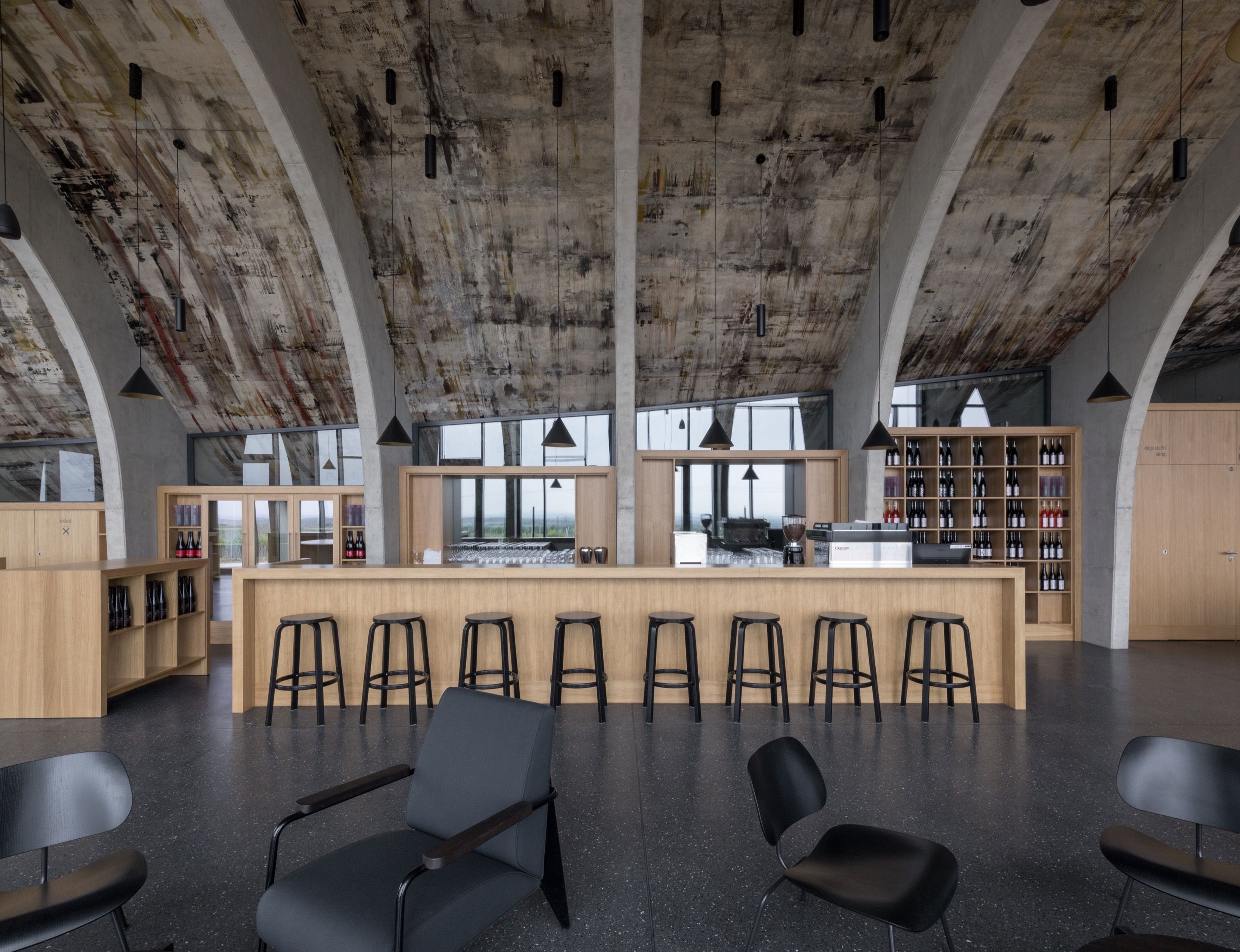 Each module rises from a vine row and runs through the space, achieving perfect visual symmetry and guiding the viewer’s gaze across the grapevines. Enclosed in a glass façade and facing south, the visitor center draws abundant light as the windows act as concealed separation from the exterior vine rows. Informed by the ambient nature, the visitor center invites visitors to fully experience its produce in the barrique cellar, made of wood, concrete and glass, and adjoining tasting room. A large-scale mural painting by Czech contemporary artist Patrik Hábl covers the entire ceiling area. Its tampered, irregular and sparse strokes, ranging from earthy reds and blacks to terroir-reminiscent browns and beiges, echo the variations of the soil and its weightlessness as it seemingly lifts from the ground, leaving its timeless markings on the walls.