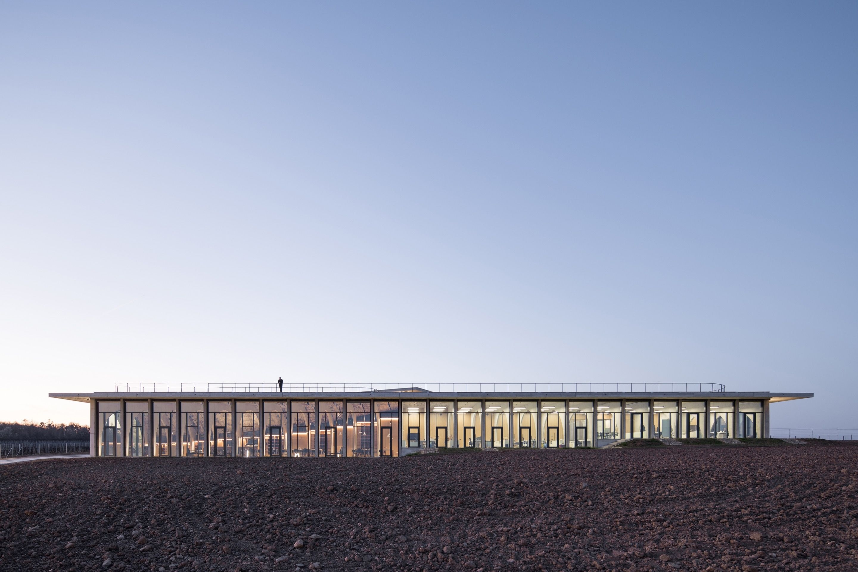 An open space emerging from the rhythmic vines, the amphitheater invests the boundless roof, overlooking a horizon nourished by its history. Expanding on the Lahofer Winery’s function from a production site into a witness to the local culture, it acts as a community space dedicated to cultural events, including local grape harvest celebrations and theater performances – a hub for its lasting community to connect with visitors of the region and wide-ranging wine connoisseurs.