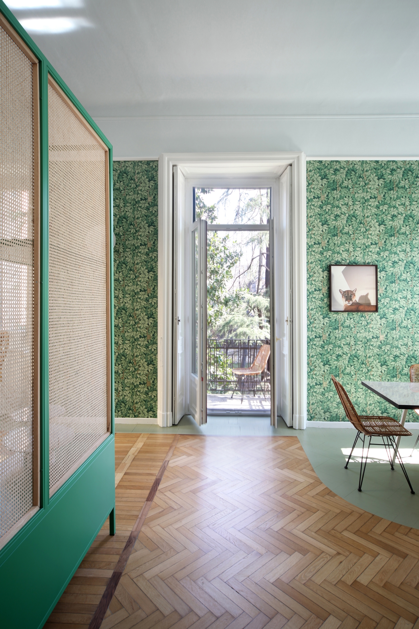 Nature bursts in, light, suggested, somewhat surreal, on the walls for the rooms, incorporating the treetops of the courtyard with designs of leaves. Materials like wicker, Vienna straw and linen that form seats, accessorized dividers, wardrobe doors, the fake marble laminate of the kitchen table, the wicker headboards of the beds, join forces to stimulate memories of spaces, perhaps experienced in a "grandmother’s house," reinterpreted here and rendered functional for contemporary needs.