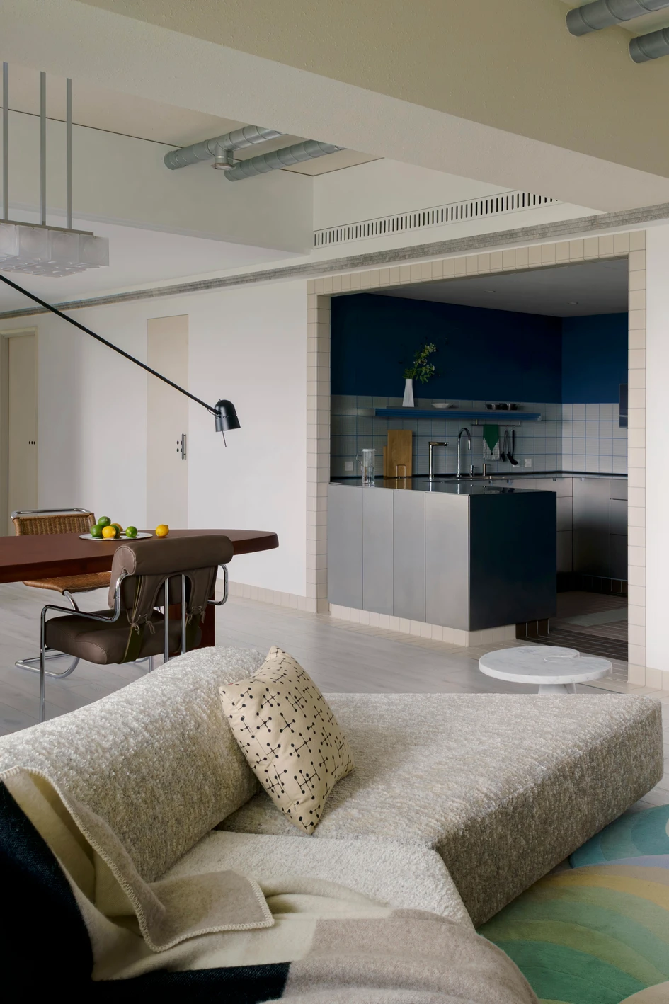 A significant portion of the space is devoted to displaying the owners' favorite furniture pieces. Because the furniture palette is so diverse, the planning was approached with great care, maintaining a "quiet, unobtrusive" backdrop. As a result, many details throughout the space have been meticulously crafted: custom air-conditioning vent panels, carefully selected door handles, concealed switches, and precisely aligned tile work all highlight the delightful interplay between the interior and its furnishings.