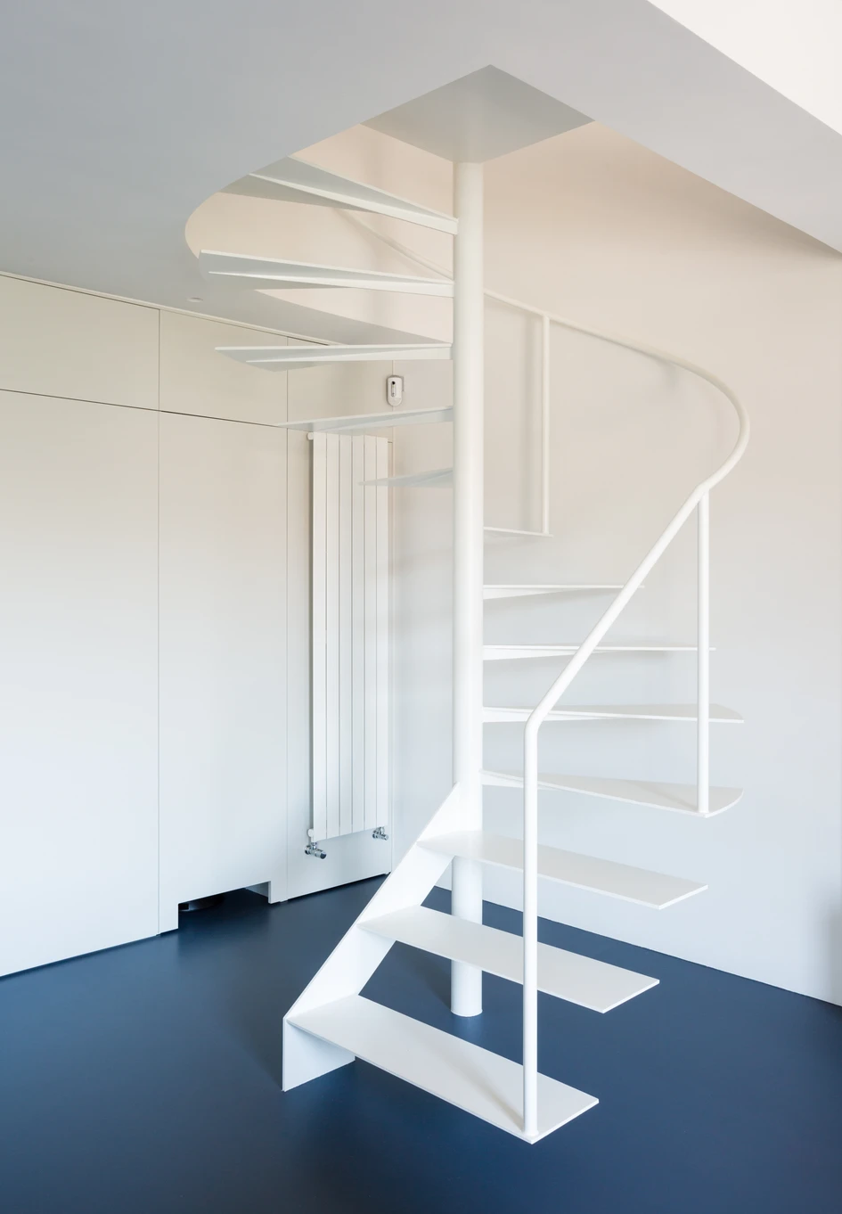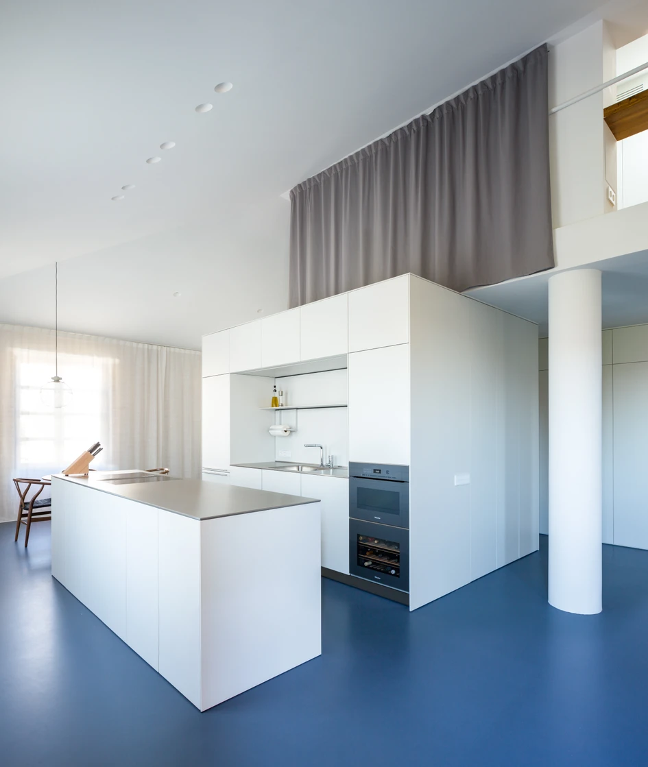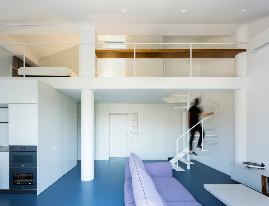 Loft 01 was designed for a single professional. Conceived as an open and flexible concept, the loft is divided in two different storeys where natural light interconnects the multiple spaces.