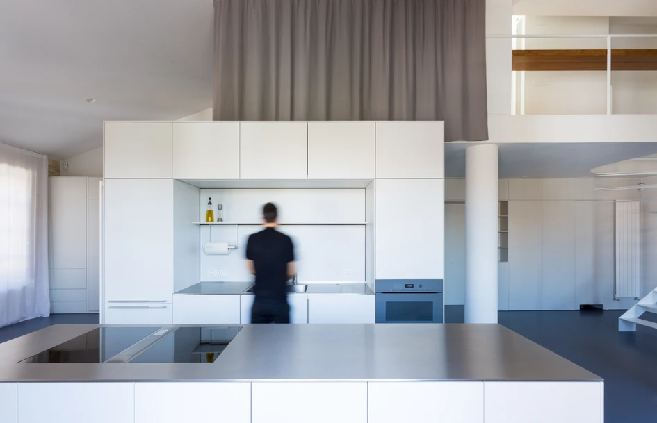 A central cube has been conceived as the core element of the design integrating all services within; including kitchen, bathroom, laundry and storage. This central cube also features an integrated folding system that enables the generation of spaces that appear and disappear responding to different needs and uses of the loft. The main access to the loft is through an architectural piece of furniture shaped as a thick wall that integrates facilities and storage inside.