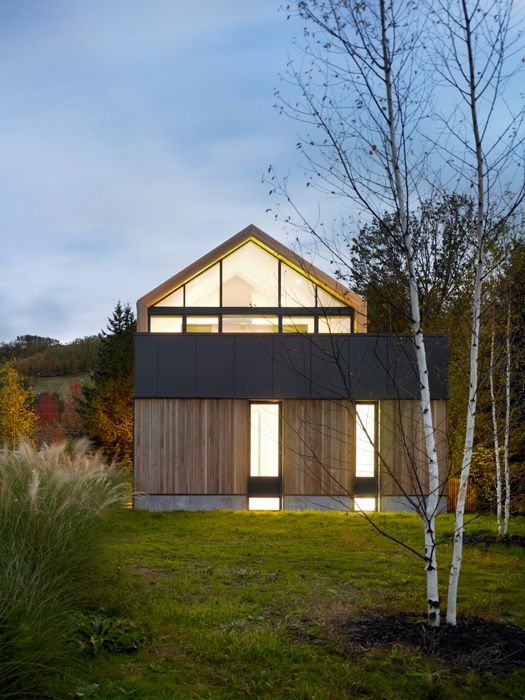 The ground floor efficiently houses bedrooms, bathrooms and a mud room while the upper floor consists of a study, kitchen, dining, living room and exterior balconies. Glazed at either end, the upper level frames a view of the adjacent ski hill on the south and an open field on the north.