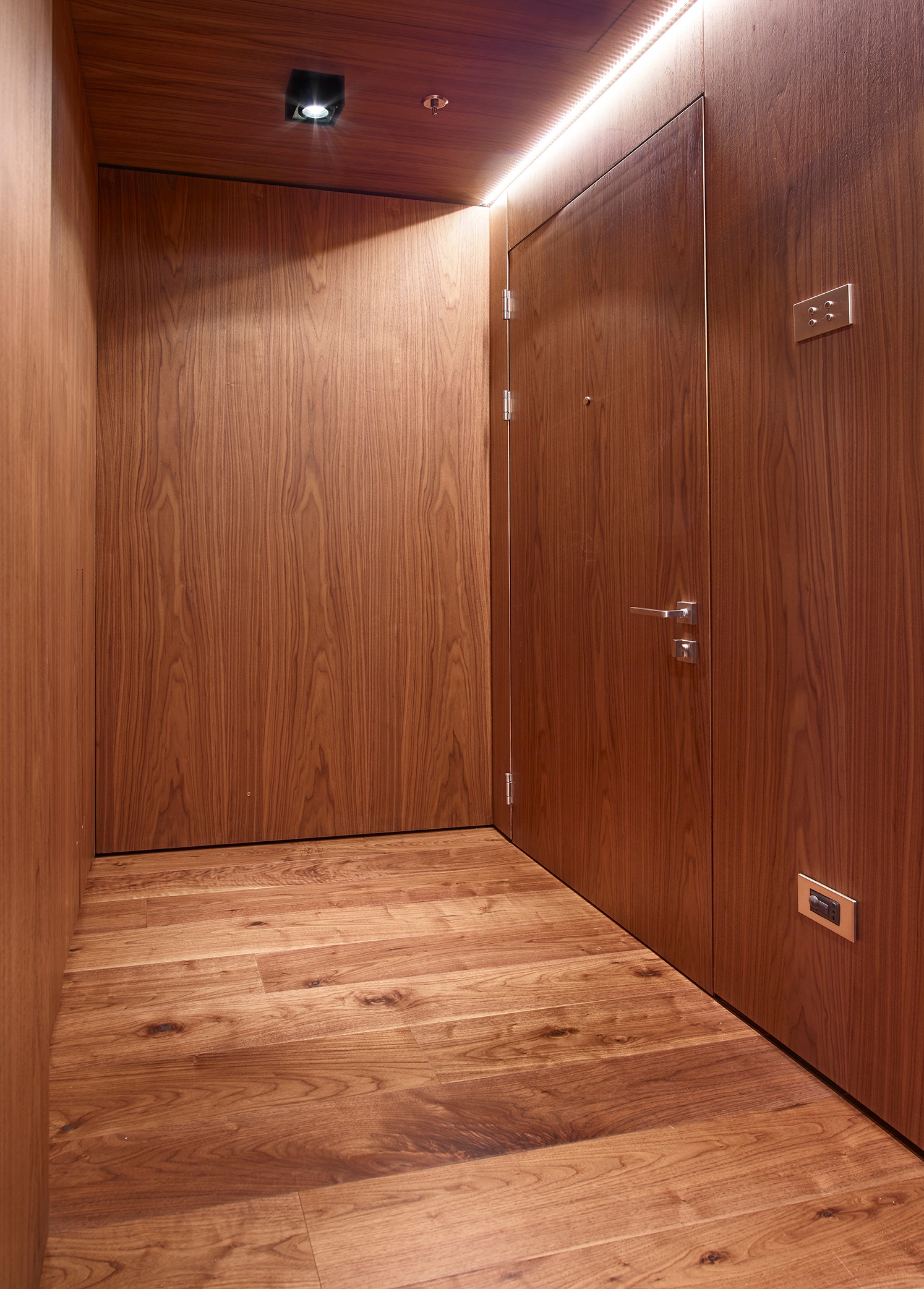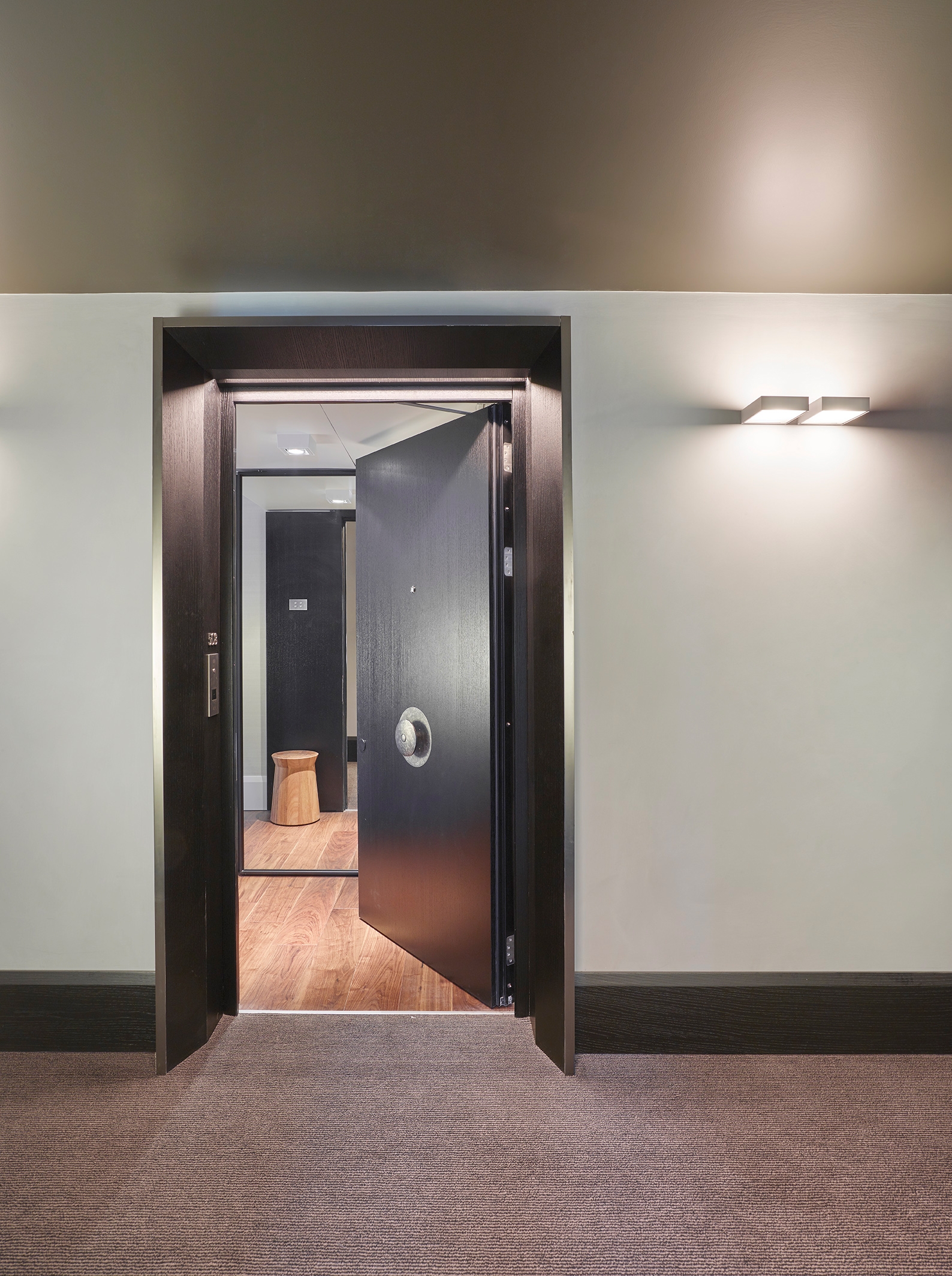 Le design neutre et rigoureux des architectes côtoie des couleurs et des matériaux hautement décoratifs, ce qui renforce le charme et la valeur historique du lieu. Réalisation : portes EI DB pour l'entrée des chambres.