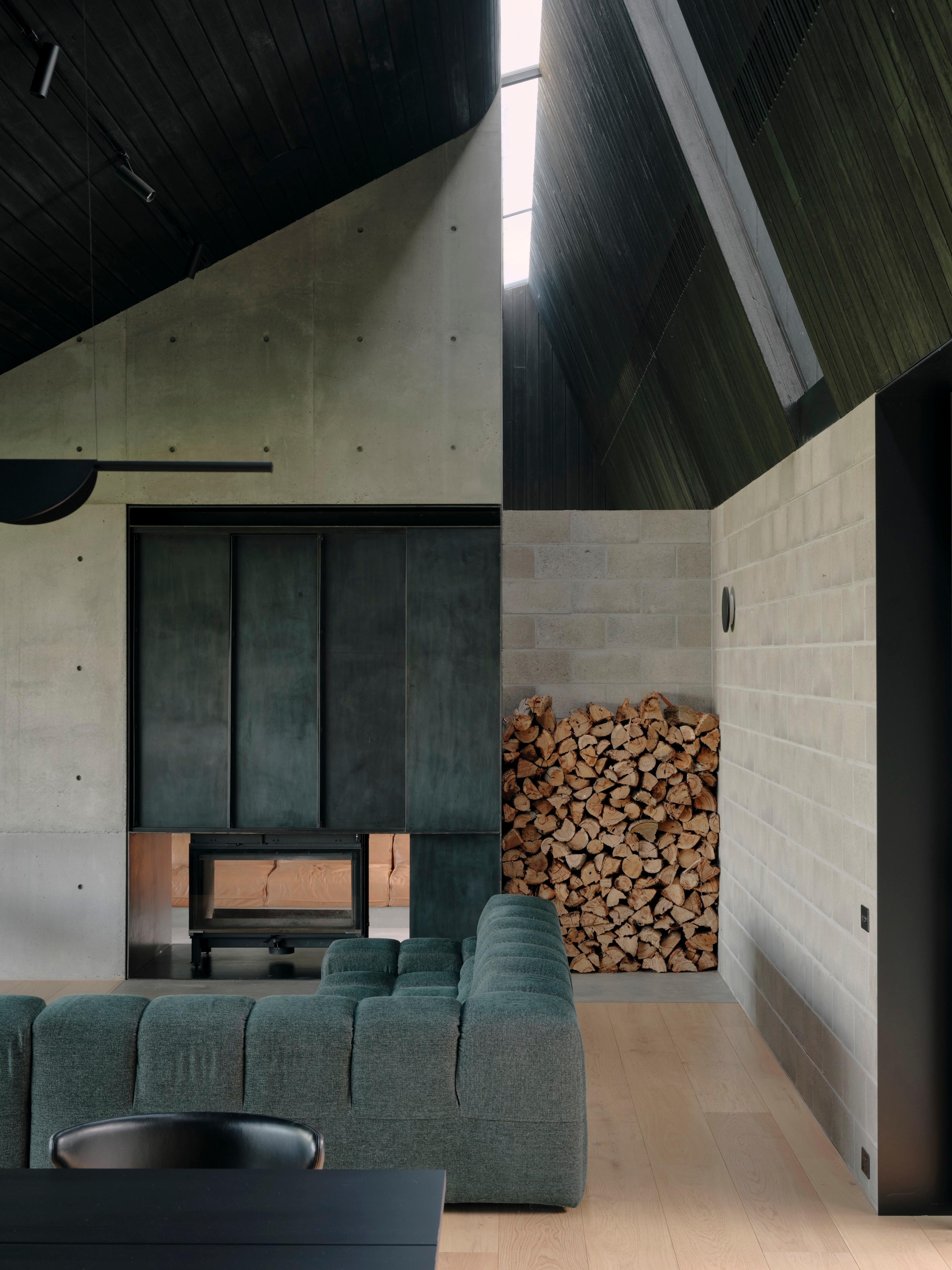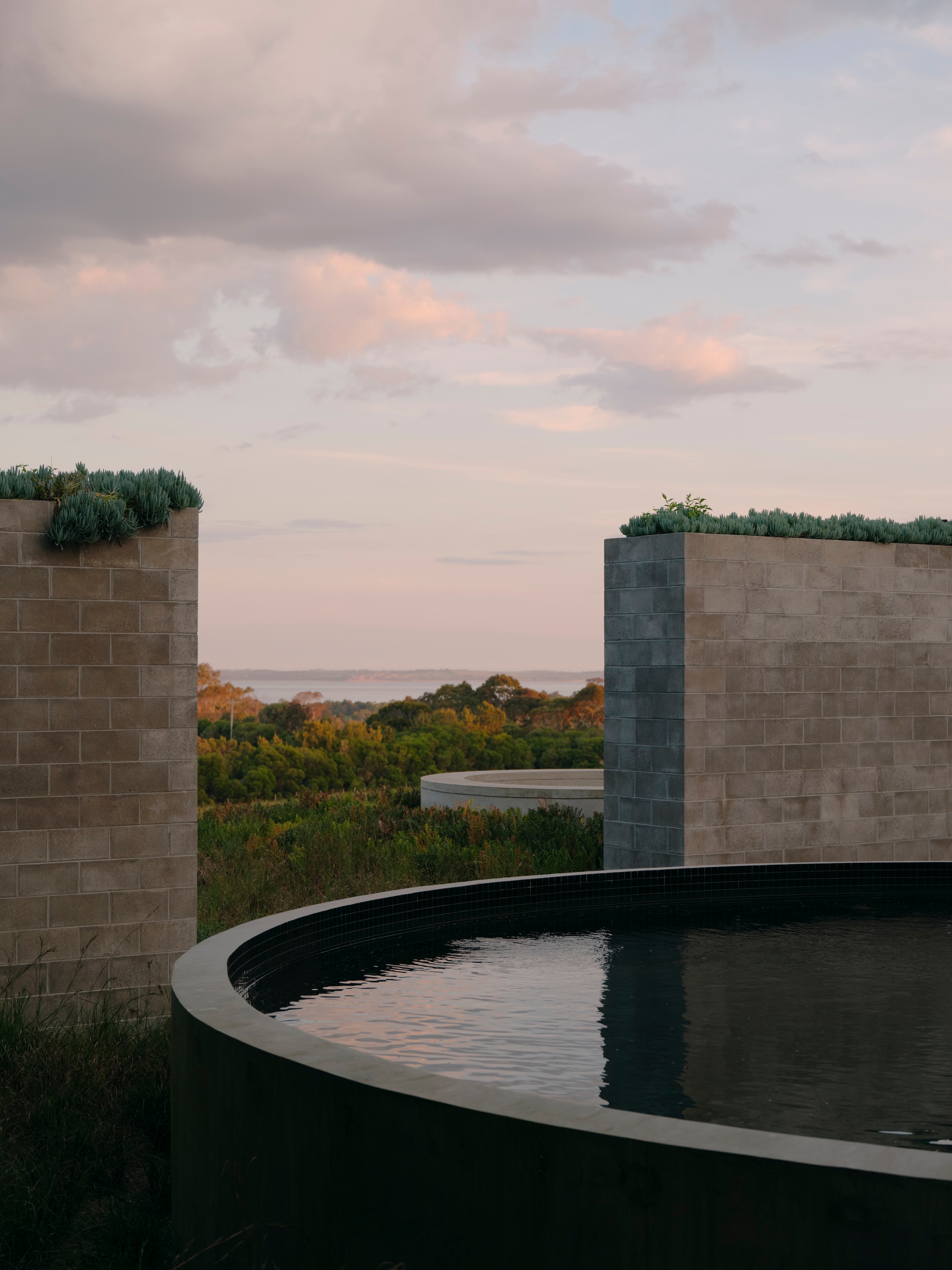 As the site has no council mains, all of the site’s domestic water is captured by the large, singular roof and stored in circular concrete water tanks. This ubiquitous item of farming infrastructure is taken through the project as a motif, and used throughout the garden spaces as birdbaths, a firepit, and a series of ponds, each becoming points of reference within the landscape.