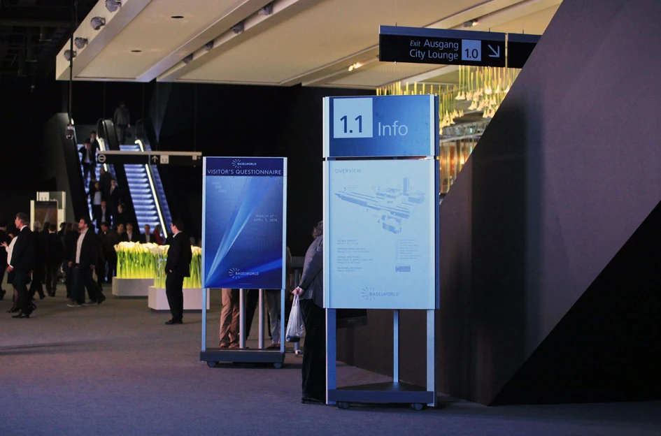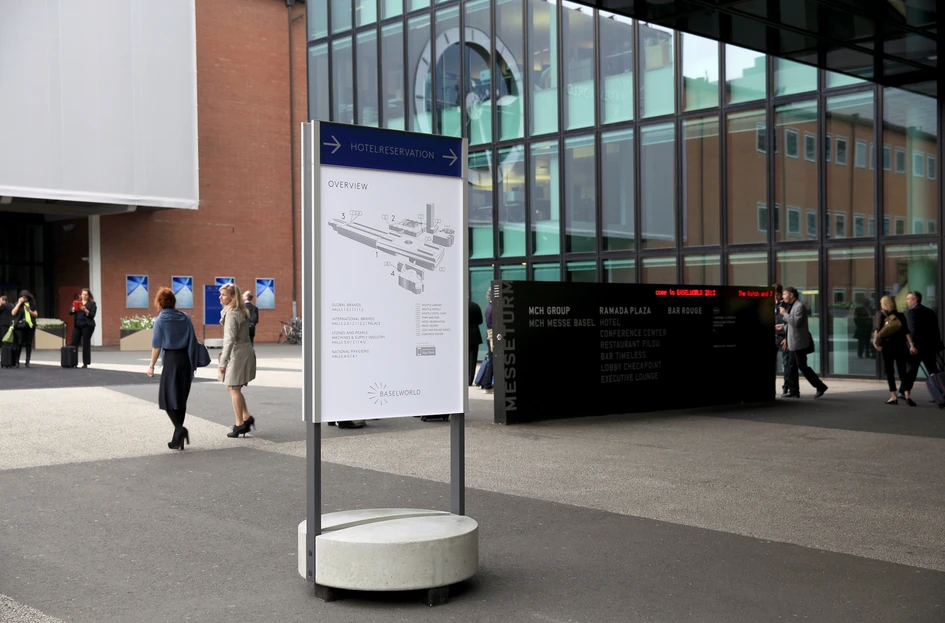The new wayfinding system covers the entire 141,000 m2 of the exhibition area. In the first phase for the opening of Baselworld 2013, a total of 1,800 individual wayfinding elements were installed. The system has already proved its reliability in the fast-paced life of the fair and is now scheduled for implementation in other areas.