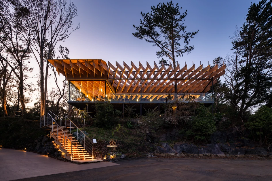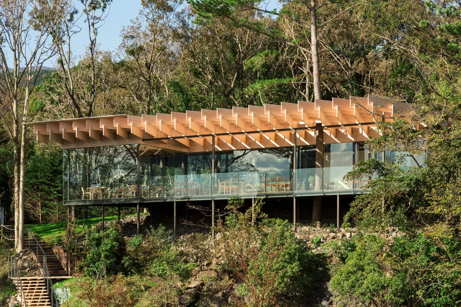 For this project, we produced a transparent kakezukuri using a hybrid wood-steel frame; supporting the roof with cypress planks spanning up to 11.4 meters. As a result, we were able to realize a cypress cloud materializing from the densely vegetated cliff.