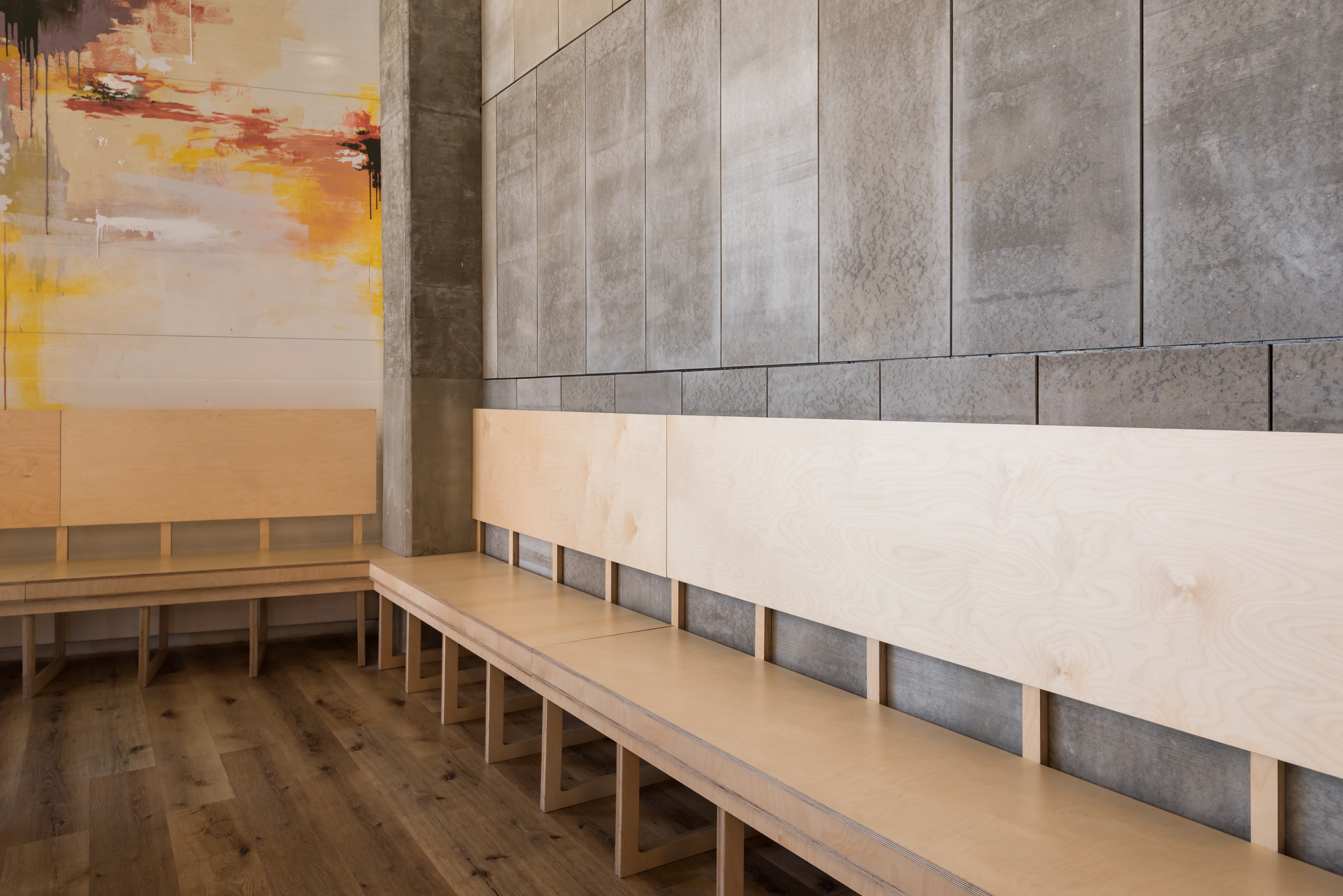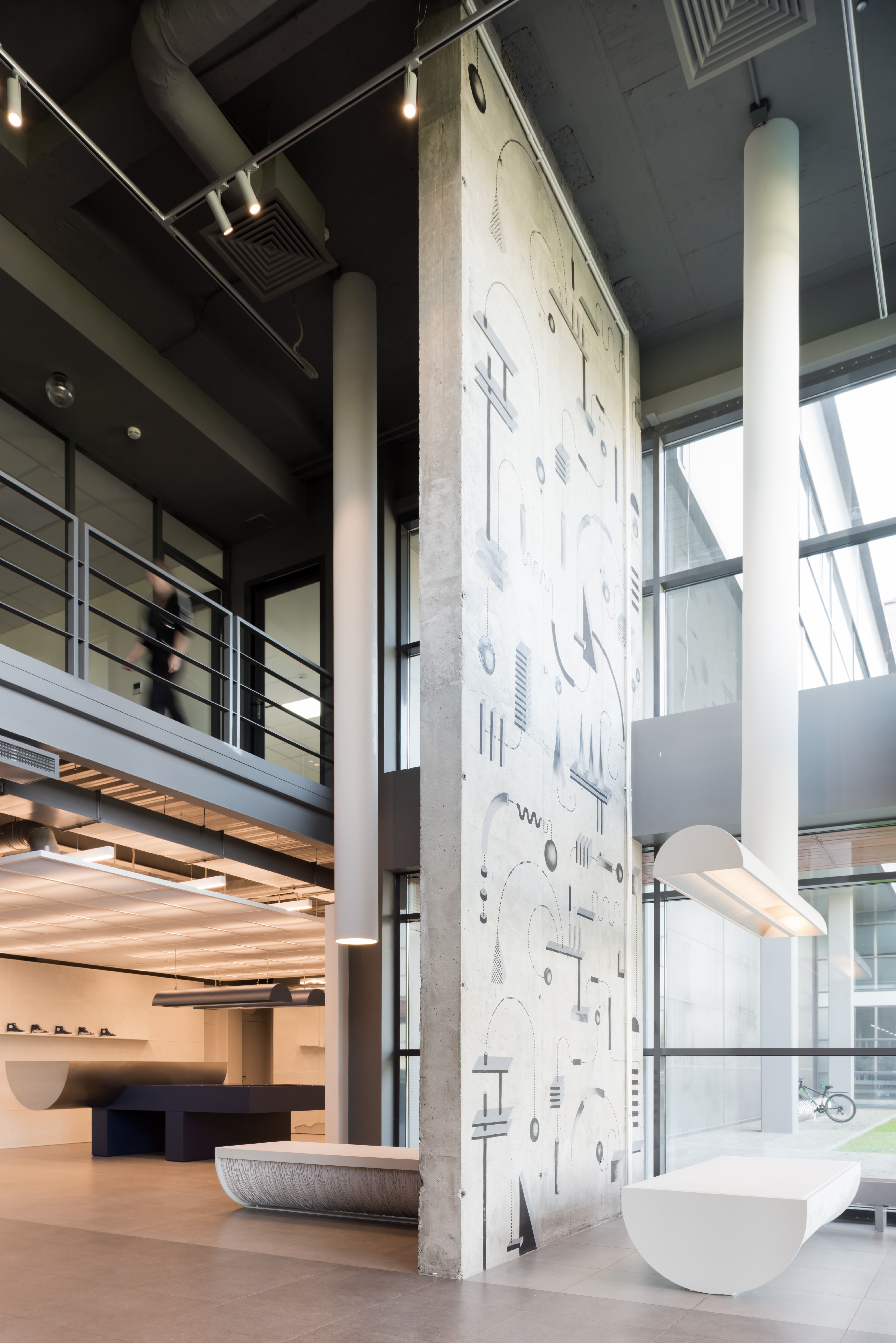 The space was previously used for the project «Brewhouse», that provided young street artists with a platform for displaying their work. As part of the new project, fragments of the artworks have been preserved on the walls. They have an influence on zoning scenarios and the design of individual elements.