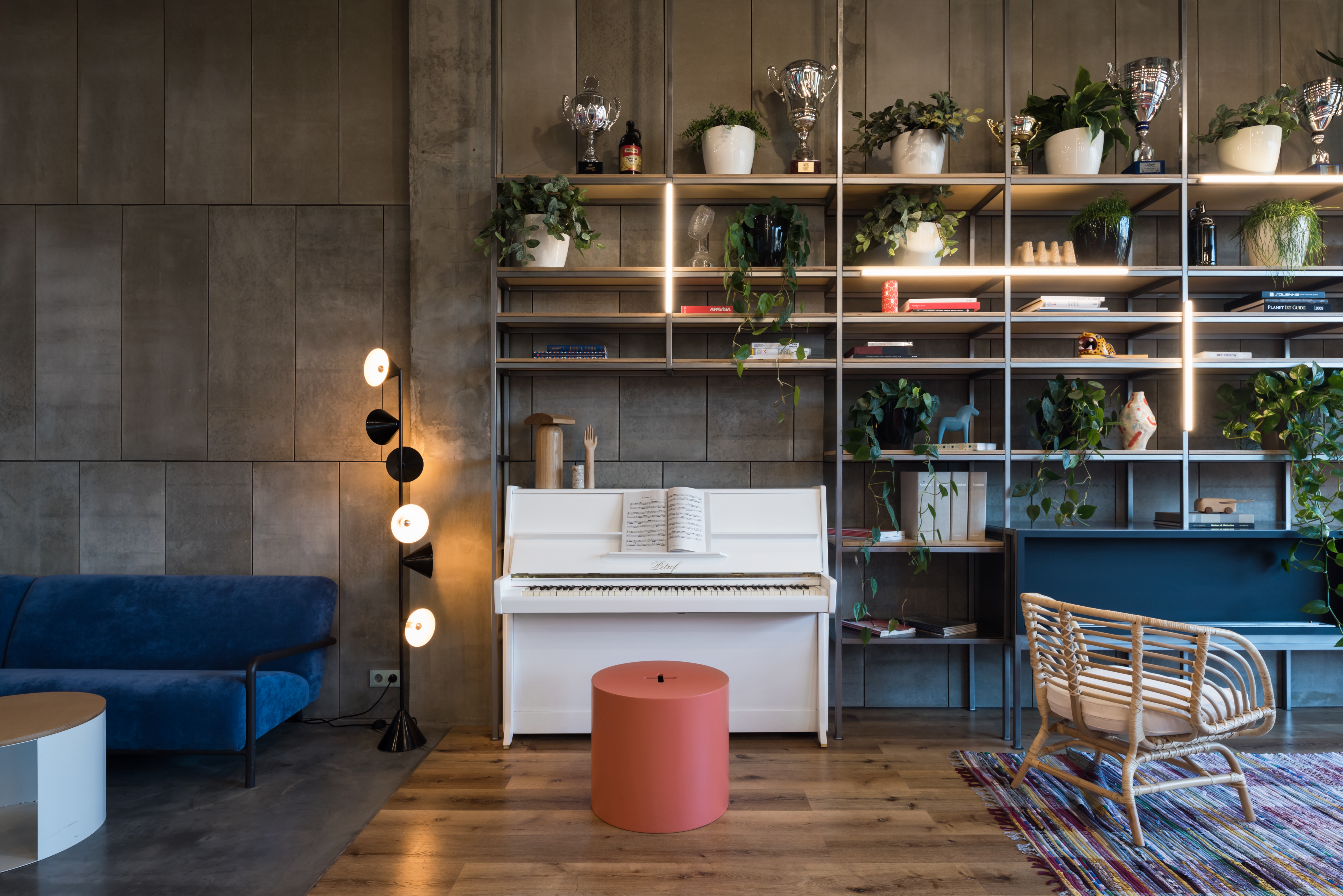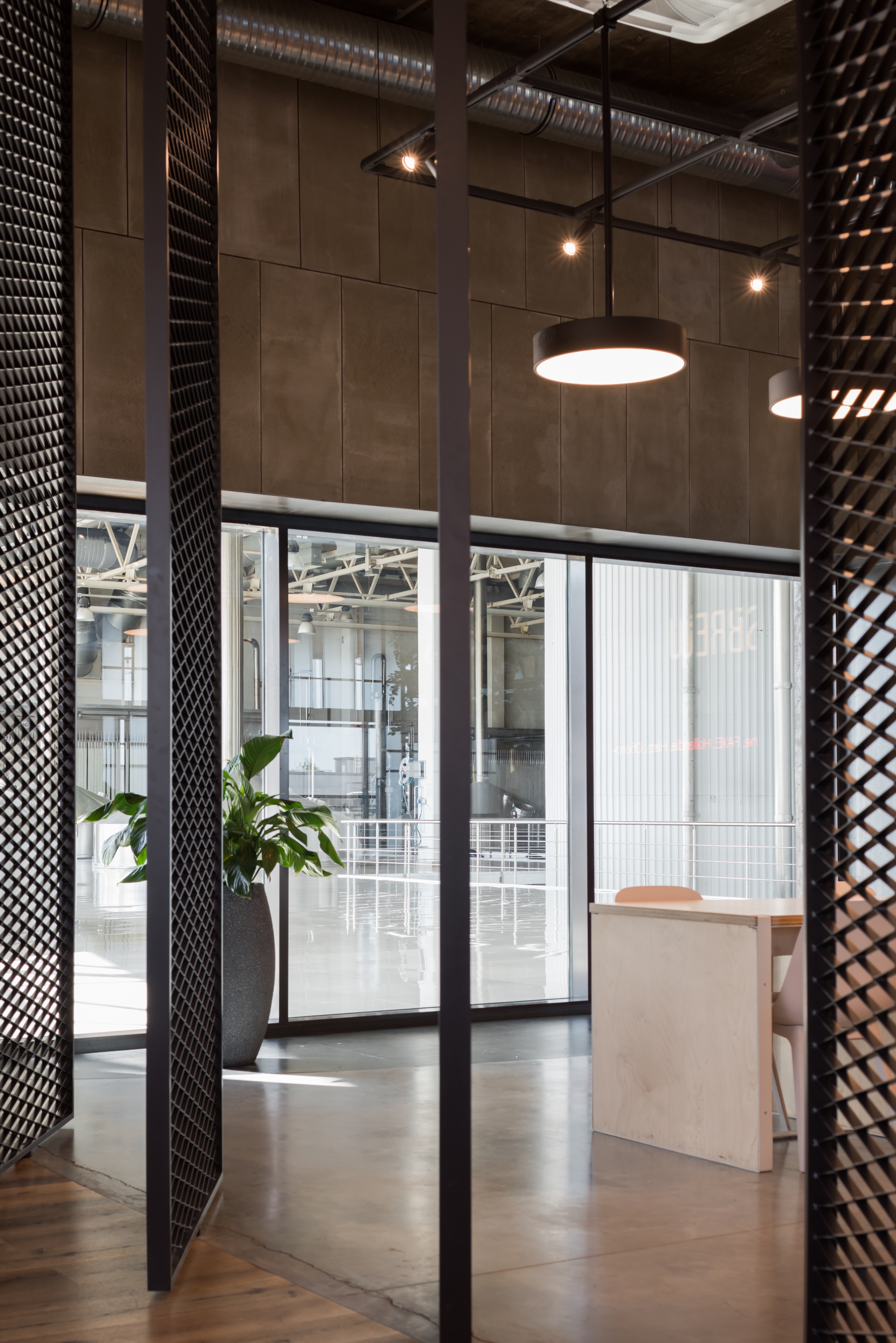 The entrance area is characterized by bold formal compositions that draw on the symbolism and aesthetics of the company. Custom designed elements echo industrial machinery; a steel tasting ‘tank’ bar stand, massive pipe–shaped lamps and benches that resemble huge wire spools.