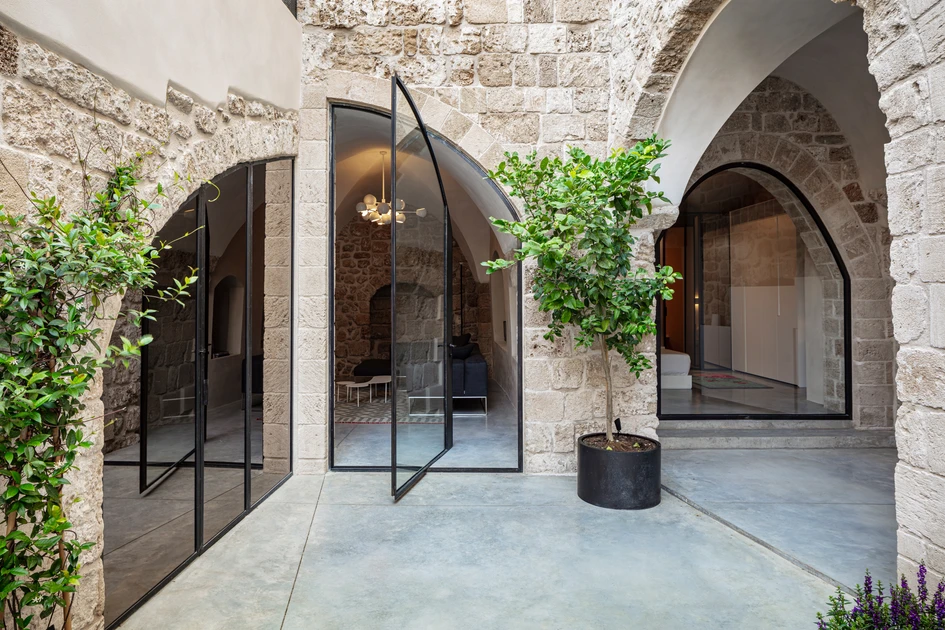 Adjacent to the side of the hill rock on the edge of ancient Jaffa Port, this apartment is a collection of 300-year-old spaces built around a central patio.