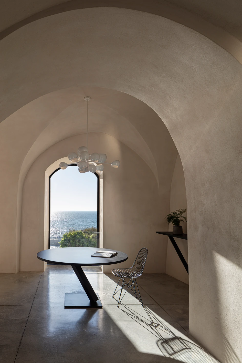 The main design gesture is expressed in a dynamic metal cladding, which "travels" along the stone walls and accompanies them, containing behind them electrical pipes, air conditioning systems, stone niche storage and more. Occasionally, the wall cladding meets a joinery element and is functionally accompanied by it as a door, bed back or railing. The interior partitions were designed in carpentry and detached from the stone vaults to create subspaces in the arched open space.