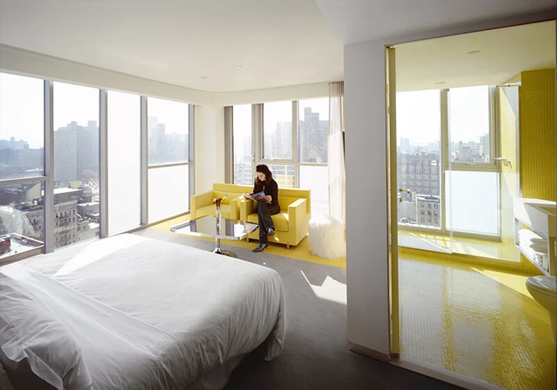 Hôtel On Rivington. Projet Grzywinski + Pons, 2005. Situé au Lower East Side de Manhattan, cet hôtel dispose de cent onze chambres réparties sur plus de vingt-deux-étages, tous vitrés et offrant une vue spectaculaire sur New York, grâce à l'emplacement exceptionnel et à la hauteur de l'édifice. Il fait naître una relation interactive entre la ville, l'édifice et les clients, l'une des qualités les plus fascinantes et intrigantes du projet. Réalisation : portes Rasomuro et mobilier (ex.. placards).
