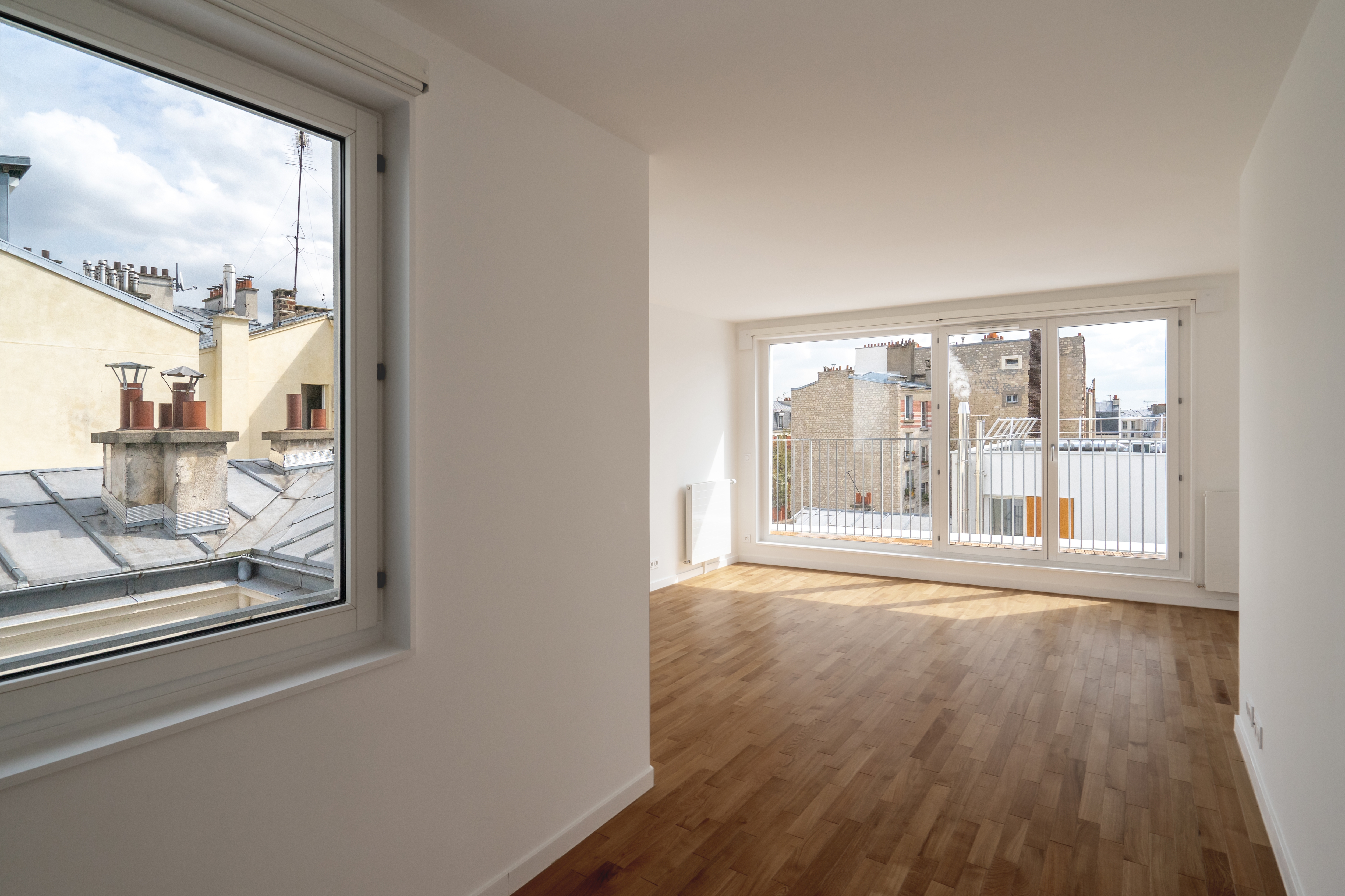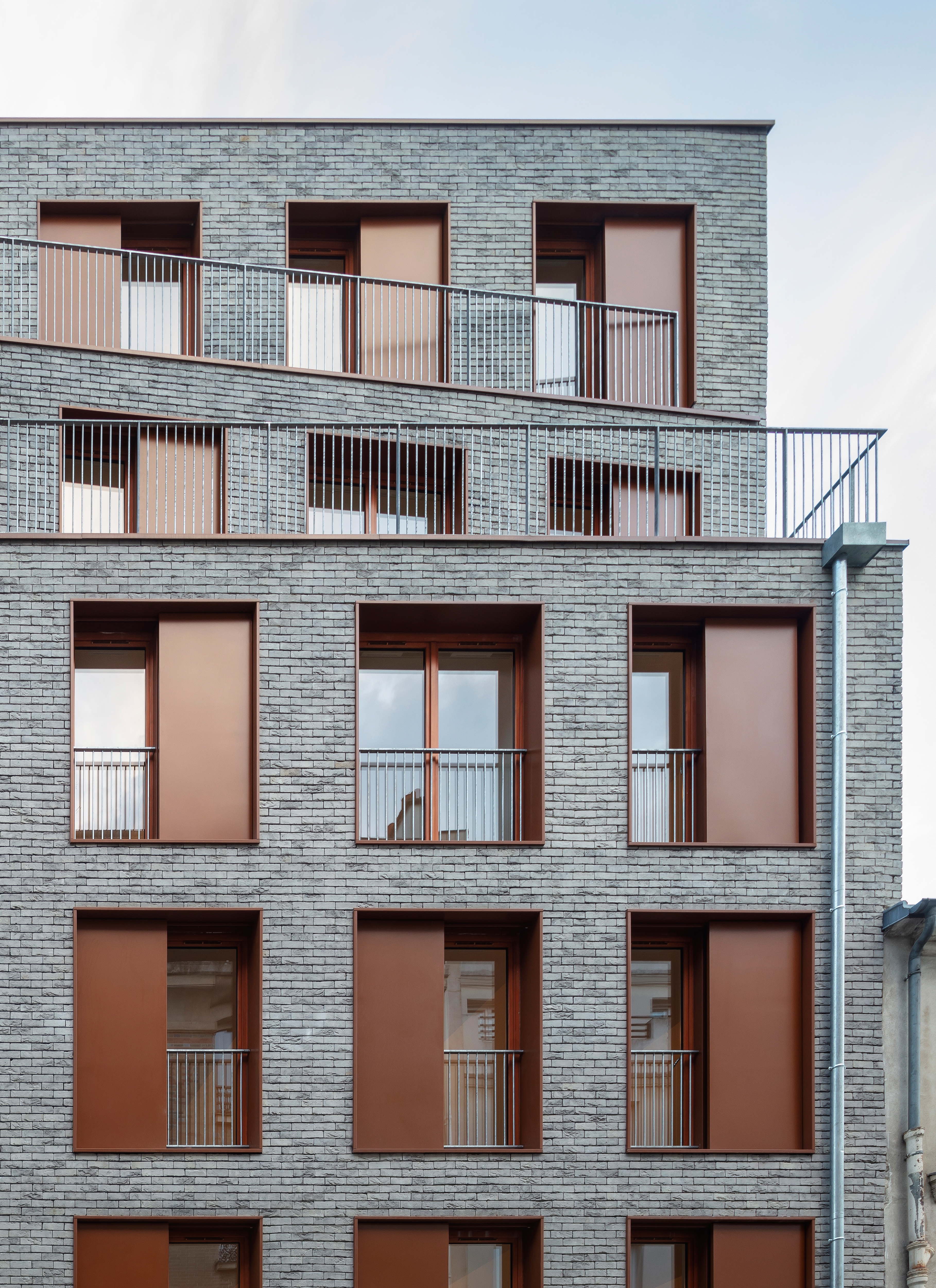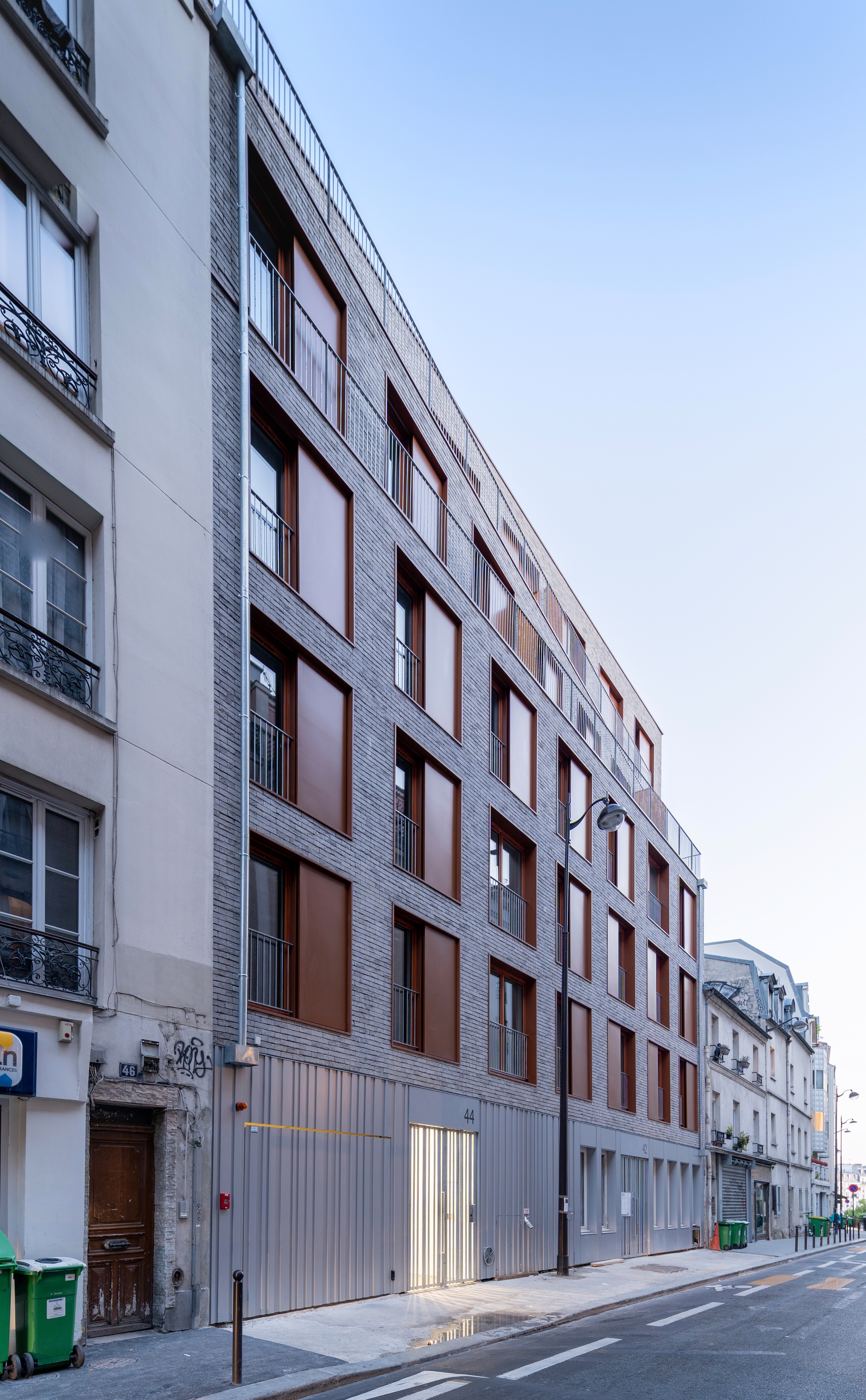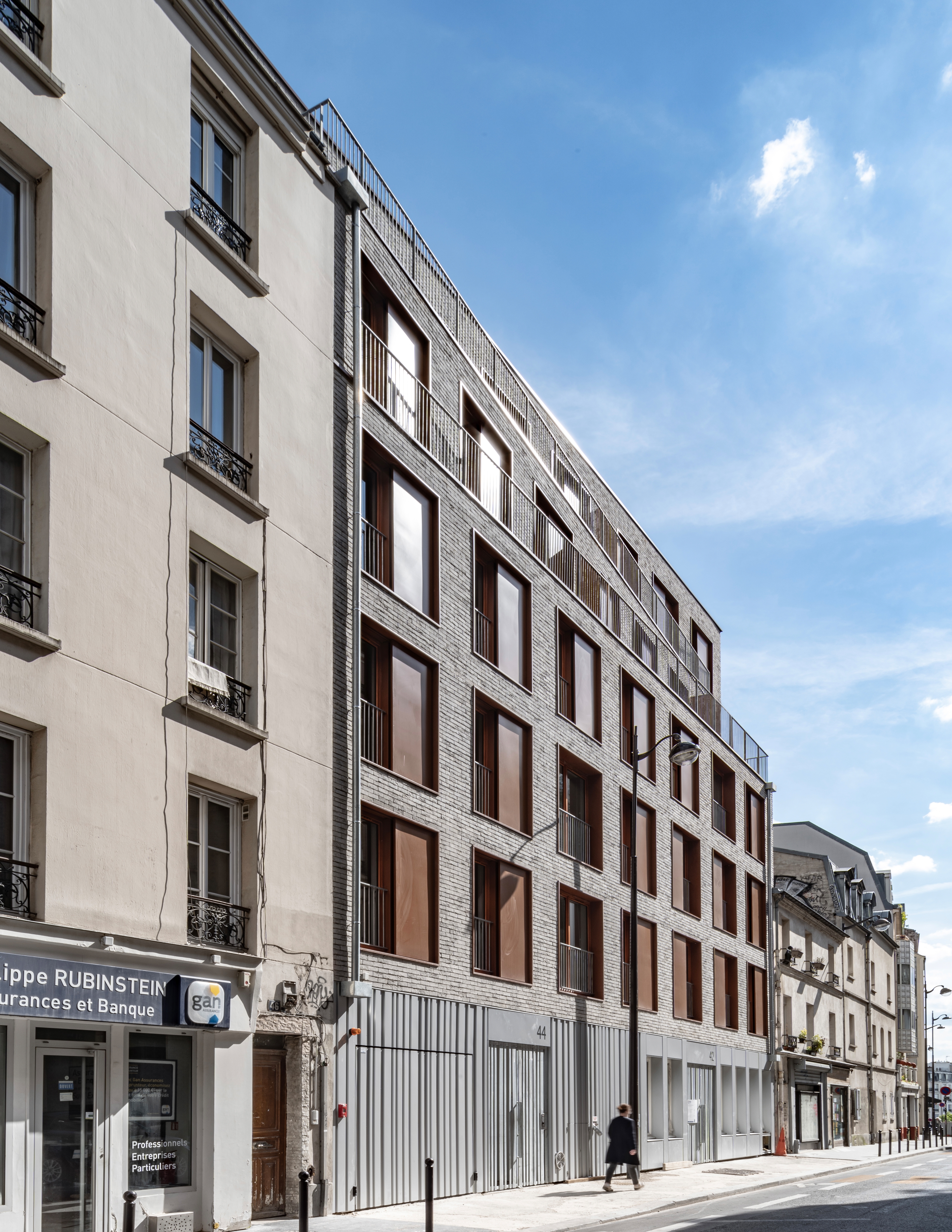 Sur la rue Orfila, les façades des bâtiments voisins sont assez classiques, tramées et avec une matérialité forte (brique). Nous avons souhaité évoquer ces principes pour proposer une façade avec des matériaux qualitatifs et durable. Celle-ci est habillée d’un parement de brique, sa trame reprend certaine ligne de composition des façades voisines.