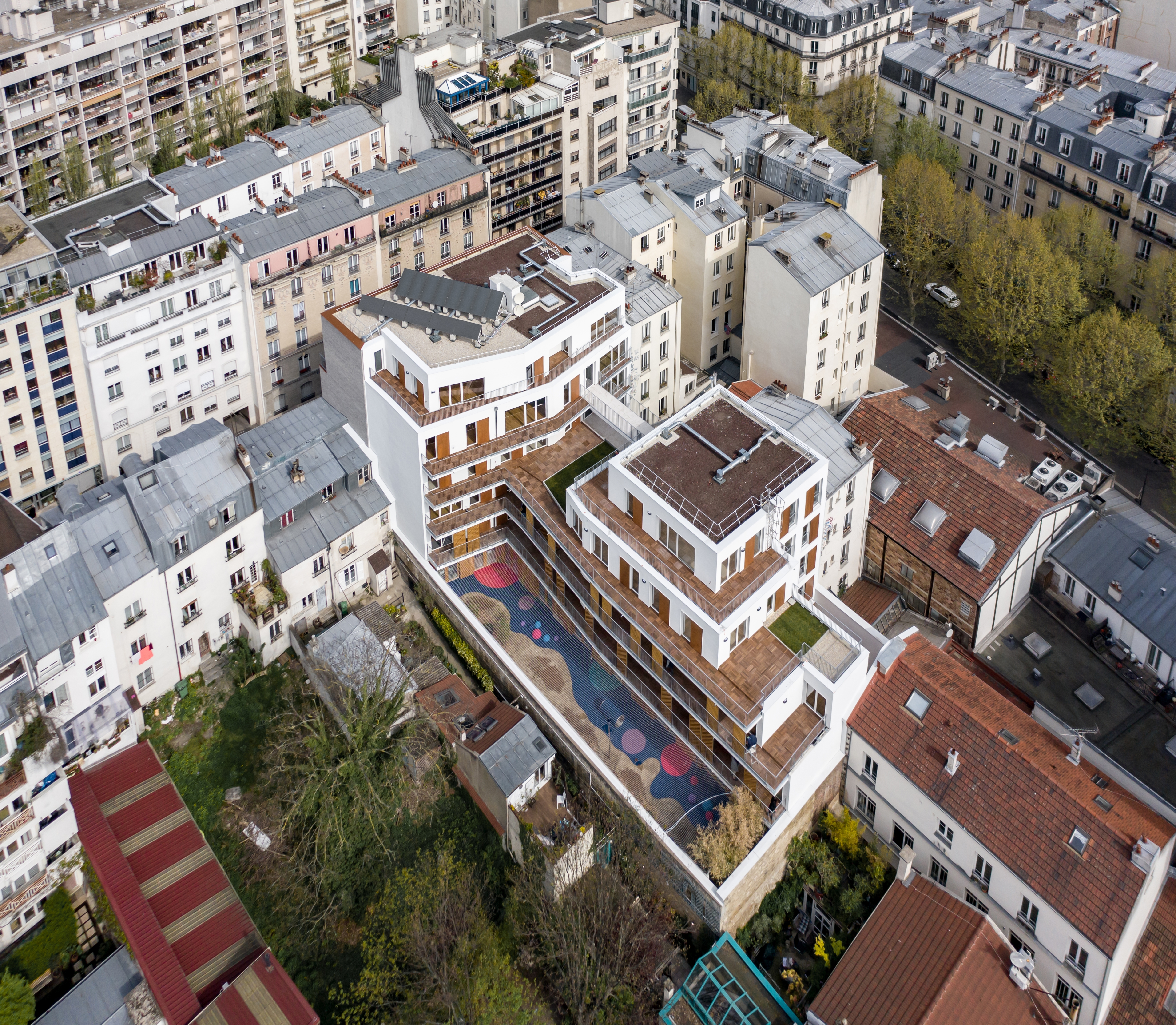 Afin d'offrir un dégagement visuel maximum, une continuité du bâti existant ainsi que de l'espace vert, les deux derniers niveaux du bâtiment s’affinent pour créer deux entités distinctes. Une attention fine a été apportée au paysage proposé en cœur d'îlot.