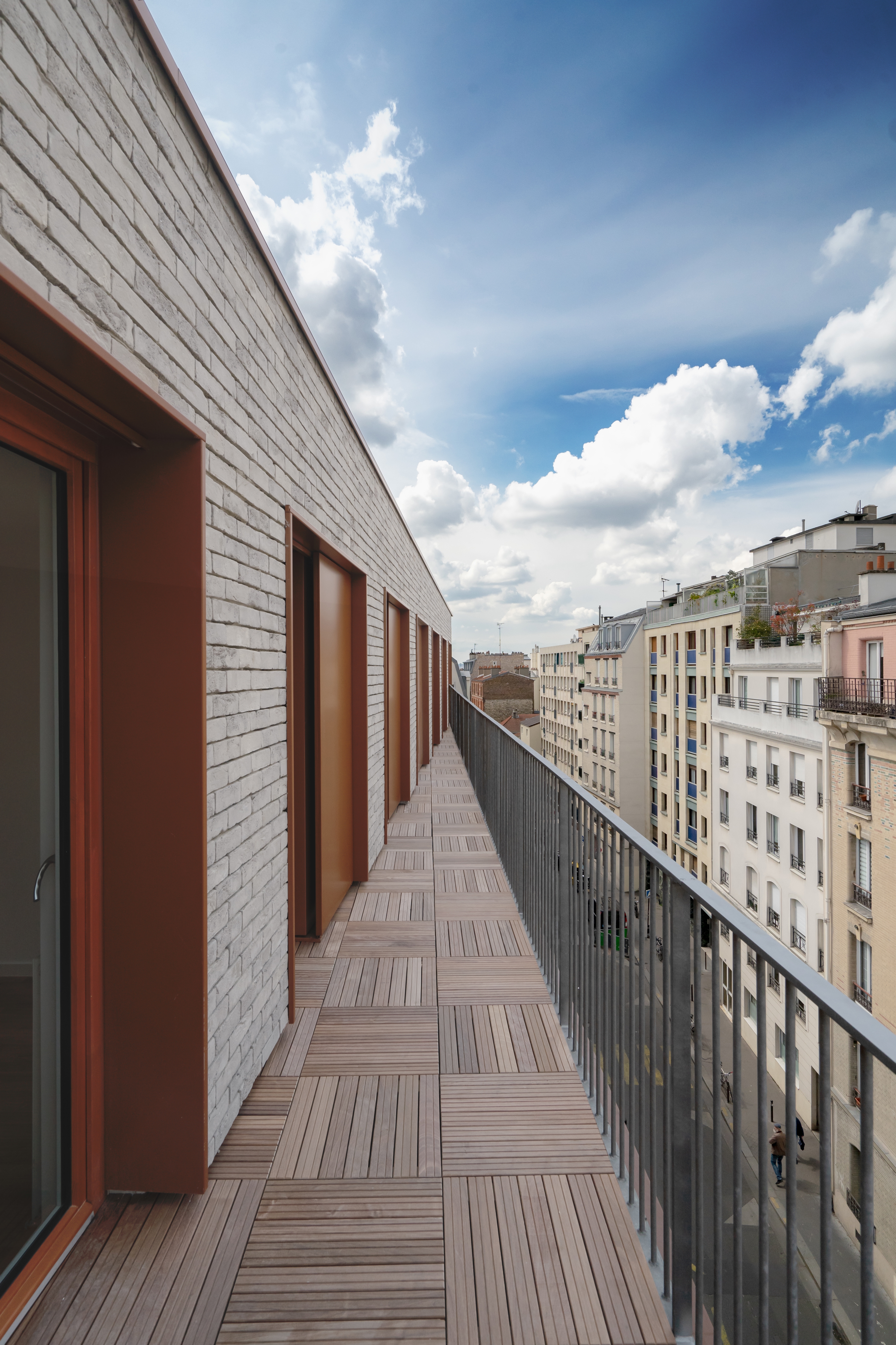 Le hall dessert l’ensemble des logements. Pour le corps de bâtiment sur rue, les logements sont desservis par une circulation centrale ventilée et éclairée naturellement. Le cœur de la parcelle est accessible par un système de coursive dans les deux premiers étages et par des passerelles dans les étages supérieurs