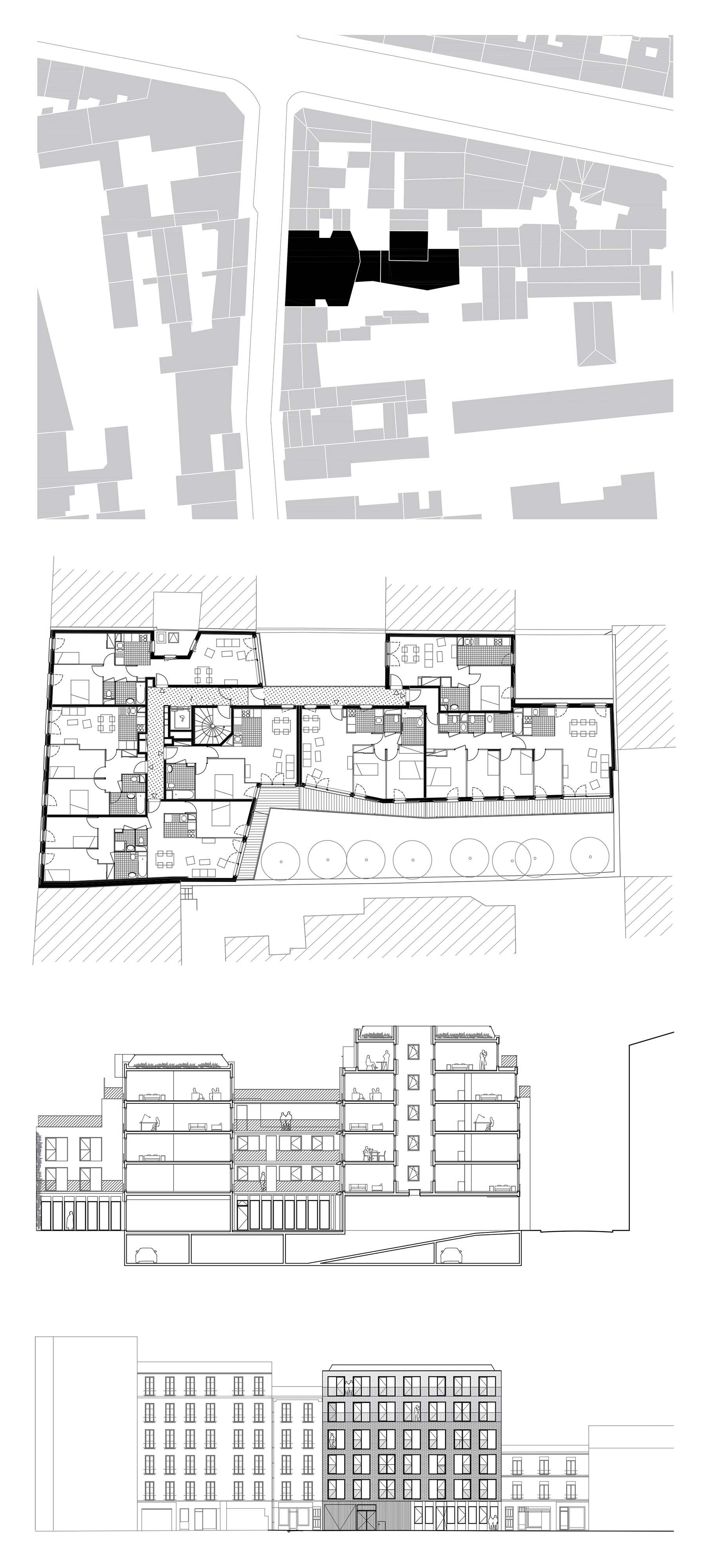 En tant qu’architecte urbain, notre projet se veut être un point dans une série faisant référence aussi bien aux masses construites, qu’aux usages qu’à la matérialité de son contexte. Le projet réinterprète le porche de la cour parisienne, le principe de contre courette (lumière et ventilation naturelle) et la découverte d’un cœur d’ilot végétal en opposition avec une façade minérale sur rue.