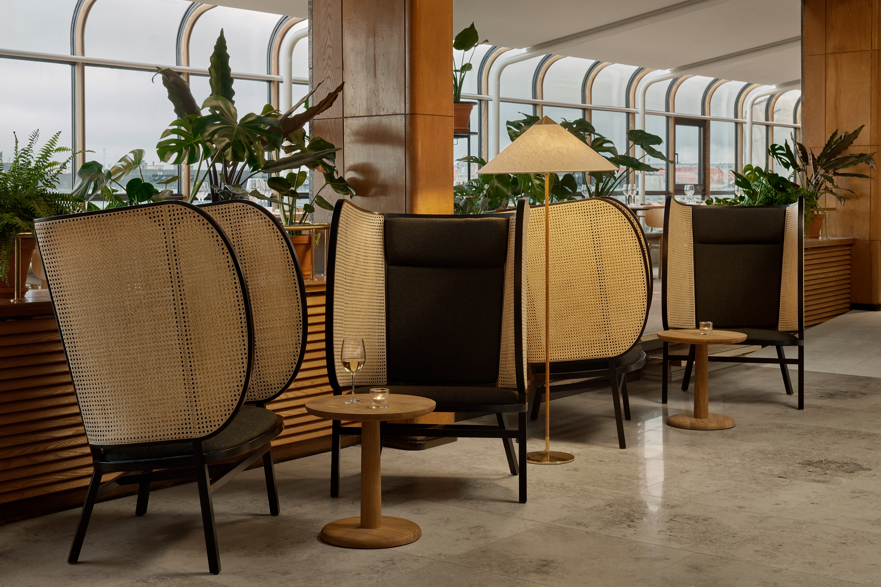 The 10th floor restaurant hall is a partially protected site with many culturally and historically valuable elements such as the original chandeliers designed by Paavo Tynell. As the key factor of the restaurant is the view over the center of Helsinki, the obstructions in front of the view were removed to open the landscape even more, and the terrace was completely renovated. The restaurant is designed to operate from morning to night by modifying the lighting and different types of furniture.