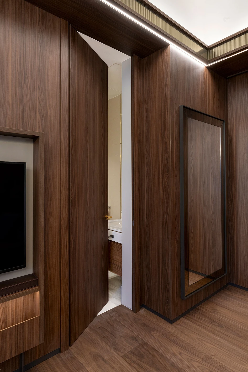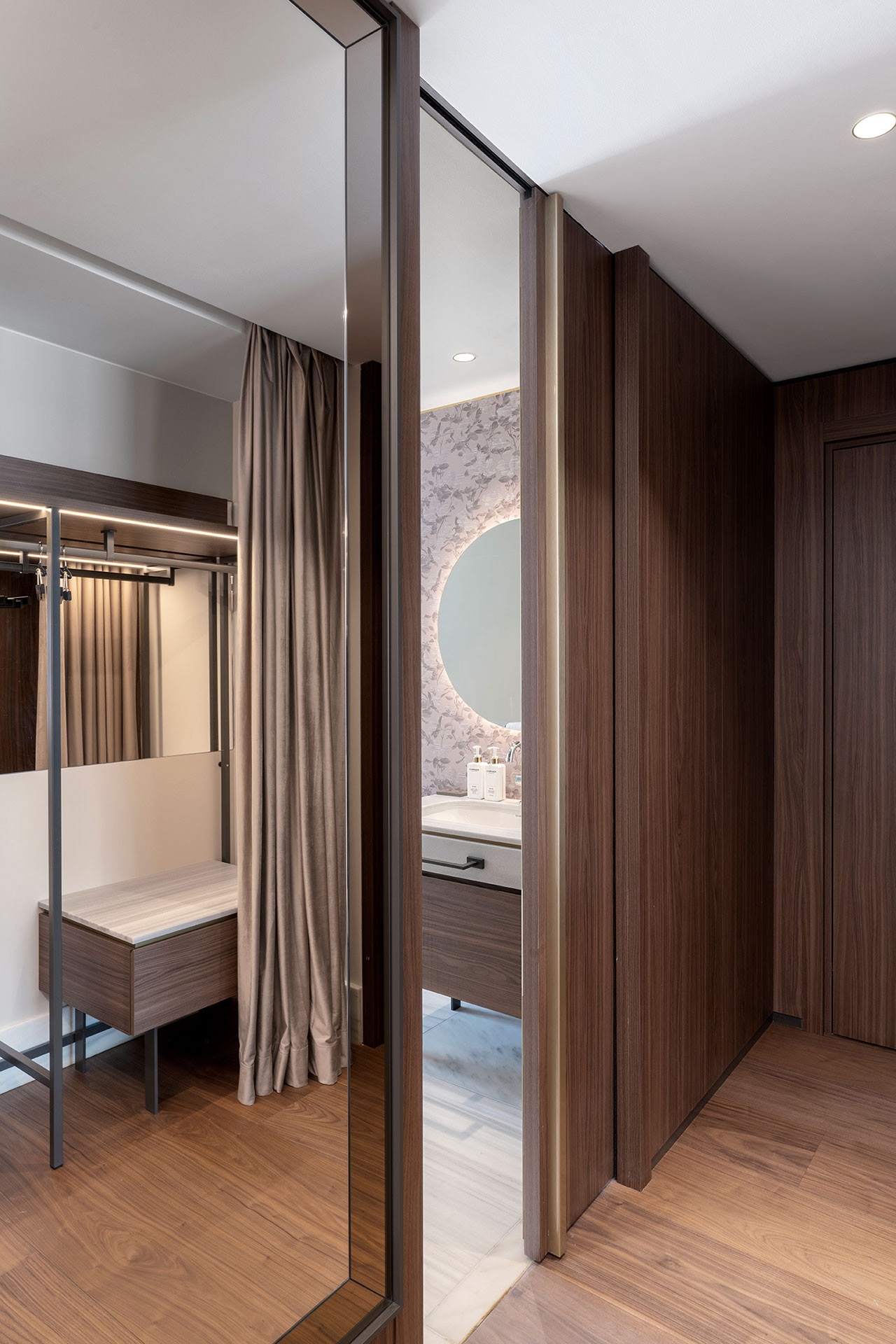Les portes d’entrée des chambres sélectionnées sont des modèles Filorei 60 dans une finition personnalisée fournie par le client, équipées de poignées en aluminium de couleur bronze. Leur design, inspiré de deux modèles emblématiques de la marque, Filo55 et Rasomuro 55s, se fond harmonieusement dans la décoration intérieure. Pour les logements individuels, le modèle Filo 55 a été choisi pour les portes des salles de bains, avec des poignées en laiton et une essence personnalisée pour les portes des chambres communicantes. Pour les espaces communs, la porte Rasoline 55s avec une finition miroir amplifie le style des sanitaires partagés du restaurant au rez-de-chaussée jusqu’au gymnase au troisième étage. Au cinquième étage, les salles de bains partagées du skybar sont enrichies d’une petite boiserie revêtue de métal bronze brossé, accompagnée de portes intégrées en essence personnalisée et de poignées couleur bronze.