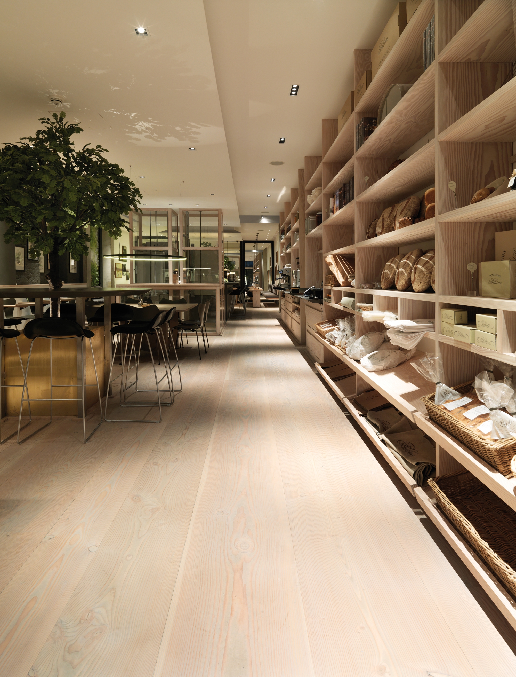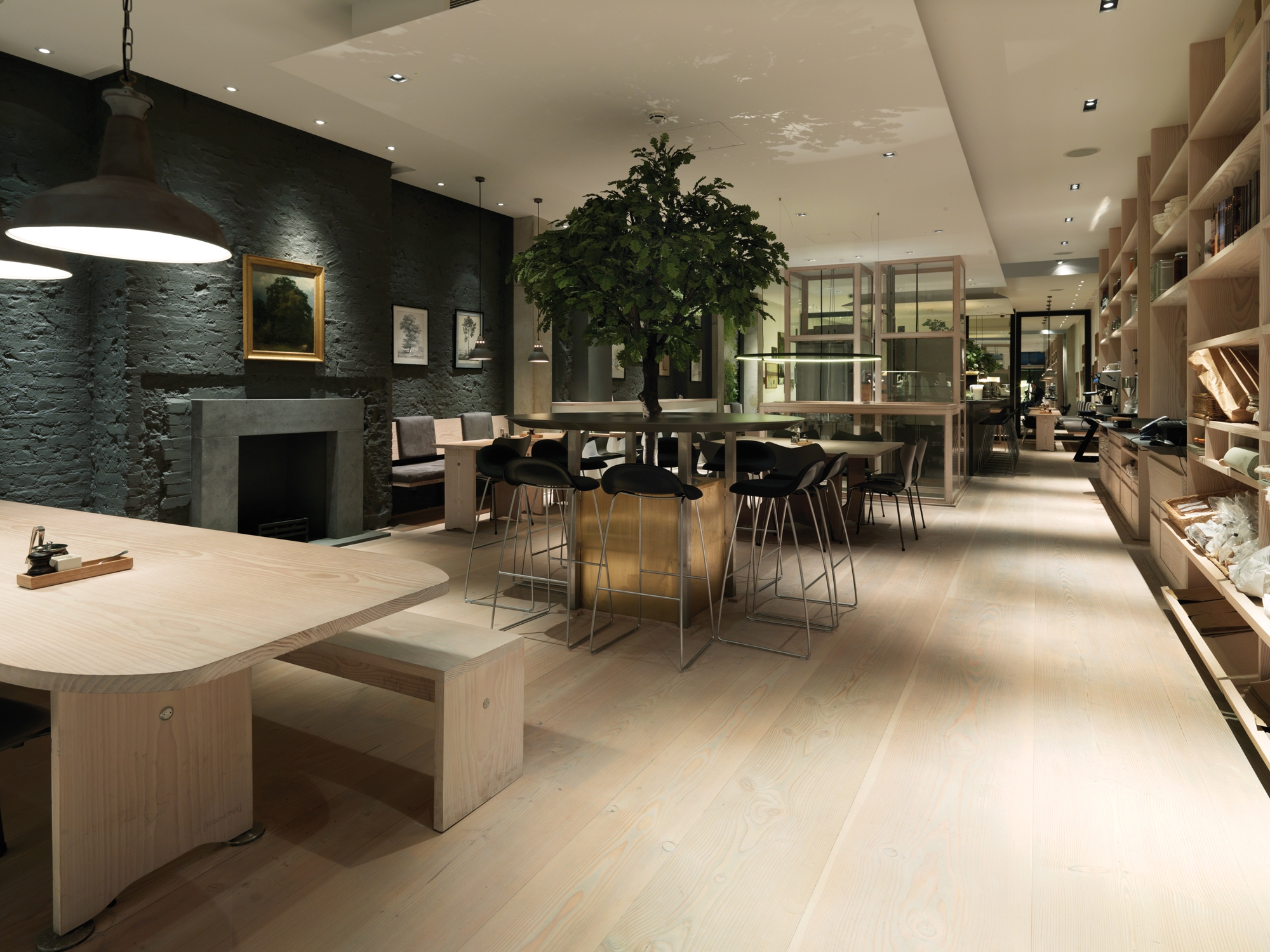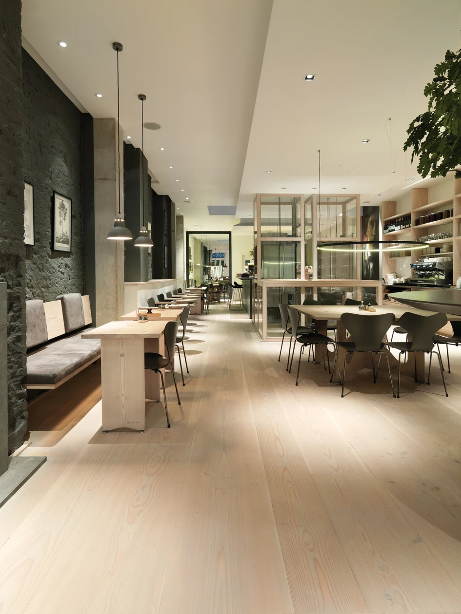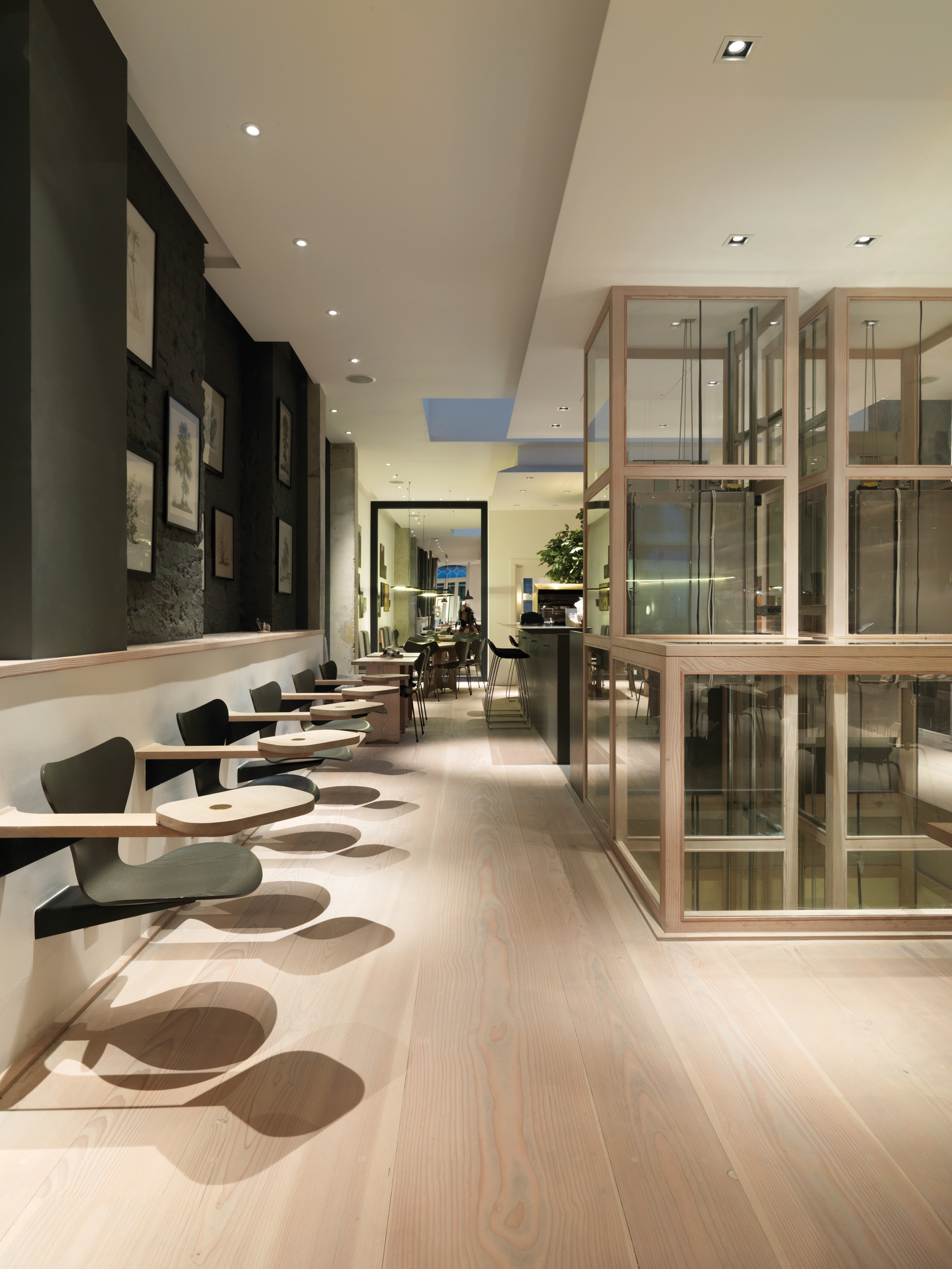 D’une grande simplicité, le restaurant se situe à Cadogan Gardens à Chelsea, à quelques pas seulement de la célèbre Saatchi Gallery. Les larges lames Douglas de Dinesen font partie intégrante du style épuré et sobre de la pièce, qui dégage une atmosphère chaleureuse. Décoration intérieure et cuisine : tout est pensé dans les moindres détails. Les délicieuses tartines et tartes sont servies sur des tables fabriquées à la main à partir de lames Dinesen Douglas et Dinesen HeartOak®.