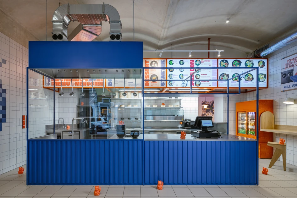 The highly contrasting combination of blue and bright red colors, intertwined throughout the interior, gives the restaurant dynamism and liveliness. These colors not only refresh the space but also emphasize the atmosphere of fast refreshments that the restaurant offers.