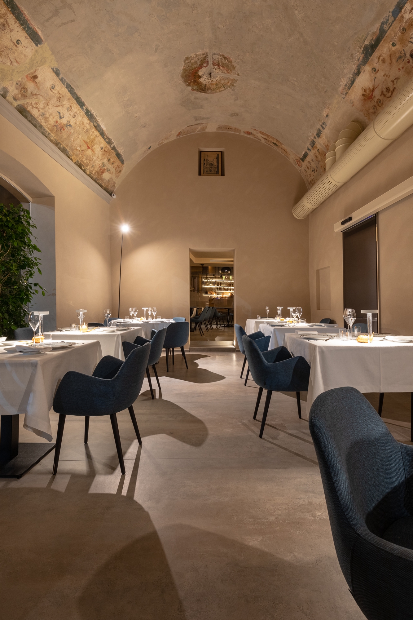Located right next to the Cathedral of Modena, the Gusto Premiere restaurant is part of an historic building. The interior spaces – elegant and light – have been enriched with fine decorations. The Storie collection by CEDIT has been used for the floor in the large formats 120x240cm and is perfectly combined with the fresco vault. The Flowtech range by Floor Gres, inspired by metal, covers the counter with the Aged Bronze color.