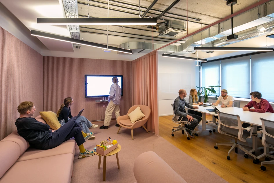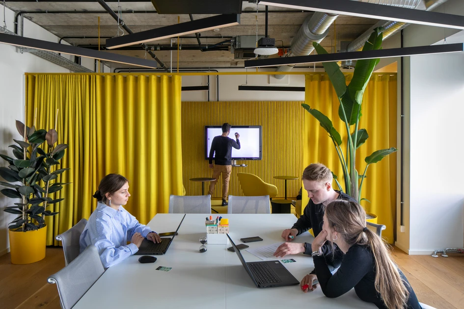 MVRDV’s interior design primarily occupies the ground floor and basement levels, as well as additional prime spaces up to the sixth floor. It comprises three “on-site” rooms, which serve as the primary meeting rooms, as well as a variety of “experience rooms” which enable company gatherings, more casual work environments, and other, more specific atmospheres. Wherever possible, the design takes the sustainable approach of re-using elements from the previous half-built renovation, making use of everything from wall and floor finishes to lighting fixtures and furniture. For example, 100% of the lighting fixtures were purchased prior to MVRDV's design.