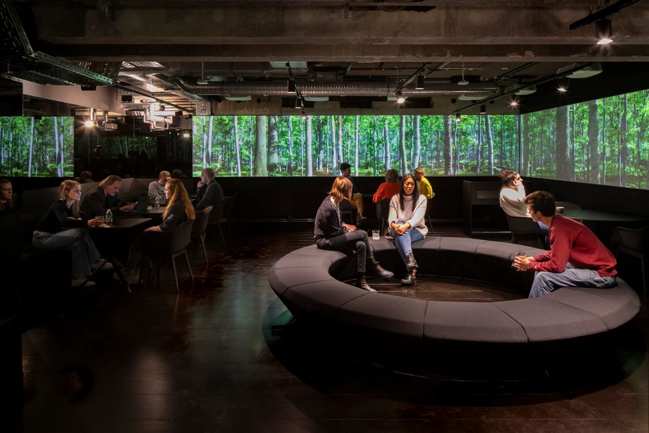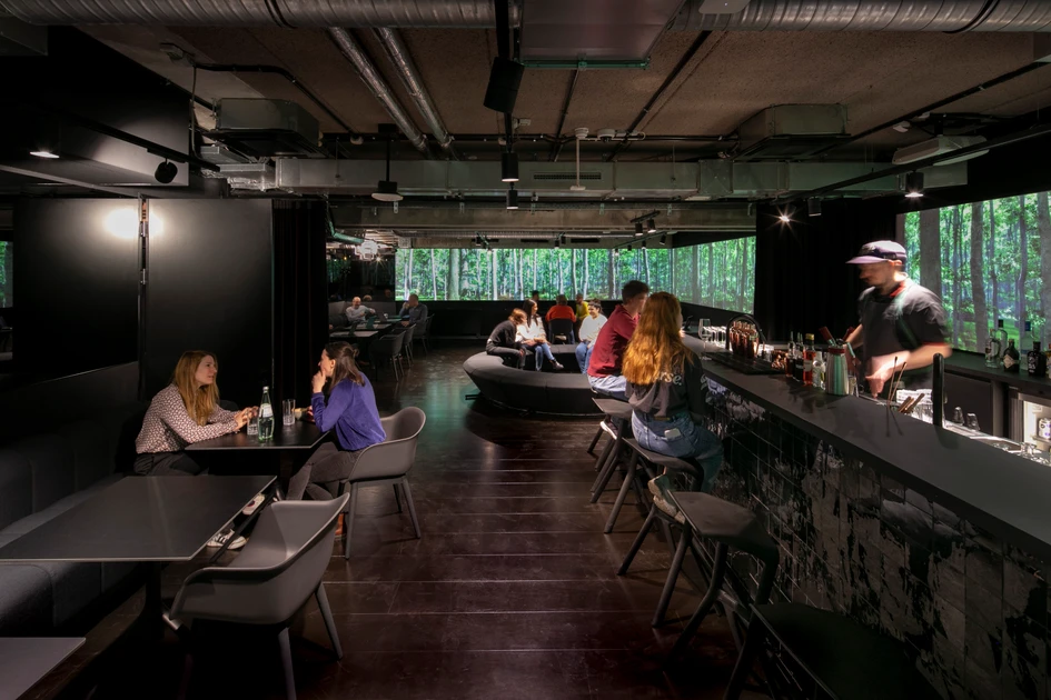 The experience rooms include a Volkspark and Baumgarten, used for lunches and for company gatherings, which are filled with plants provided by Berlin-based company Plantclub. Downstairs is the club, referencing Berlin’s famous nightlife, which provides a space for events or for casual socializing surrounded by a continuous screen on the walls. Also found downstairs is the “secret room”, a more private meeting space with a clandestine atmosphere – perfect for breaking out of the day-to-day mindset in more high-stakes work projects.