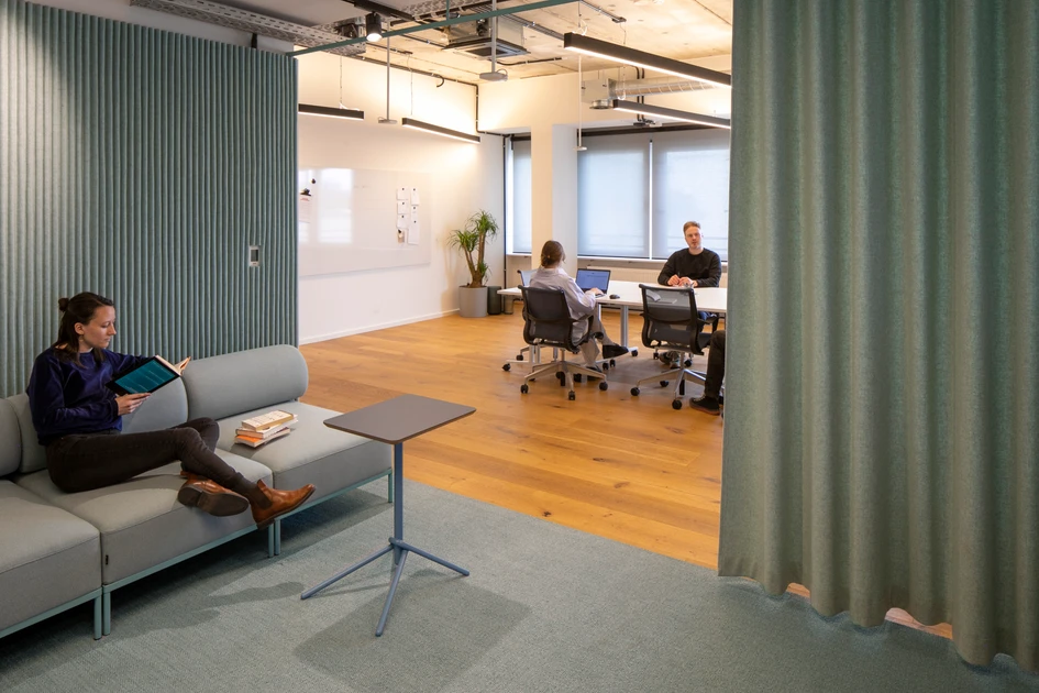 In addition to the typical conference table, each of the on-site rooms is embellished with a “color lounge”, an adjacent space separated by a curtain that provides a more comfortable environment for free-flowing discussions. The colors of these lounges – like the colors throughout the design – are based on the visual identity of Shopify.