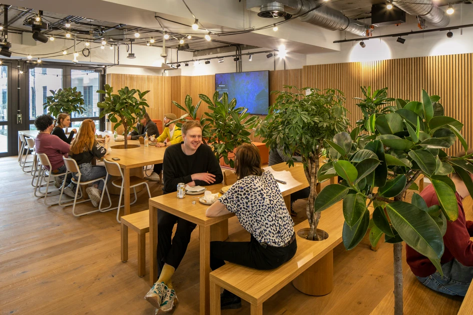 The project celebrates not only Shopify culture but also the Berlin cityscape, providing a visual reminder of the things that make the city an exciting place to live and work. The reception desk makes use of blue-green “metro tiles” in reference to the city’s U-Bahn stations, while the opposite wall features the art piece Intersections by Carolina Amaya, recalling the city’s vibrant street art.