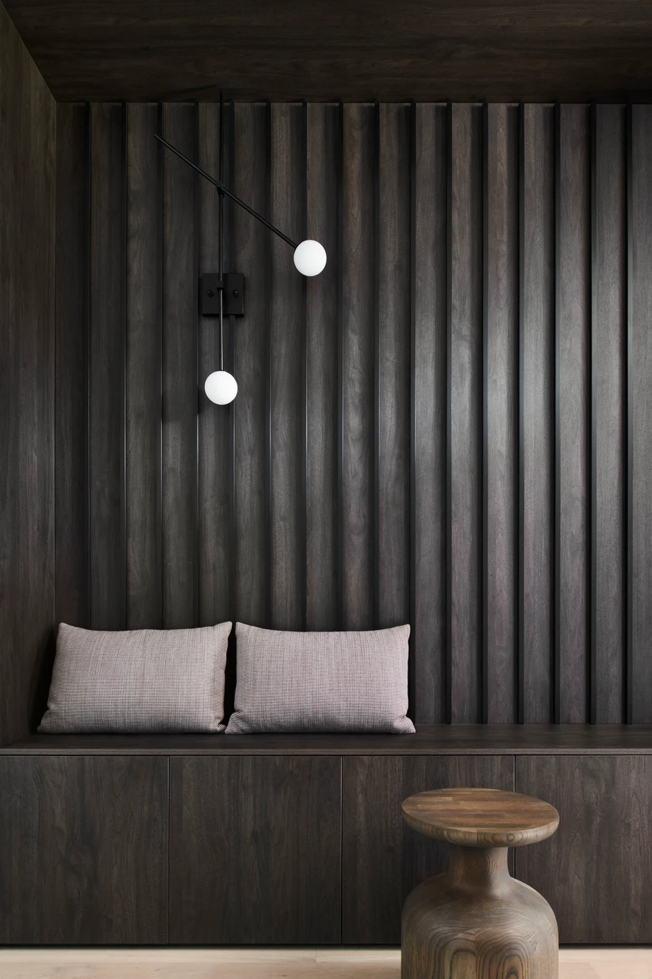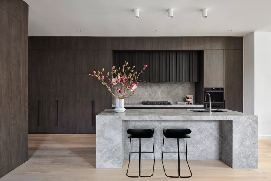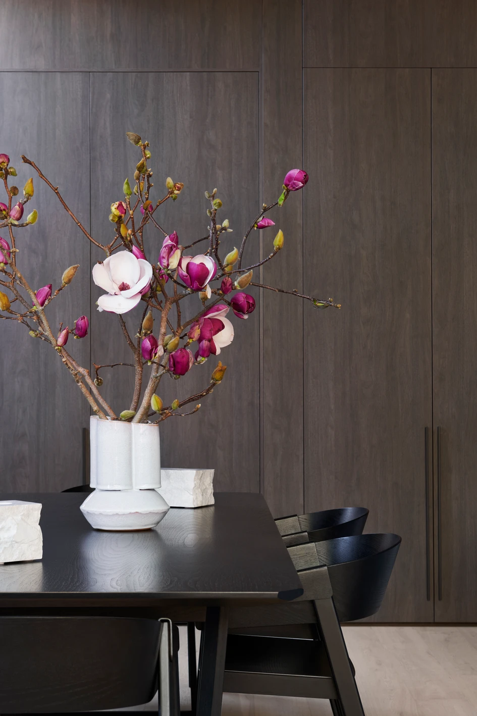 Dark walnut joinery guides you into the expansive open-plan living area, where soaring ceilings invite the gentle flow of natural light. The kitchen seamlessly blends Japanese simplicity with bold, masculine elements, featuring a striking dark grey natural stone island that commands attention both as a centrepiece and as a splashback, which is elegantly complemented by a linear panelled timber extractor. Completing the ensemble, Krystila BCN bar stools beckon guests to gather in this inviting space. The dining area effortlessly extends the cohesive design language from the kitchen, featuring a European minimalist design concept. A dark timber dining table takes centre stage, complemented by round-back Muuto Cover Armchairs that showcase a clean and understated leg detail.