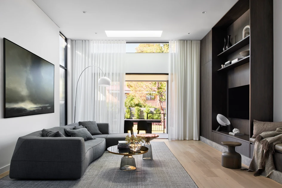 As you continue along the expanse of the wide saw-cut oak floorboards into the open-plan living area and the living room, you are greeted by a floor-to-ceiling custom joinery TV unit, elegantly adorned with a natural stone trim. This unit boasts built-in alcove seating, skilfully enhancing the room's spaciousness and offering additional seating for social gatherings. A low-profile B&B Italia sofa adds a touch of playful yet tailored seating, featuring graceful curves atop a Minotti rug. Two distinct-height Classicon Bell Coffee Tables, hand-blown from glass, invite relaxation, while an overhead lamp sets the perfect evening mood lighting. The living room boasts magnificent floor-to-ceiling windows and patio doors, draped with linen curtains that infuse a sense of softness and ethereal ambiance. These elements seamlessly connect the space to an alfresco dining area, which flows gracefully into the lush lawn beyond.