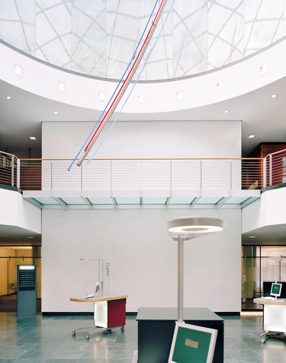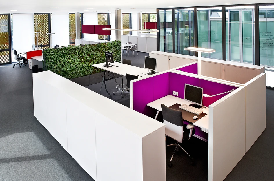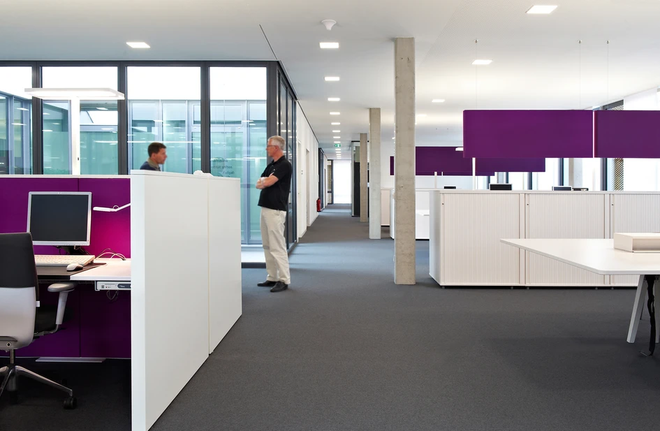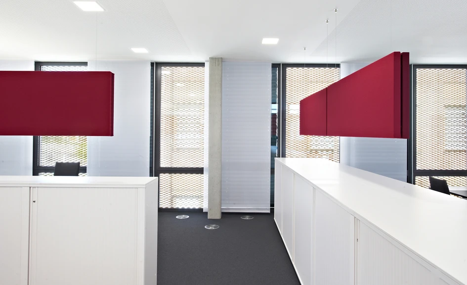 The new administration building for Sparkasse Werra-Meißner in Eschwege was completed in January 2013. It complements the brickwork building of the main offices, constructed in 1978, and the adjacent building with its Gründerzeit architecture from the 19th century. The customer lobby and all other departments of the main offices have gradually been remodeled in recent years as part of the aptly named program “Kurs Zukunft” (Setting a Course for the Future). The architect and interior design firm Bredt & Partner from Darmstadt, Germany, provided the overall concept. The firm designed an open office concept in order to better improve internal communications channels. To do so, the measures improving the acoustic properties played a significant role. The COLOR FIELDS family with the YOYO suspension system offers flexible and effective zoning options for the individual work spaces, which are rounded off by the COLOR FIELDS adhesive adapter solution for glass surfaces. The divisions between floors are effectively accentuated through a bright selection of colors creating different color zones: red/fuchsia/violet and red/orange/yellow.