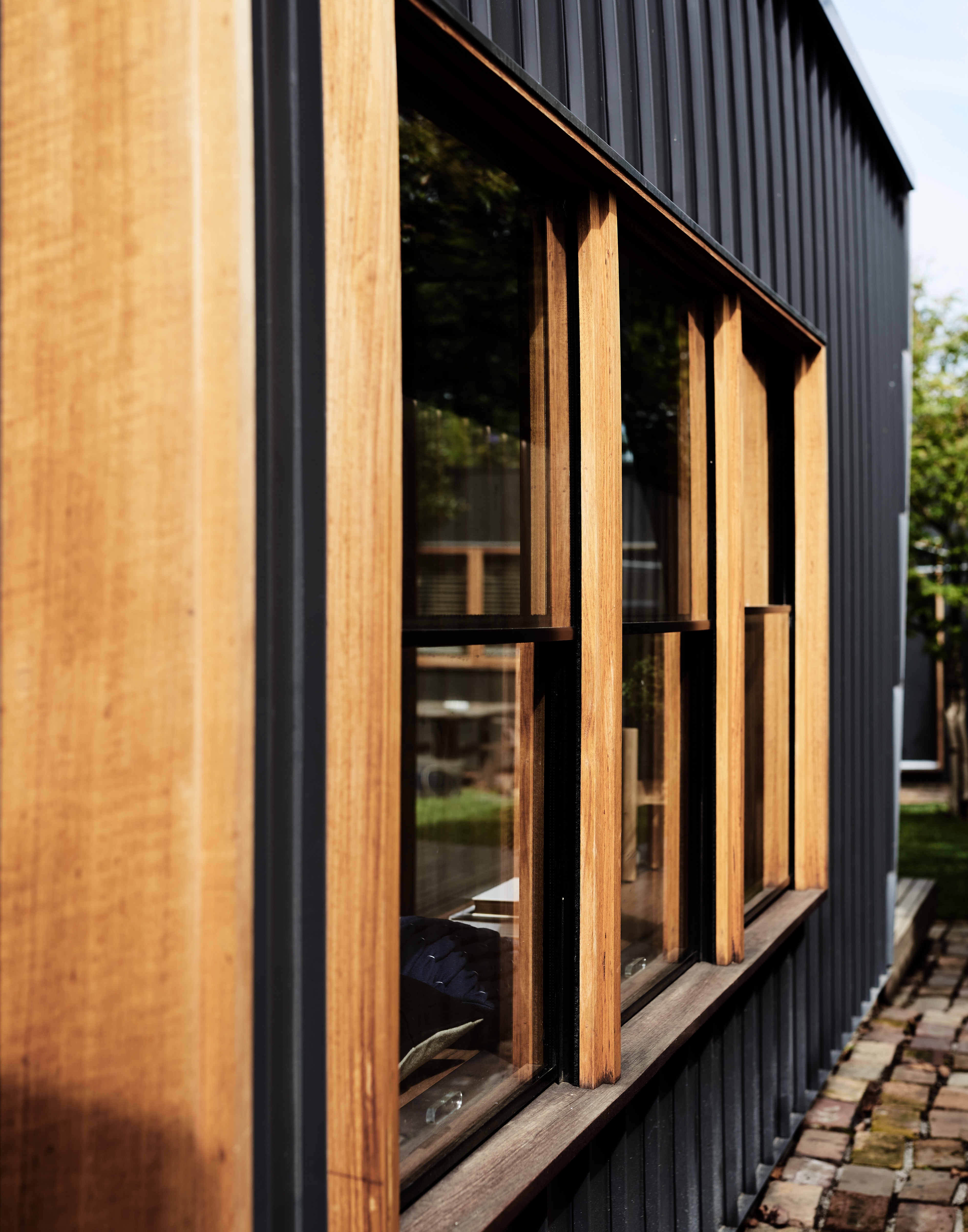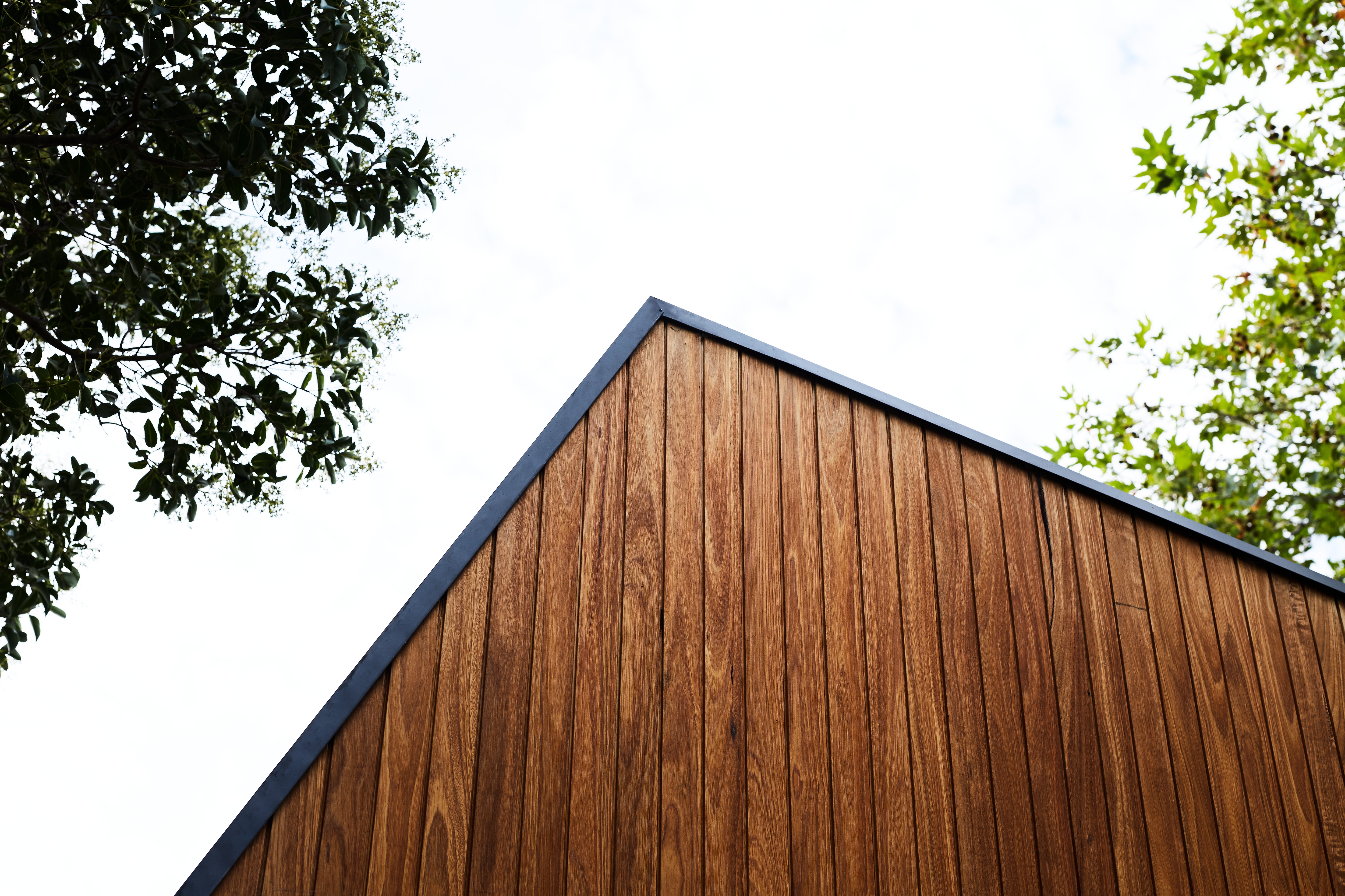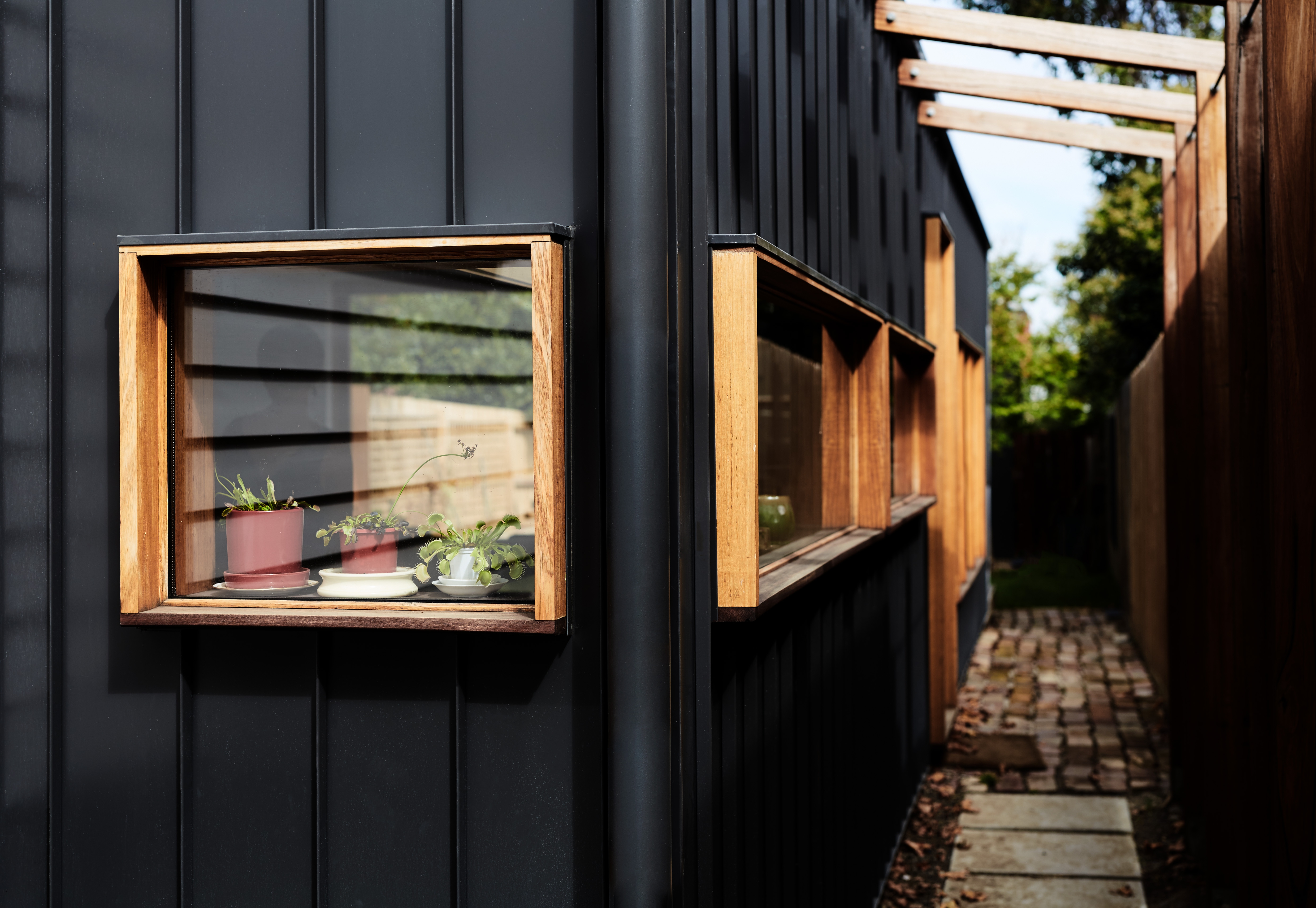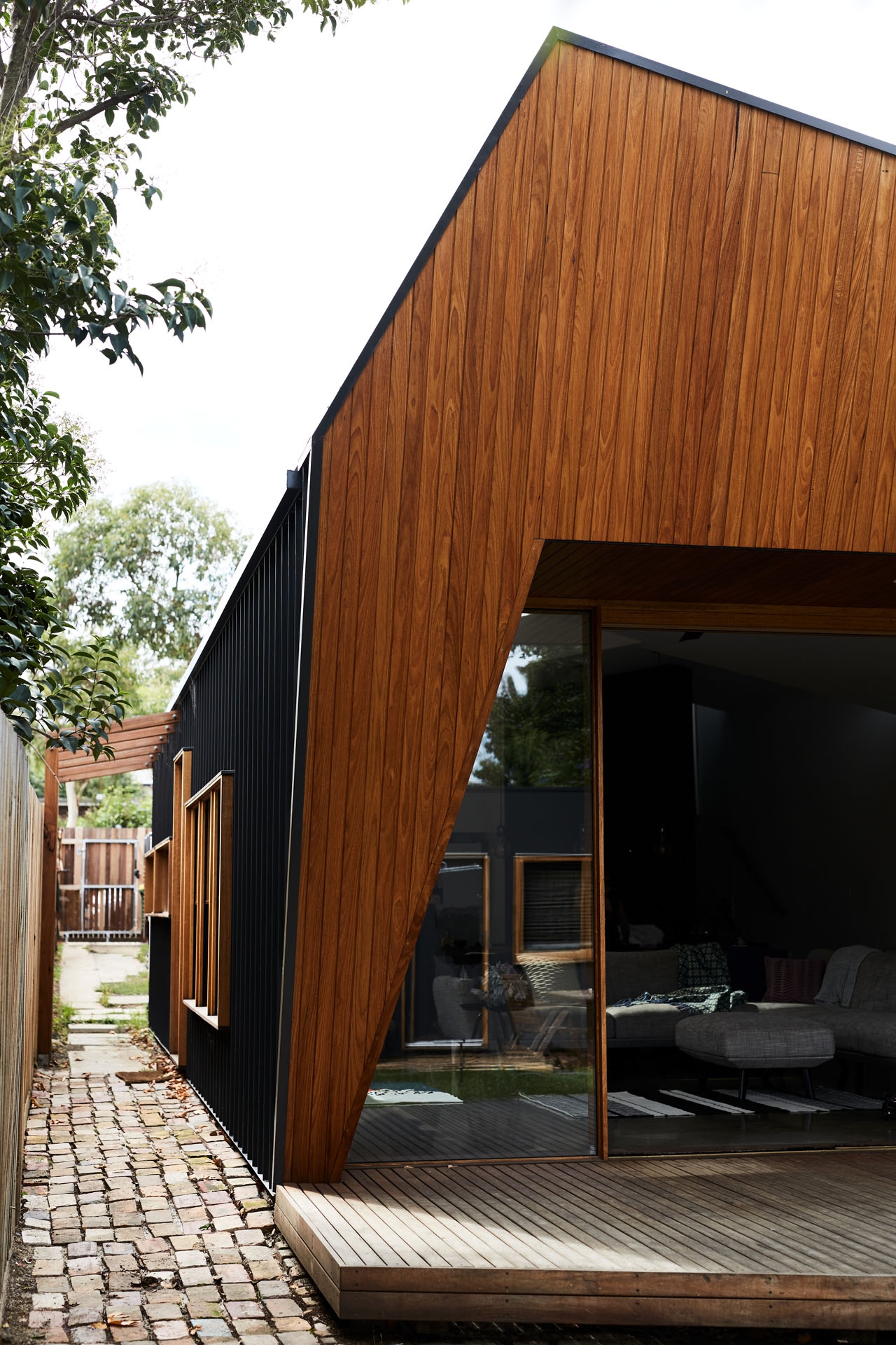 The external shell is clad in charcoal steel, with Australian hardwood timber cladding use to highlight the end face of the house, which is cantilevers over the outdoor living space and reading as though the volume of the house were cut away at the rear. The sensation in moving through the old into the new house is the classic architectural experience of compression and release. Moving through a door, to a tight corridor, into a wide chamber in which openings allow for a cascade of framed views into a tree, the sky, and finally the open backyard. This procession of space allows for a cinematic experience of domesticity which is a recurring theme in the work of the practice.