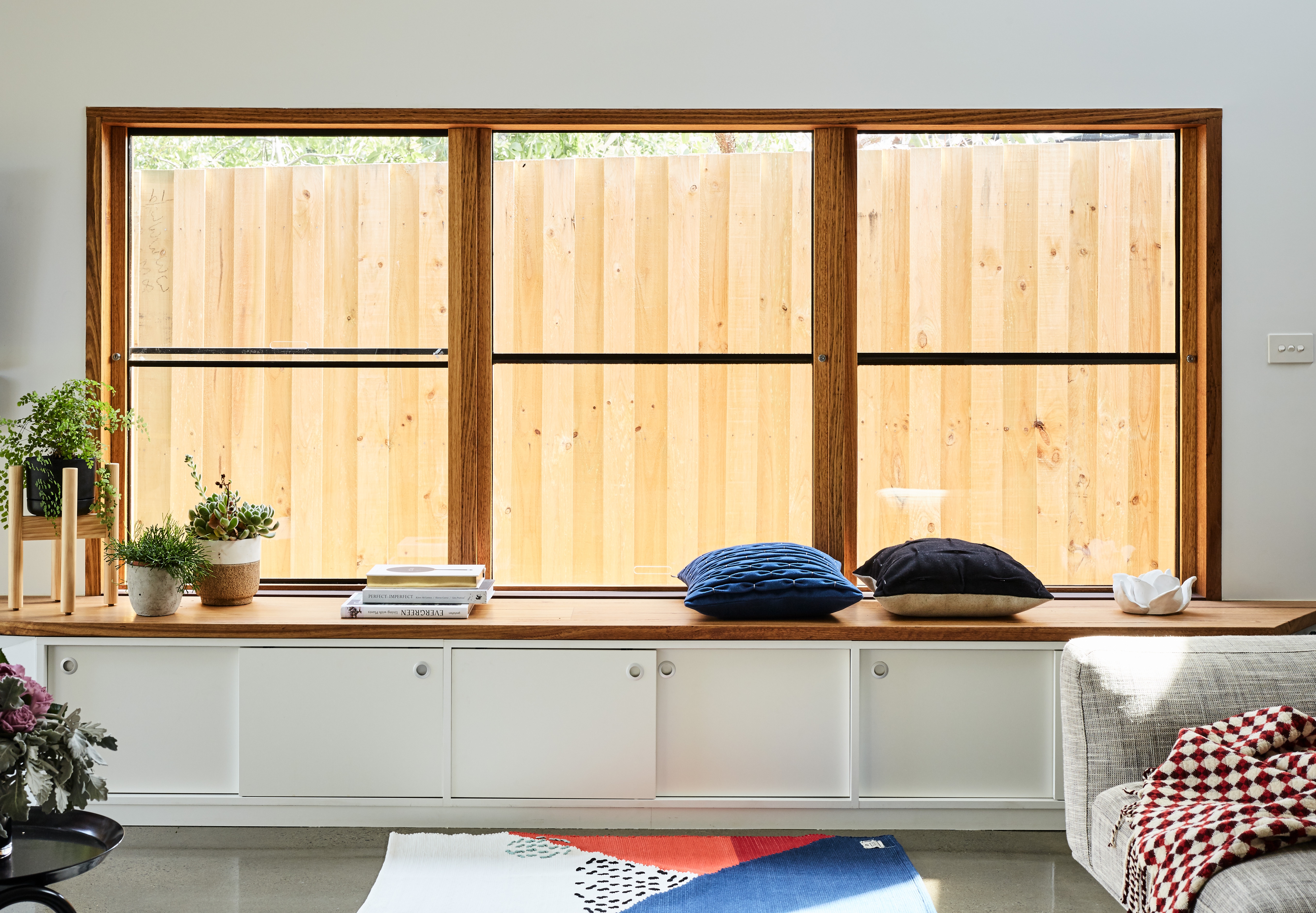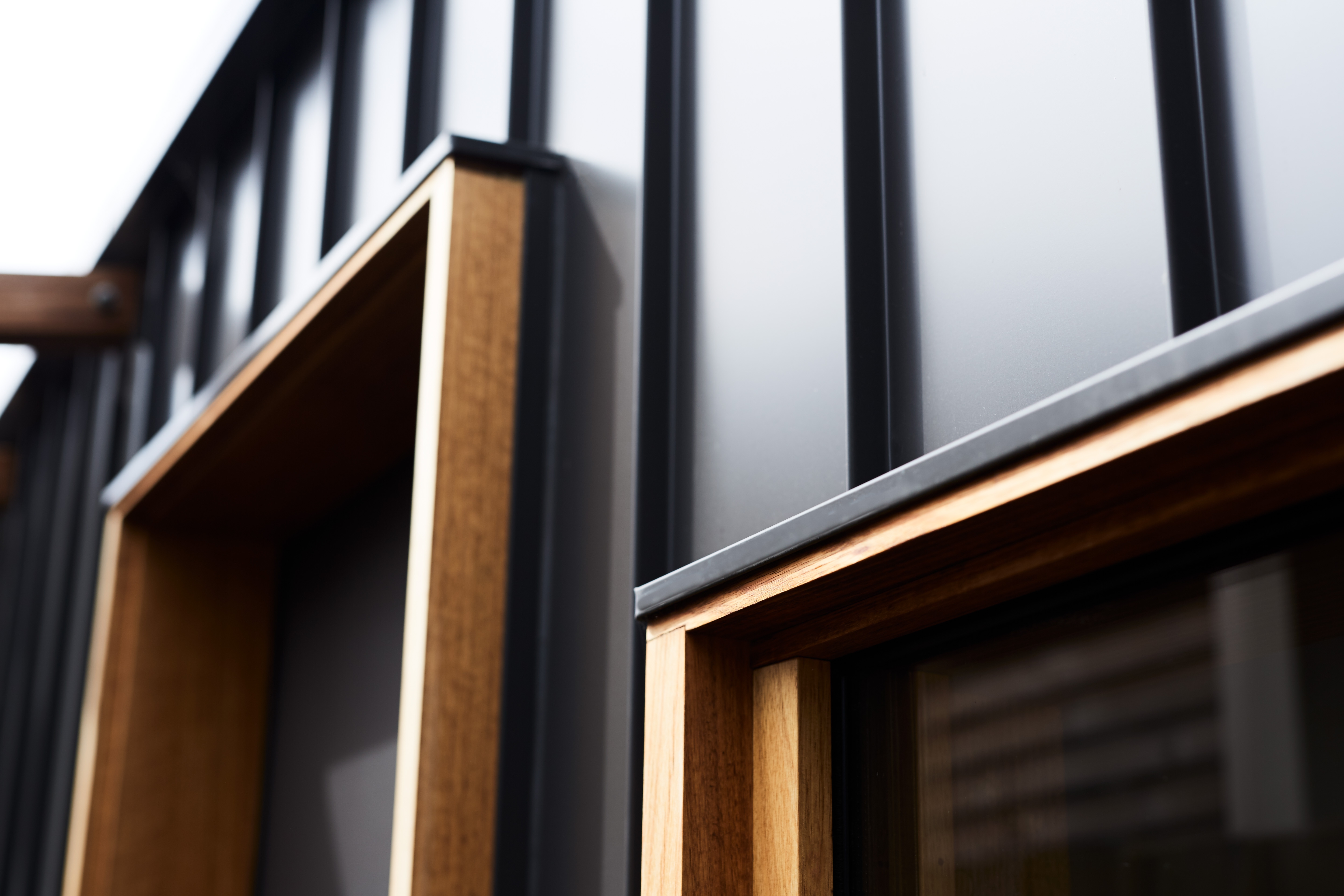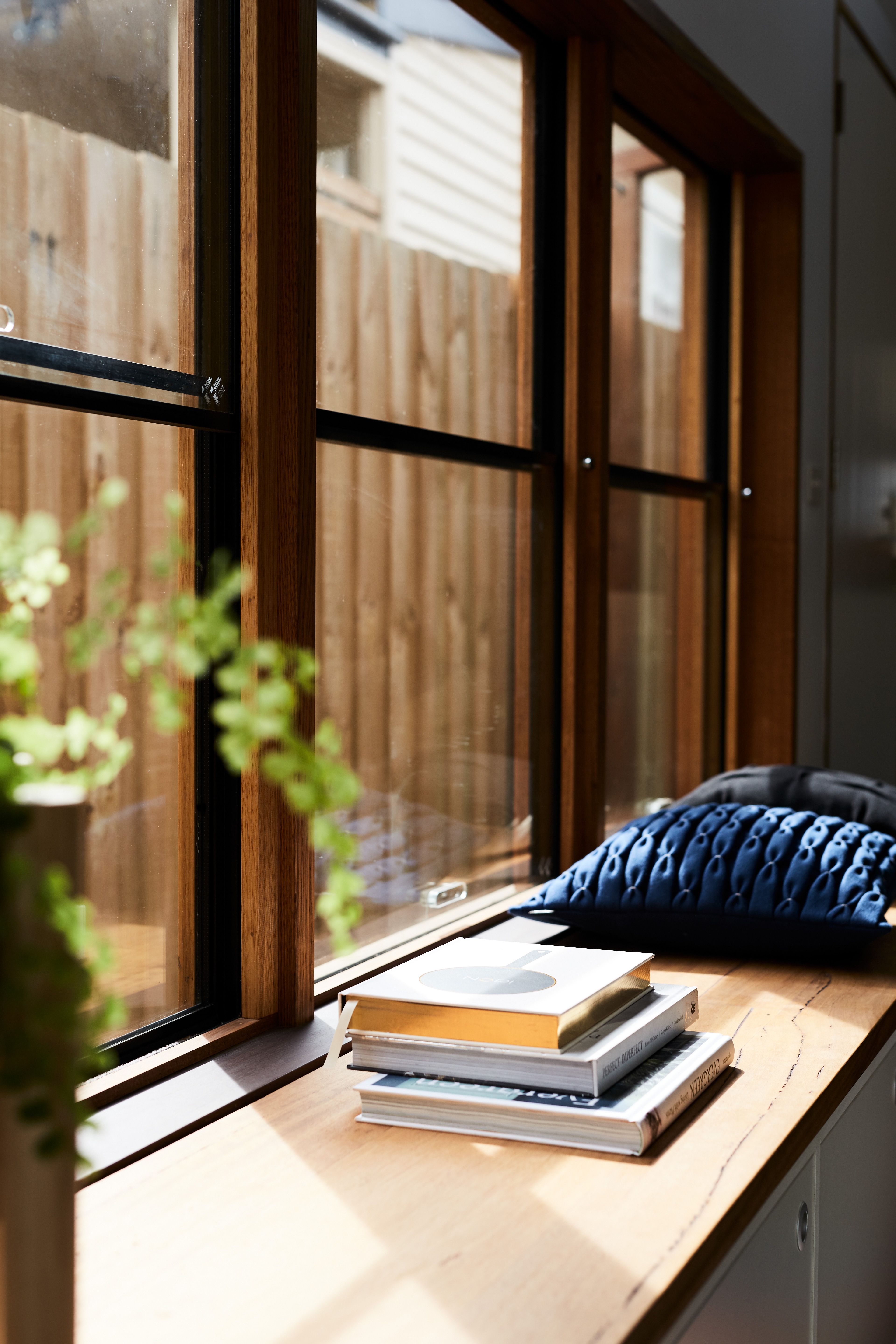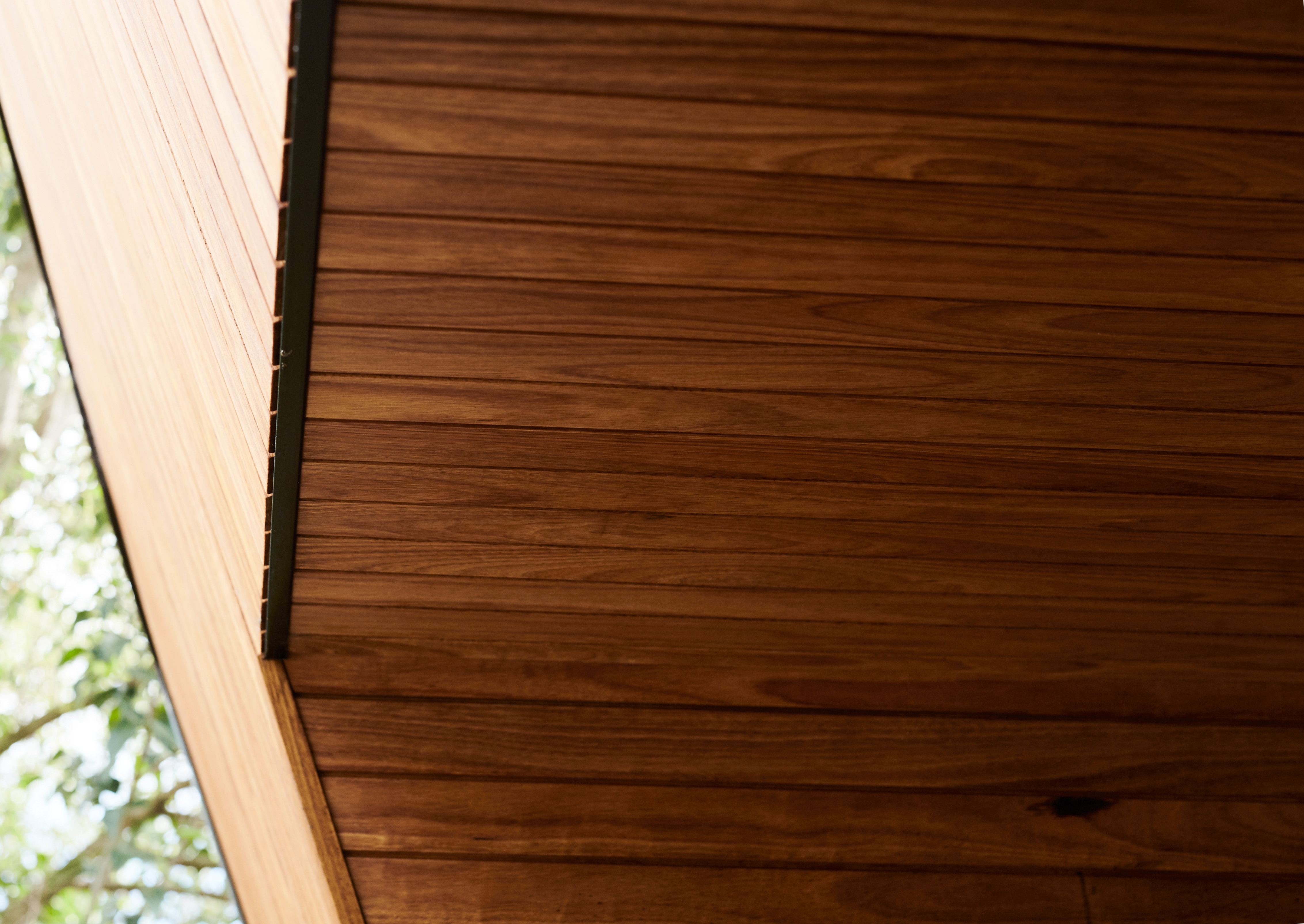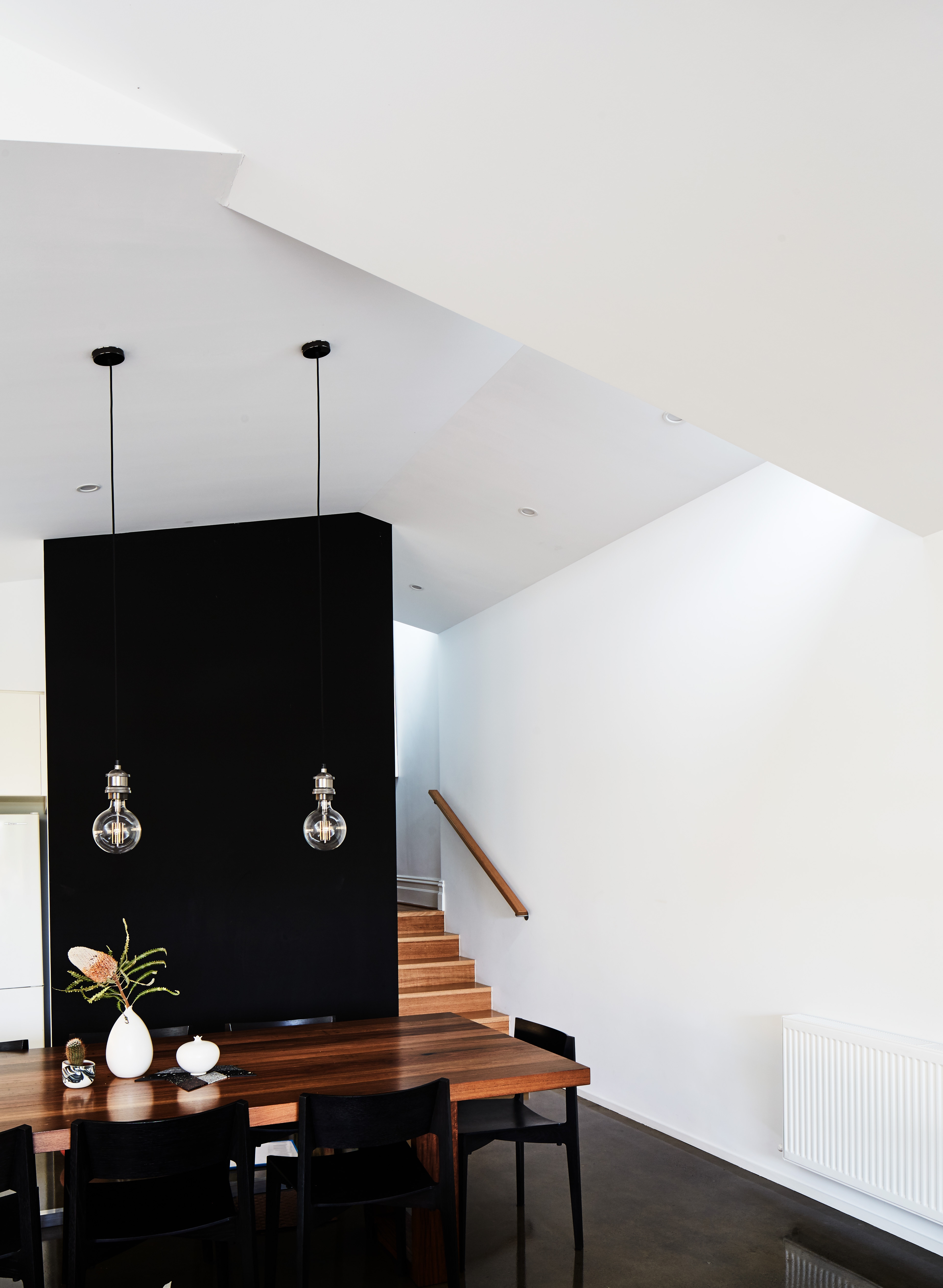 The external shell is clad in charcoal steel, with Australian hardwood timber cladding use to highlight the end face of the house, which is cantilevers over the outdoor living space and reading as though the volume of the house were cut away at the rear. The sensation in moving through the old into the new house is the classic architectural experience of compression and release. Moving through a door, to a tight corridor, into a wide chamber in which openings allow for a cascade of framed views into a tree, the sky, and finally the open backyard. This procession of space allows for a cinematic experience of domesticity which is a recurring theme in the work of the practice.
