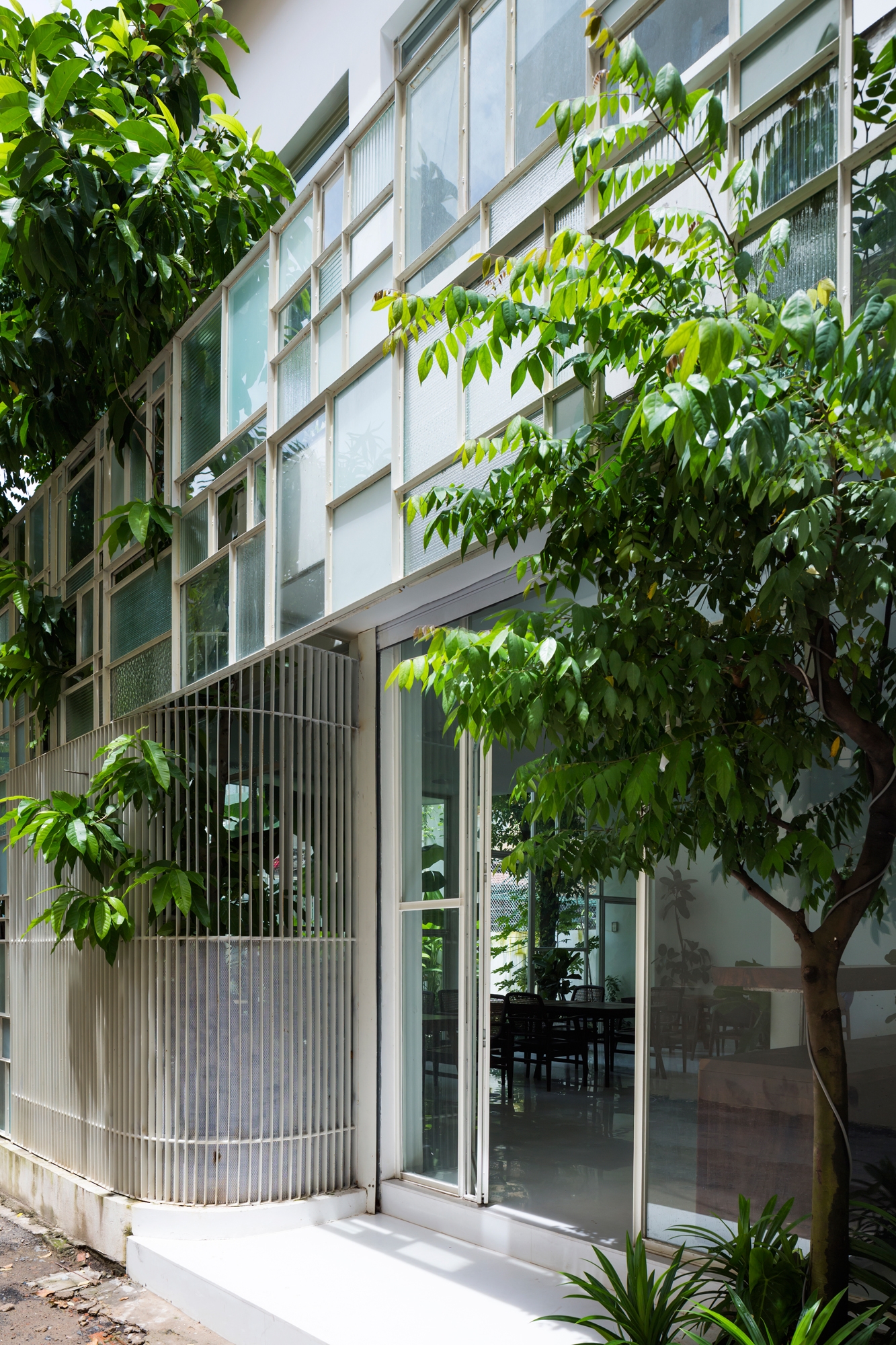 The house situates on one of the alley that branches off from the main street known as Pham Ngoc Thach. Often refer in Vietnamese as “hẻm”, it is an intricate network of small alleys that are characterized by local daily activities, slow traffic, pop-up markets, mom and pop’s shops, vendors and restaurants. Eyes are the window to the soul, in this house, windows are the soul of its place. The glasses used on the screen embodied the soul of old Saigon, with its distinct pattern and texture. The windows provoke a sense of curiosity and indirect connection between inside and outside, veiled by multiple layers of vegetation, and textured glass.