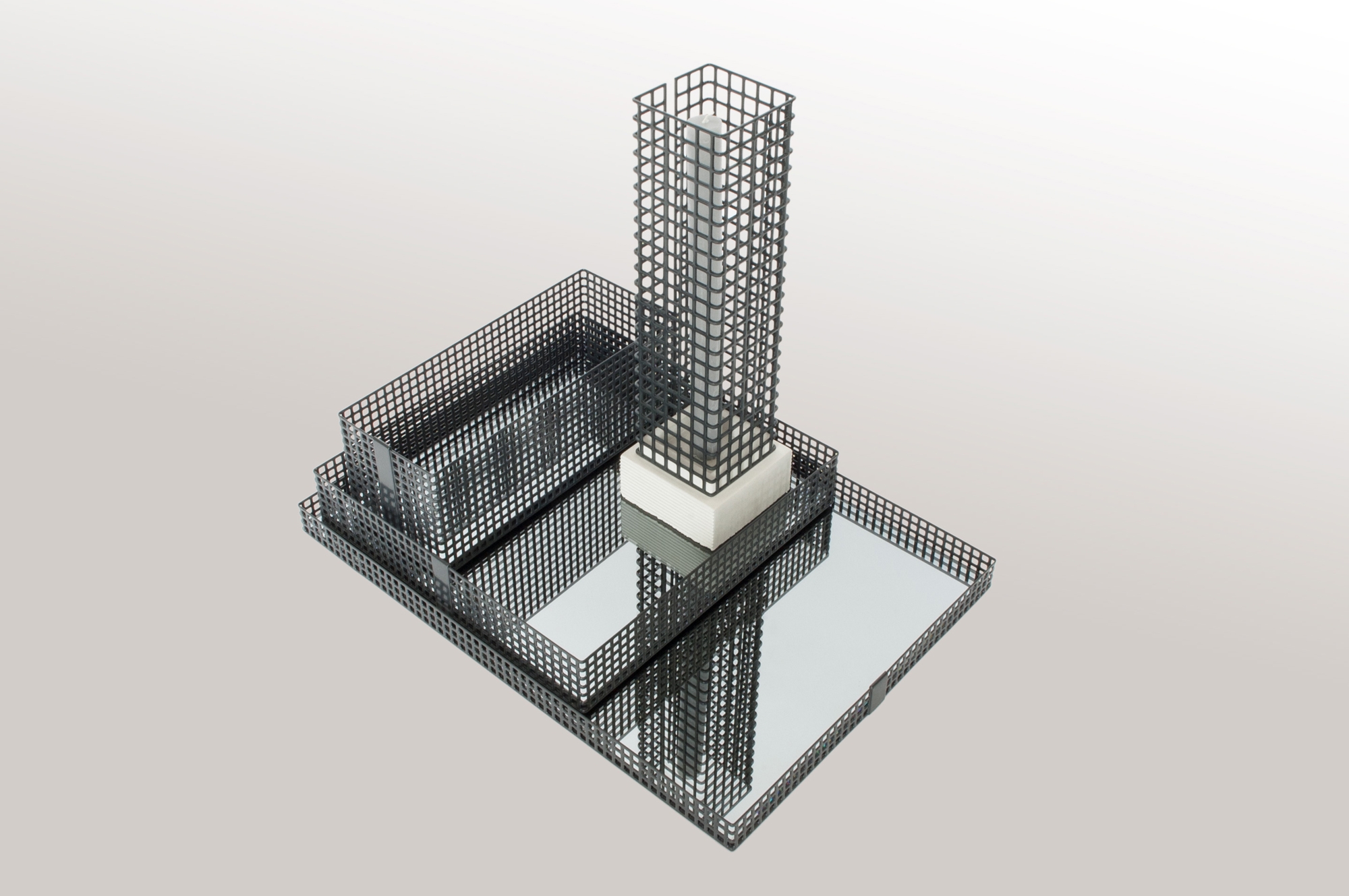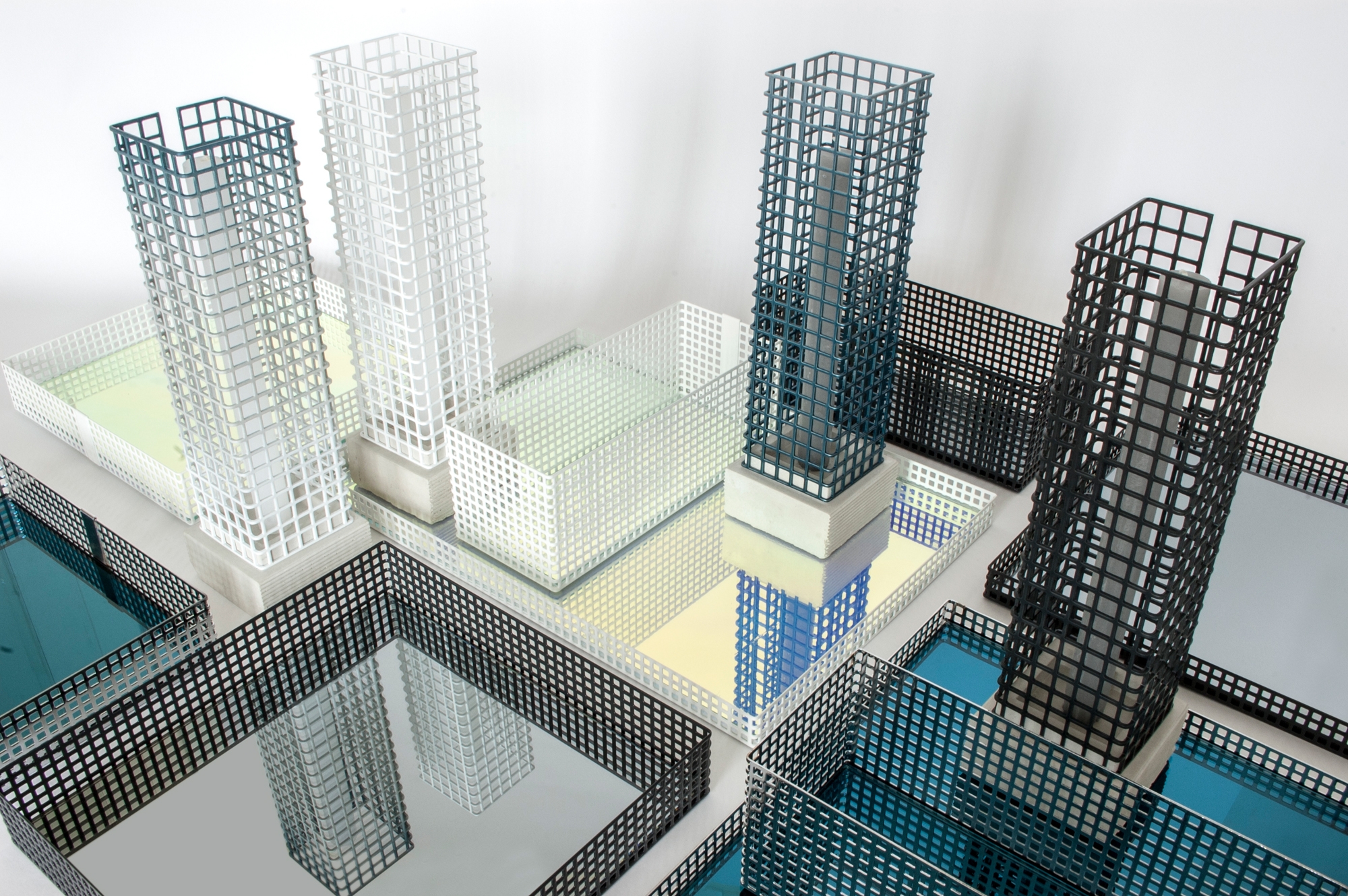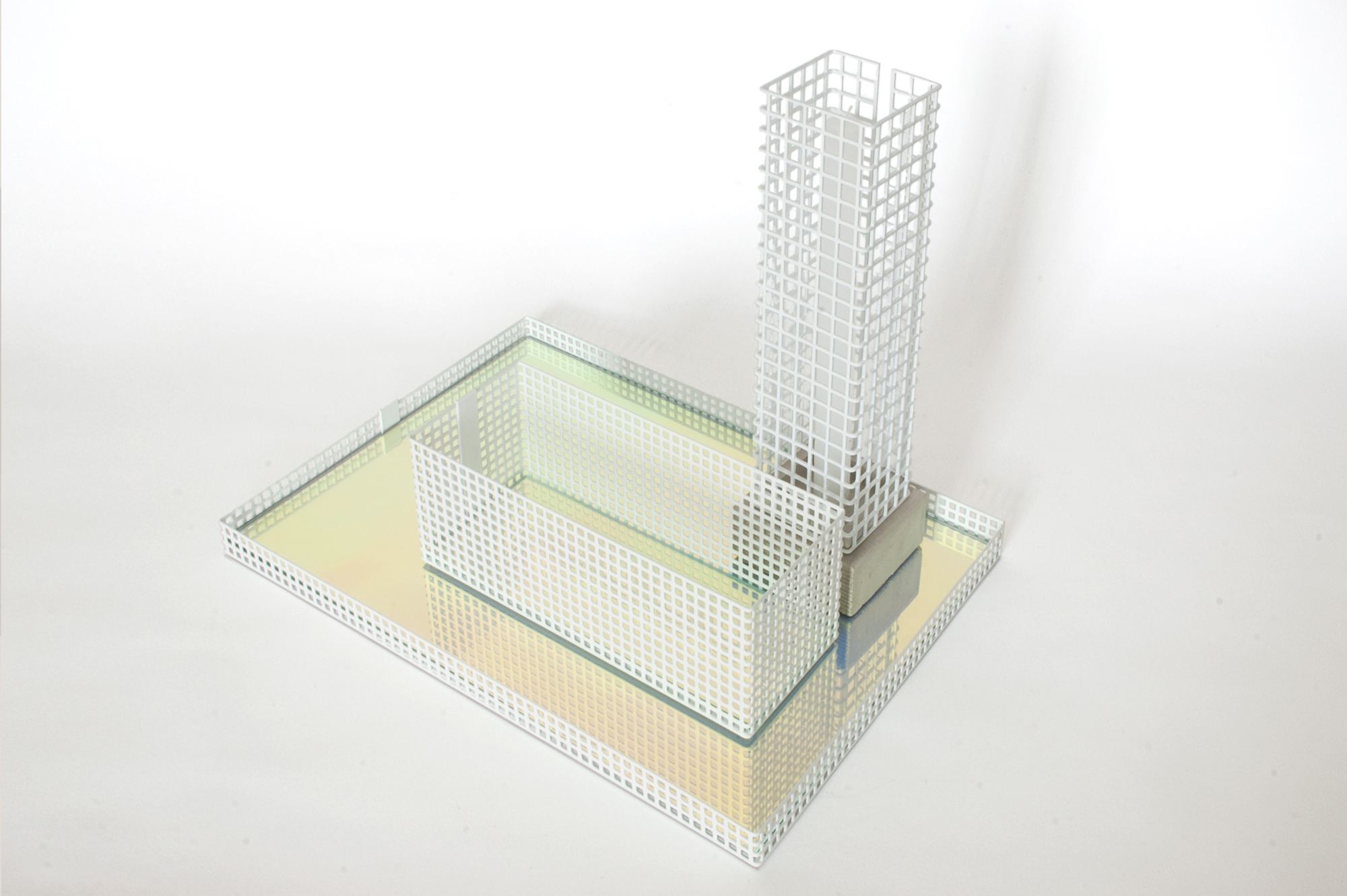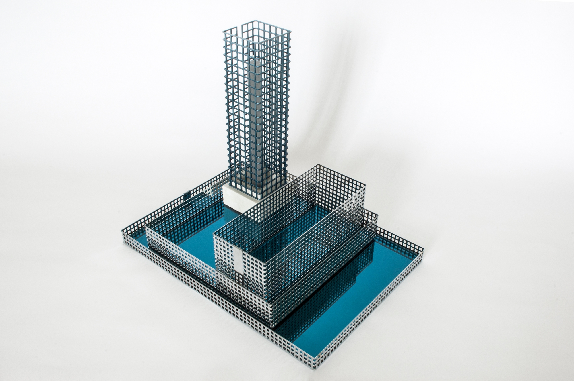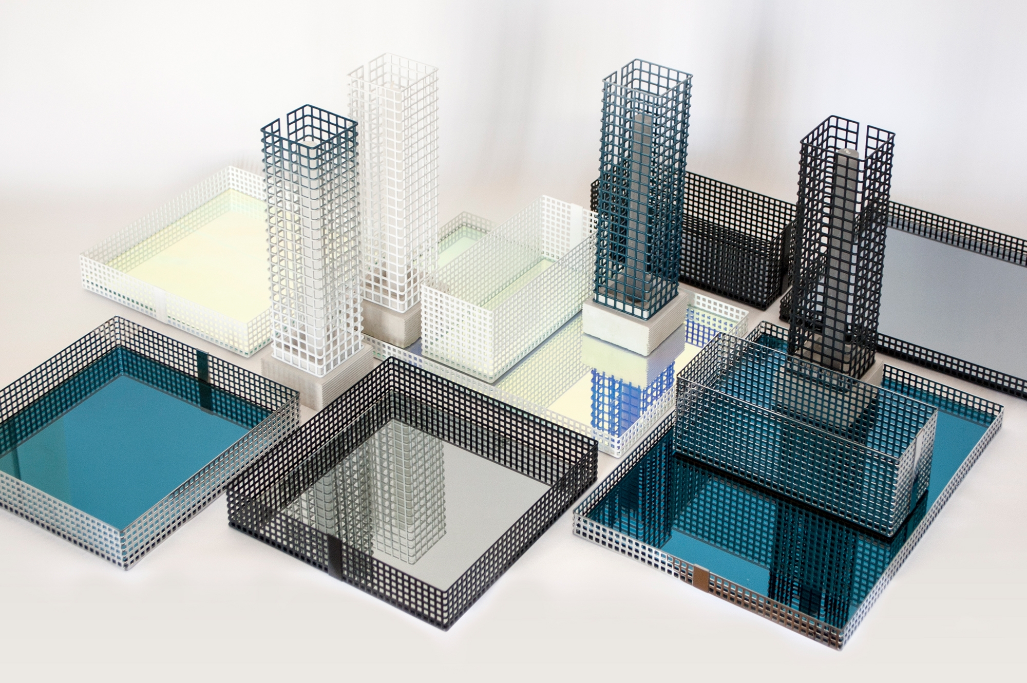 This set of table trays and candle holders play with the abstraction of scale. They can be perceived as architectural elements that interact with each other. Made from perforated metal and reflective glass, they become architecture and together they form an abstract cityscape.