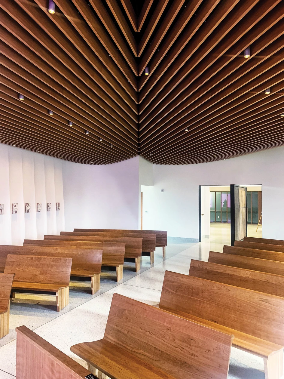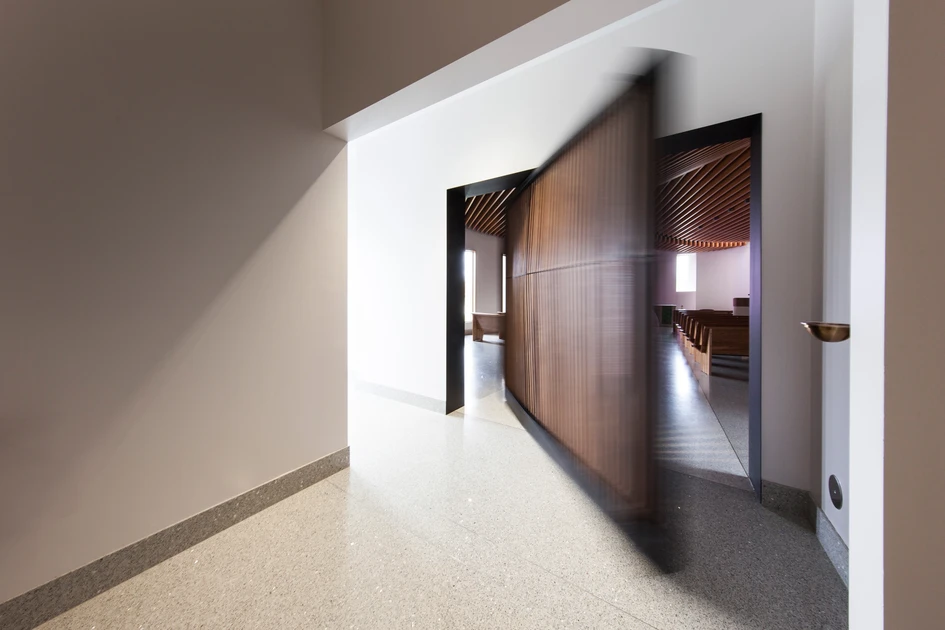 L’incroyable chapelle St. Mary Chapel témoigne d’une architecture religieuse moderne. La porte pivotante intérieure de la chapelle a été conçue par PLY+ et fabriquée par Synecdoche Design Studio.