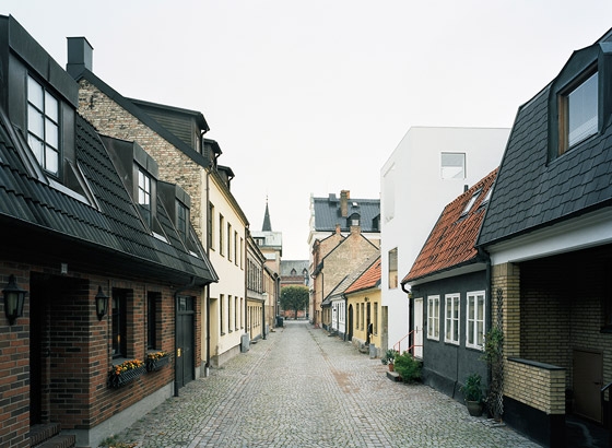 The narrow site is sandwiched between very old neighboring buildings in Landskrona, Sweden. Since mid 20th century it has been empty, waiting behind a wooden fence. It is only 5 meters wide with a tiny area of 75 square meters. Immediately adjacent buildings are low, but the street is lined with buildings of various height, size, facade material, age, and approach. Behind the row of buildings is a colorful world of back yards, brick walls, sheds, and vegetation. We find this small-scale, motely, naturally worn place extremely beautiful.