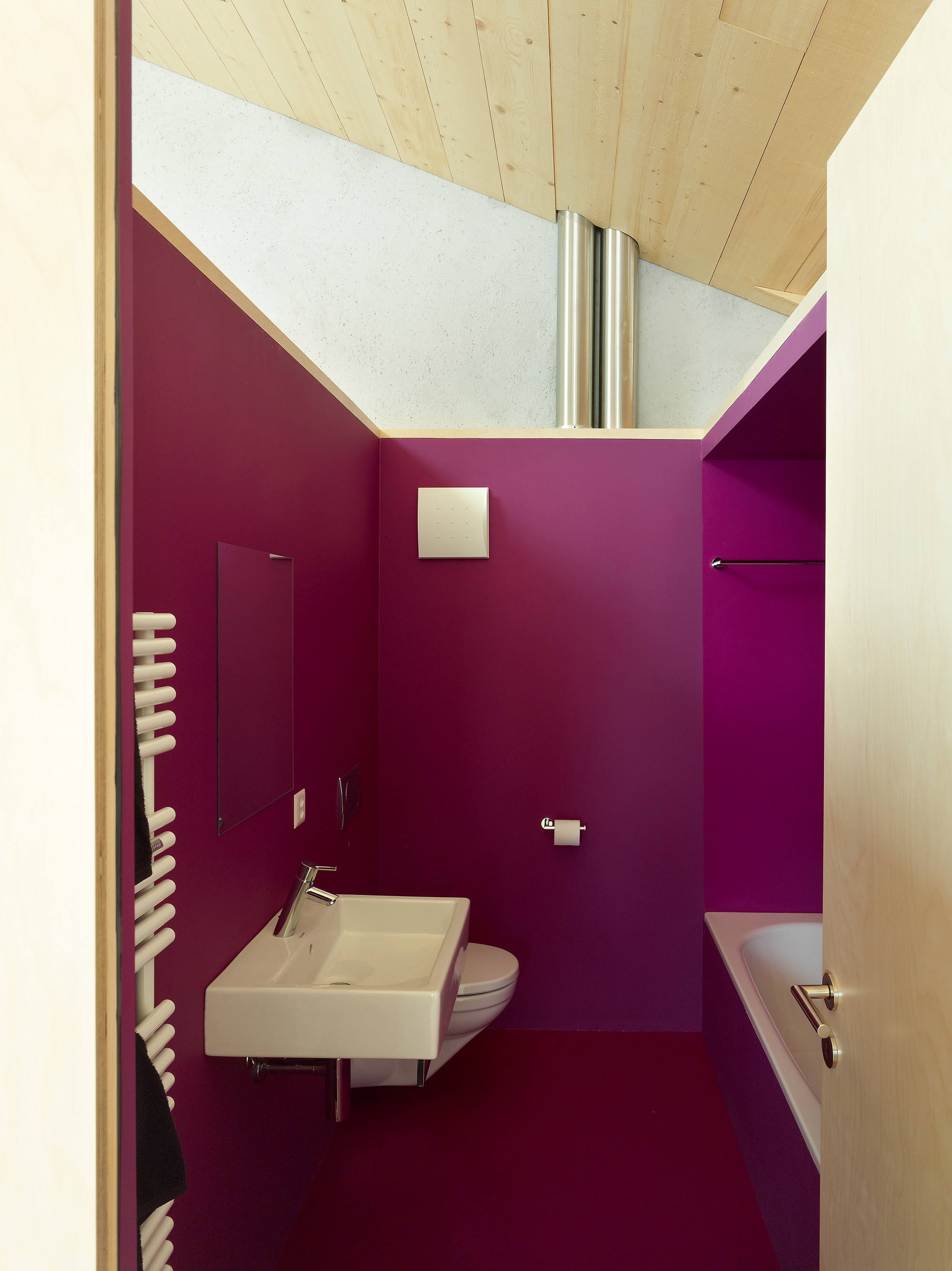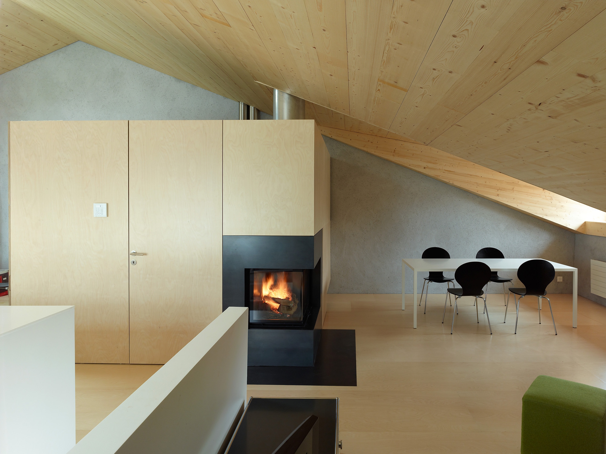 La matérialité de la ferme est maintenue. Elle se compose de murs épais et irréguliers recouverts d’un crépi rugueux et d’une grande toiture dont la face intérieure est traitée en lambris de sapin non rabotés. La matérialité de ce « contenant » s'oppose à celle de l’objet qui se présente comme un coffre en bois volontairement lisse, travaillé et précis.