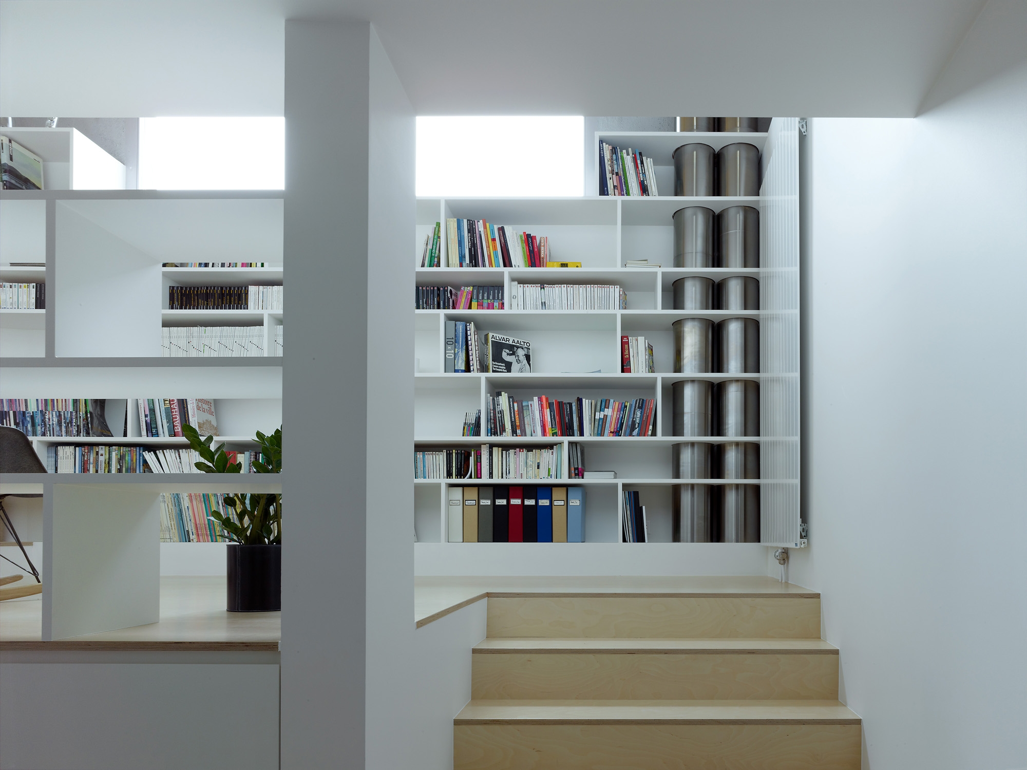 L’ancien logement est réaménagé simplement : Le salon, la cuisine et la salle à manger se situent au rez-de-chaussée en rapport avec le jardin. Les chambres occupent les étages. Une nouvelle circulation verticale distribue ces espaces sur les trois niveaux du bâtiment. Cet espace de circulation est traité comme un meuble contenant les escaliers, des armoires et une salle de bain.
