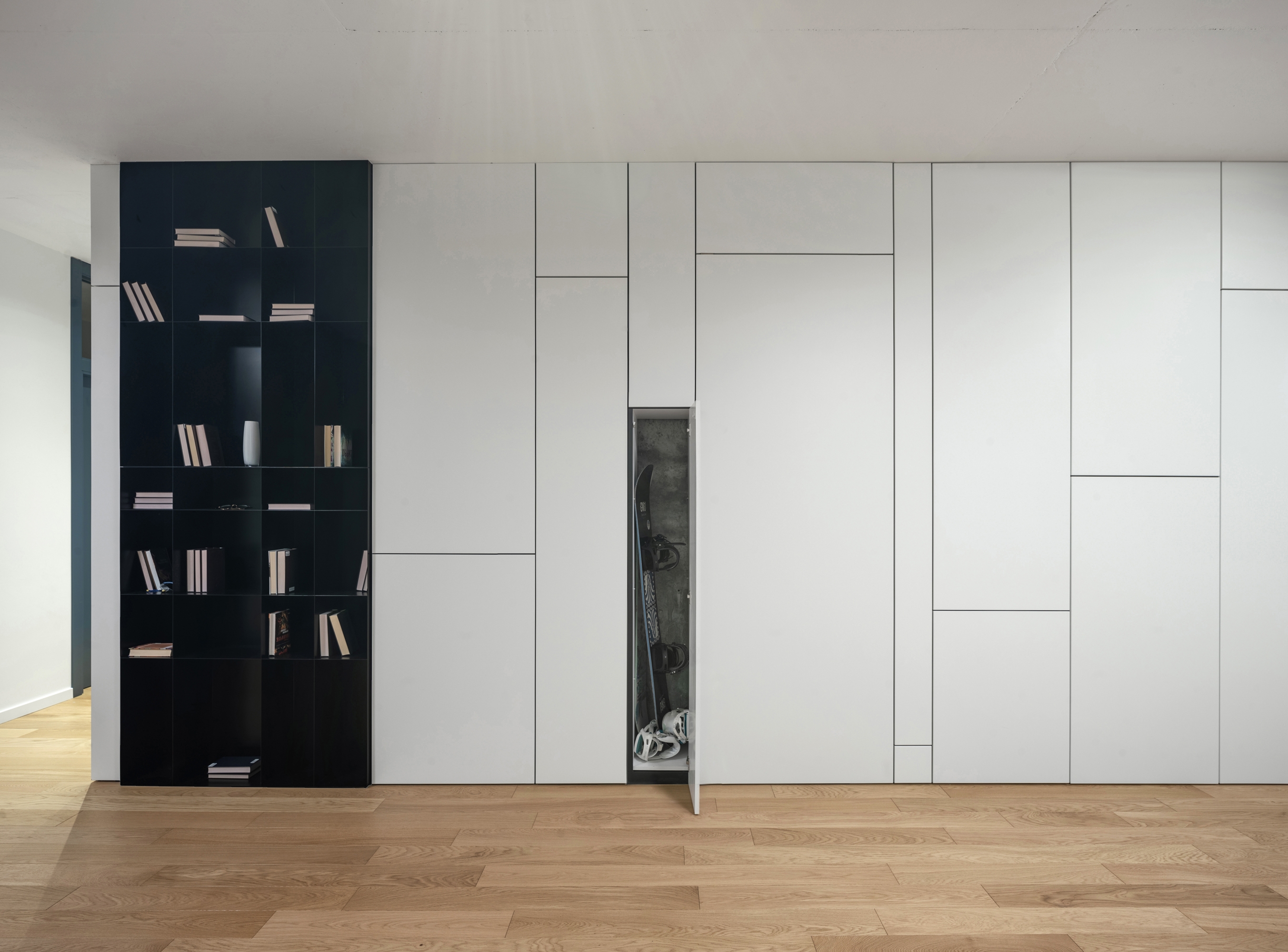 The apartment space consists of two united flats. A huge hall appeared as the result of it. After careful consideration we took a decision to preserve this vast space and not divide it into smaller rooms. “Here my children will be playing soccer and riding scooters”, – the owner expressed his wish and this idea was totally supported by our team.