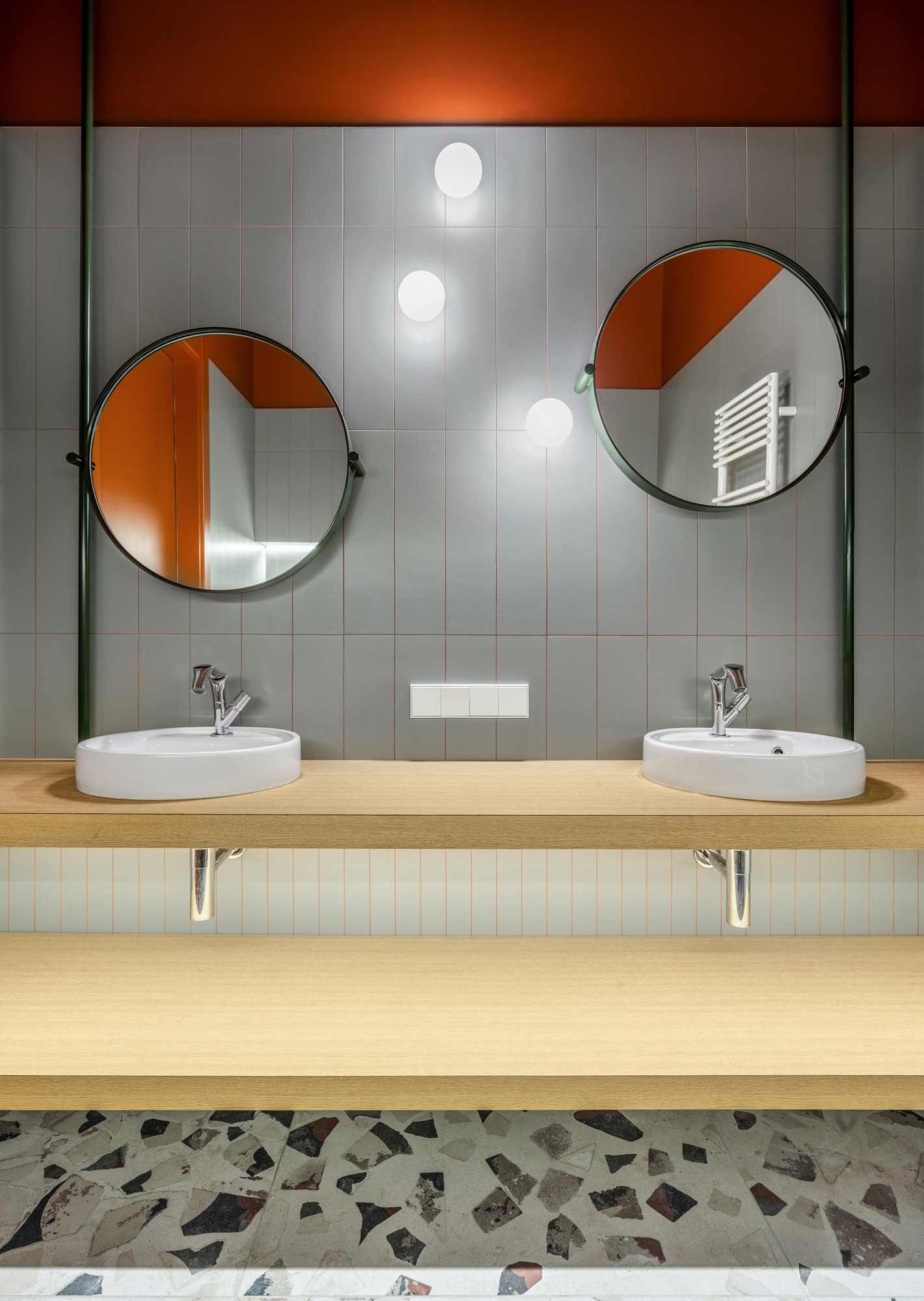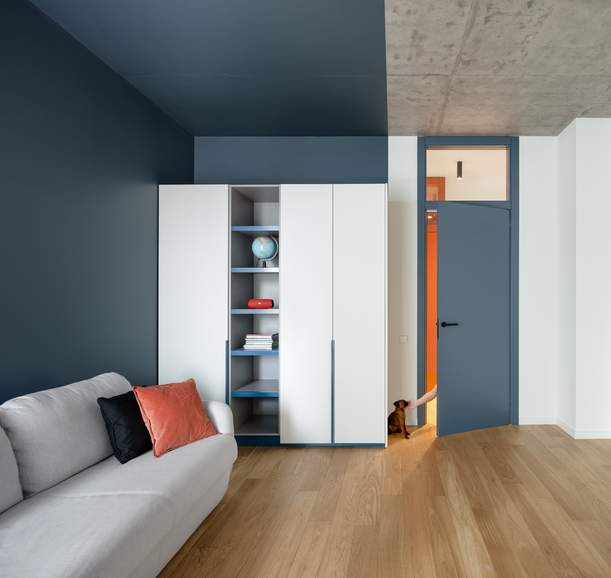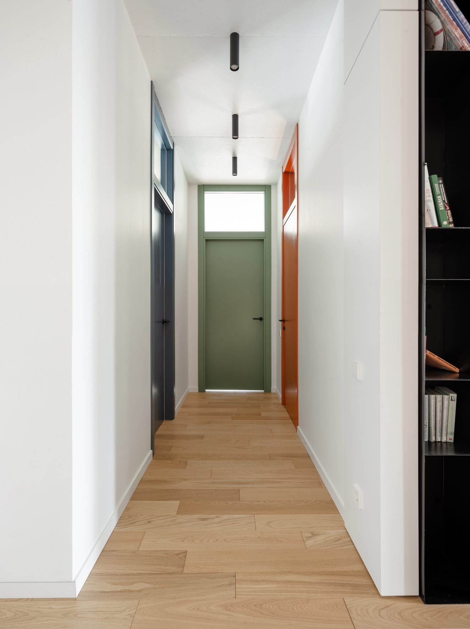 Kid’s zone comprises of two rooms for boys with a shared bathroom and a room for the young lady in powder-pink tones with her own bathroom. This zone can easily be identified there are three bright doors tinted in fashionable shades of green, blue and terracotta. A minimum of furniture and more functional design – this is the prevailing idea of the whole space.
