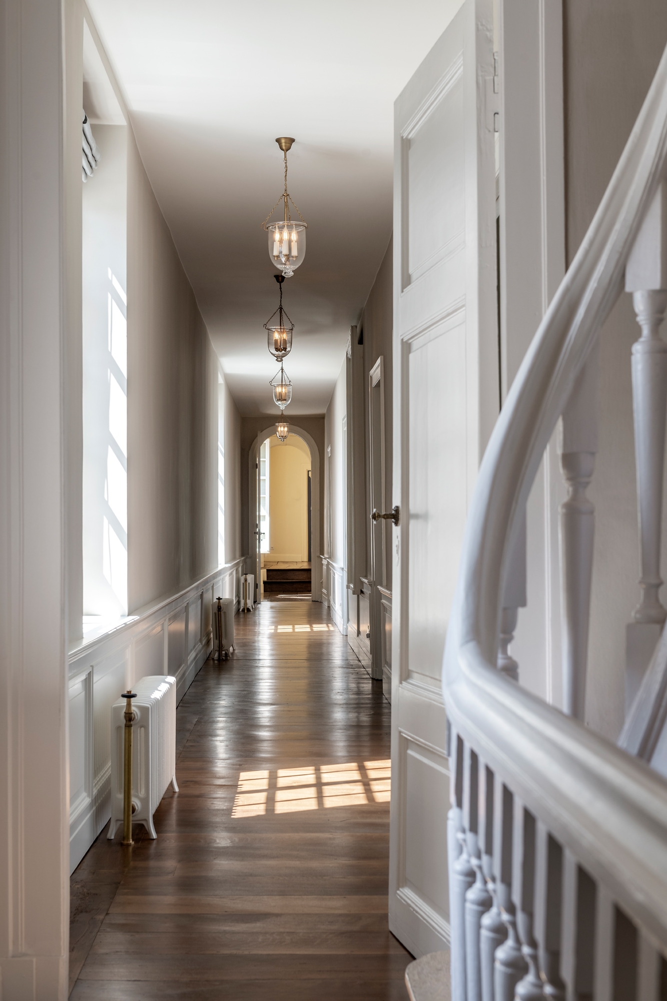 In the interior of the castle we find a subtle blend of soft greens, beige, brass and oak. a subtle nod to the palet we find in the garden's. Creating a warm and peaceful setting.