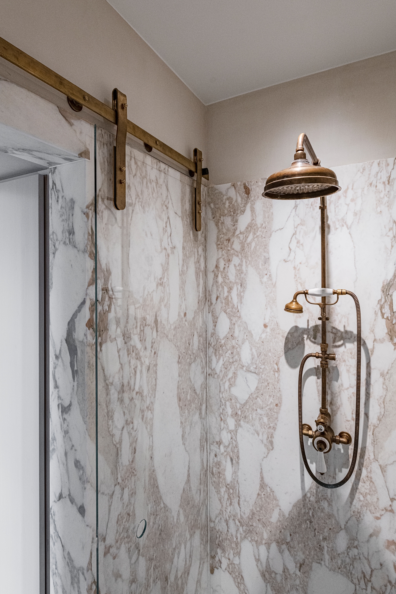 The same idiology was translated into the kitchen and bathroom. While designing these interiors, the priority was to maintain the sense of warmth and peace by usage of warm colors. We therefor applied our iconic Old Brass finish to our products to complement the character of these interiors