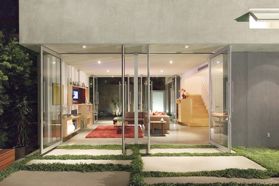 The house is striated into two vertical levels with the more secluded sleeping and bathing spaces located in a solid volume enclosure at the upper level. Strategically placed openings are positioned to enhance the panoramic views to the surrounding hillside, while maintaining privacy and seclusion from adjacent neighbors and structures. The mass of the upper volume appears to float over the ground floor living and dining spaces. At this level, large center pivot aluminum and glass doors allow the interior to effortlessly open to the adjacent outdoor spaces, creating a flexible indoor / outdoor room which is visually connected to the canyon landscape beyond.