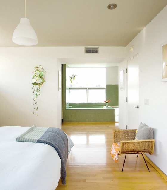 The building site is sculpted by an above ground lap pool on the downslope side of the property, countered by an exposed concrete retaining wall on the uphill side. Together these two site features carve a sizable horizontal landing for the ground floor living and dining areas which open to a cool entry courtyard to the north and sunny pool terrace on the southern face. This configuration creates a natural cooling effect for the house which pulls the canyon breezes through the house, conditioning the air as it crosses the cooler water evaporating from the lap pool.