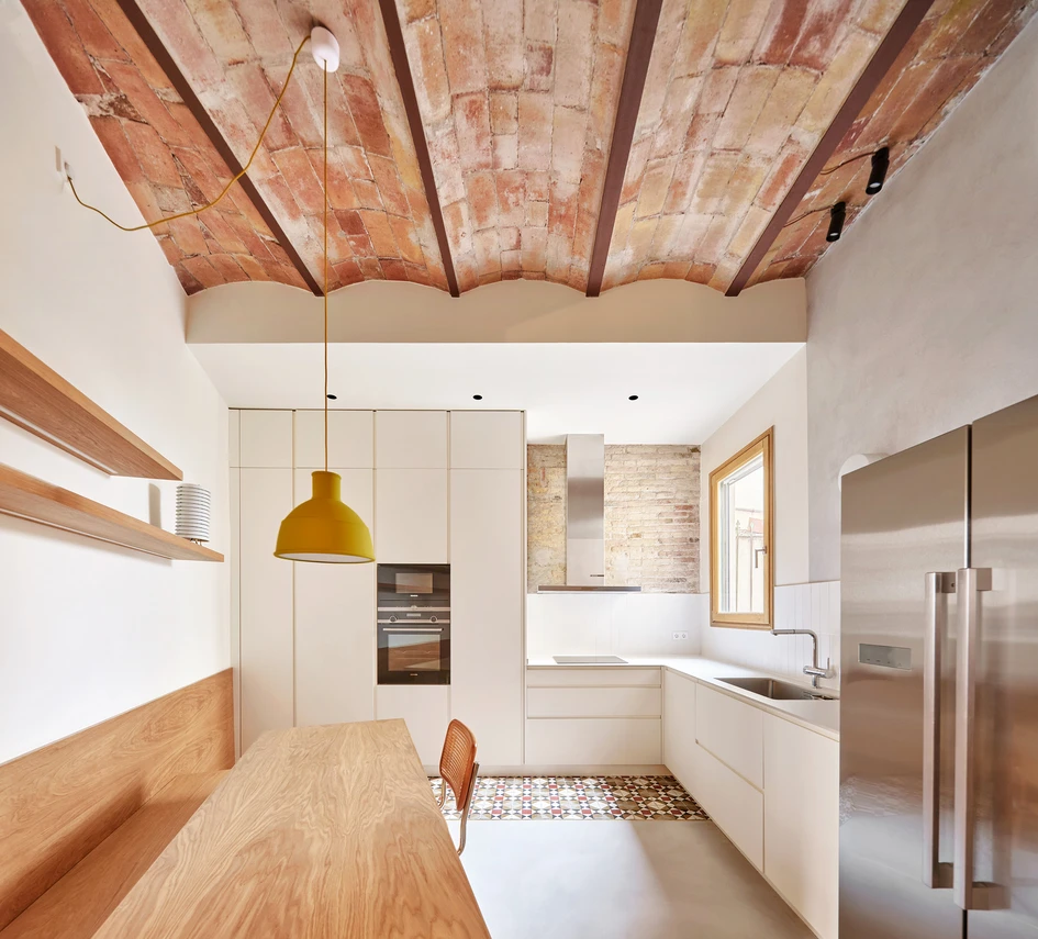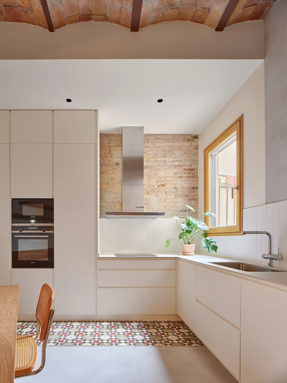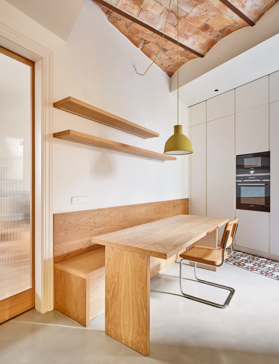 The original structure of the apartment was maintained, such as the high ceilings and hydraulic mosaic tiles. In addition, some elements such as wooden doors were restored. For the contemporary intervention, concrete was chosen as a neutral and artisanal material that highlights the recovered hydraulic pieces. It also dialogues with the exposed ceramic ceiling and the brick walls. The custom-made furniture is made of oak wood, integrating with the rest of the carpentry and creating a cozy atmosphere. As for the kitchen furniture, large minimalist white cabinets were chosen, adding elegance and providing the necessary functionality for modern living.