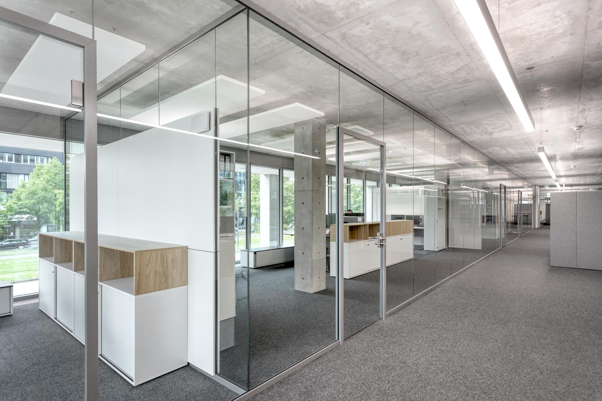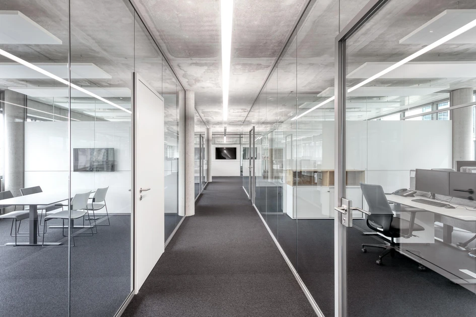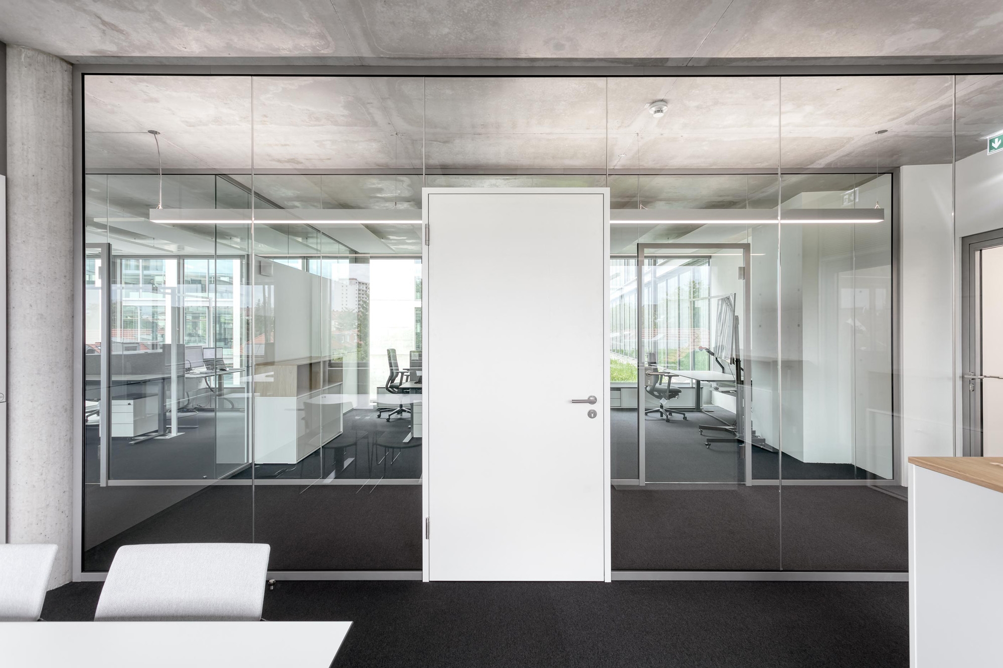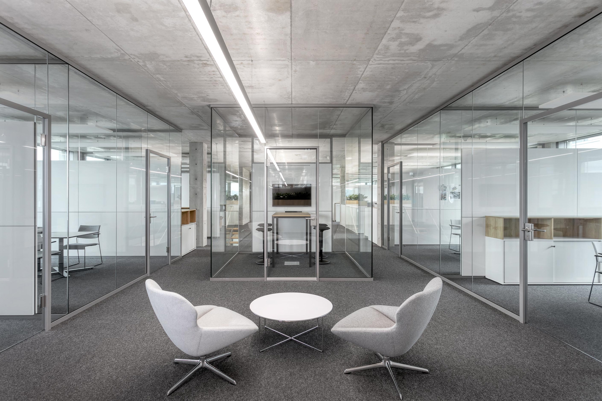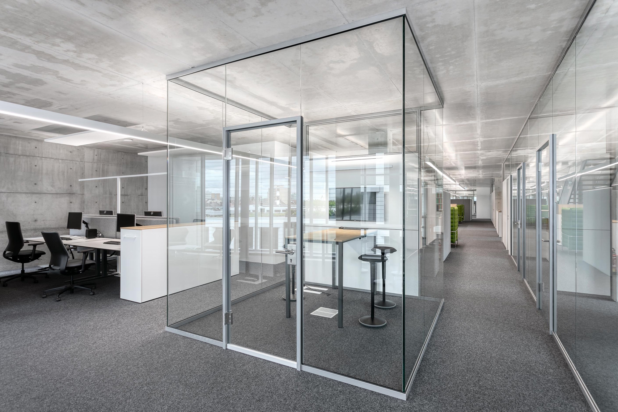With the fecoplan all-glass construction it is possible to separate areas for concentrated work, co-creation, meeting and communication from the open office landscape and at the same time to show the high-quality exposed concrete ceilings throughout. For this purpose, the intermediate office walls are also designed as skylight walls without vertical upright profiles and with non-bearing wall shells. The panels are covered with magnetic laminate to enable construction plans to be hung up on them.