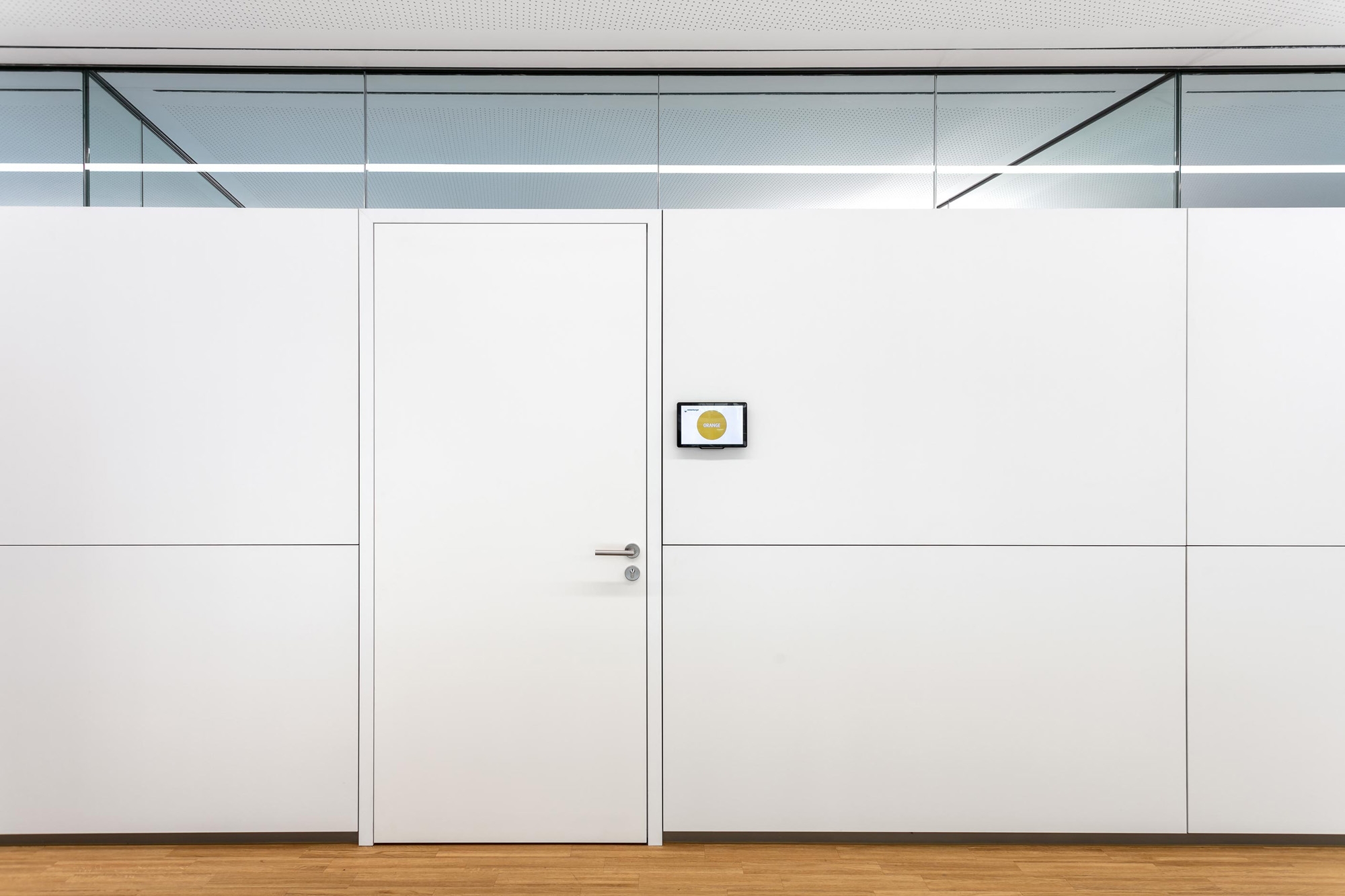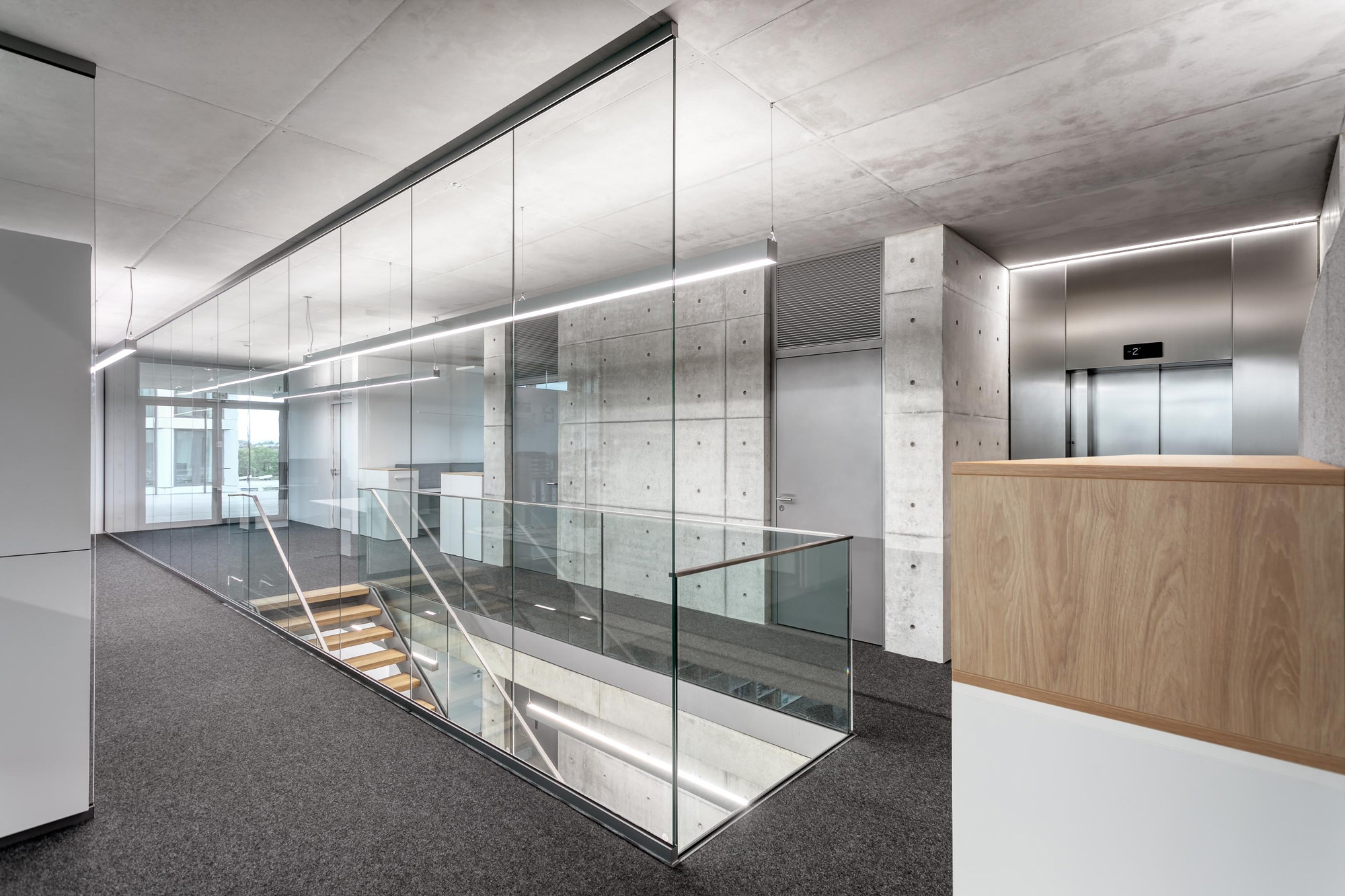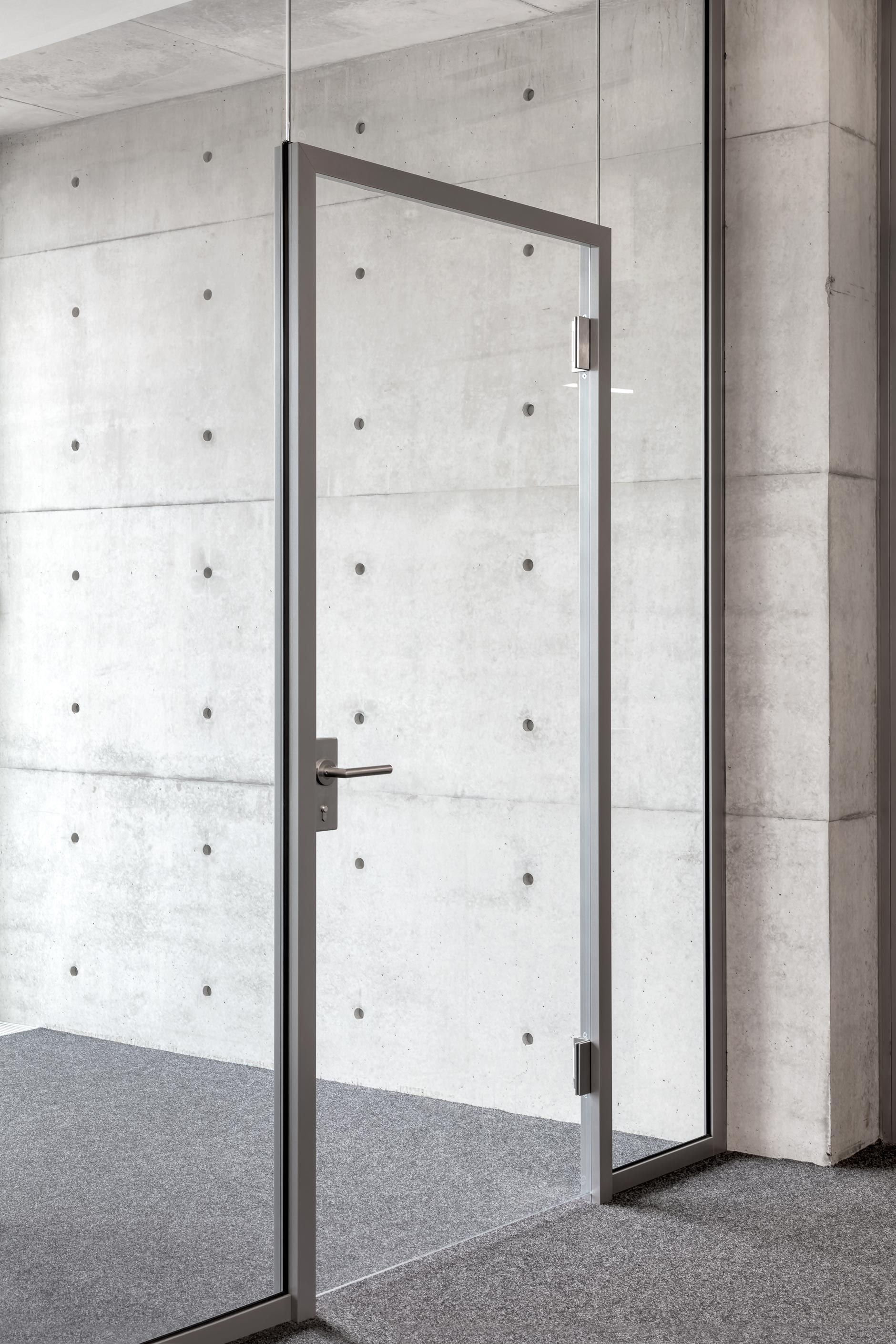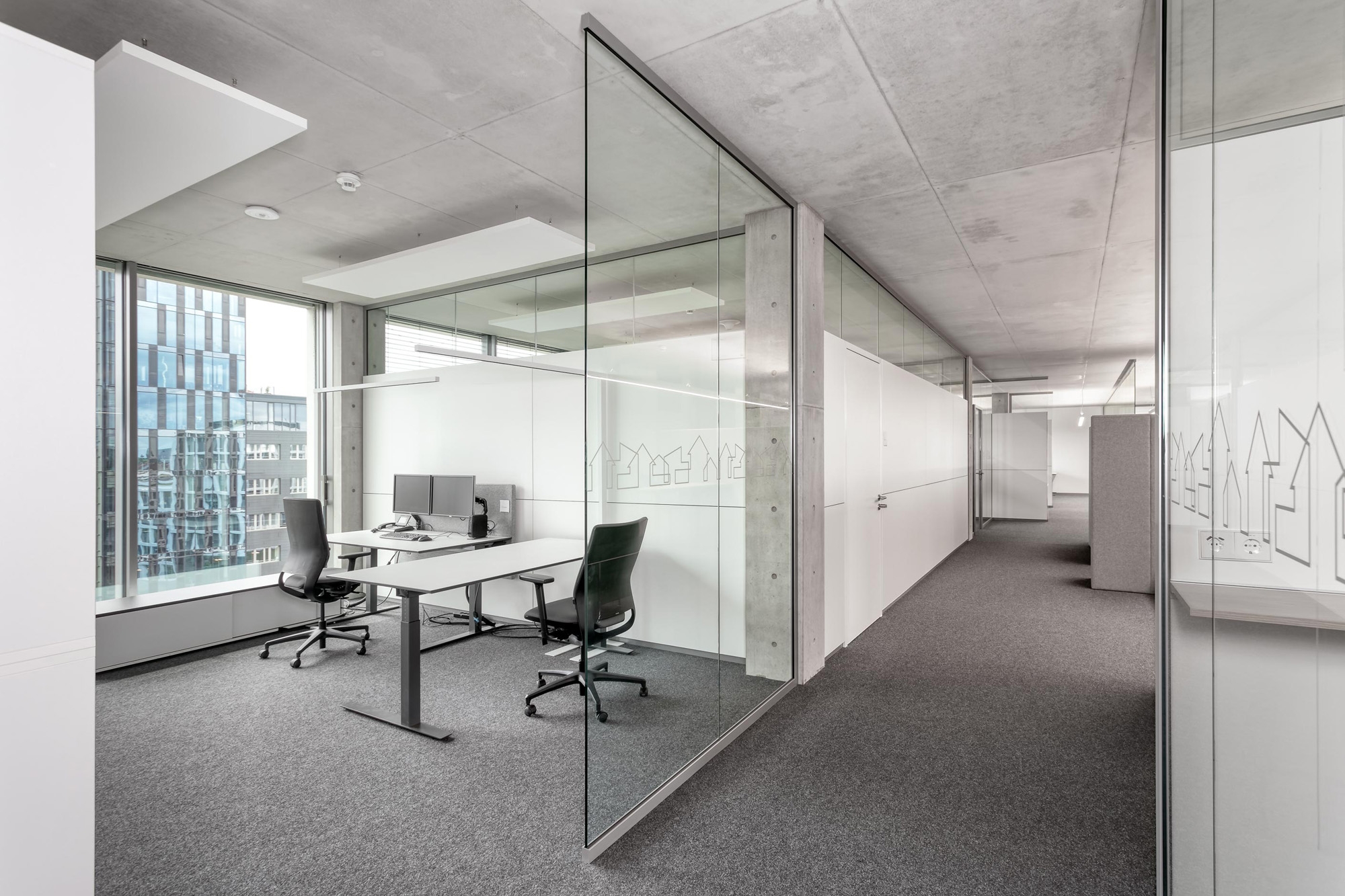 With the fecoplan all-glass construction it is possible to separate areas for concentrated work, co-creation, meeting and communication from the open office landscape and at the same time to show the high-quality exposed concrete ceilings throughout. For this purpose, the intermediate office walls are also designed as skylight walls without vertical upright profiles and with non-bearing wall shells. The panels are covered with magnetic laminate to enable construction plans to be hung up on them.
