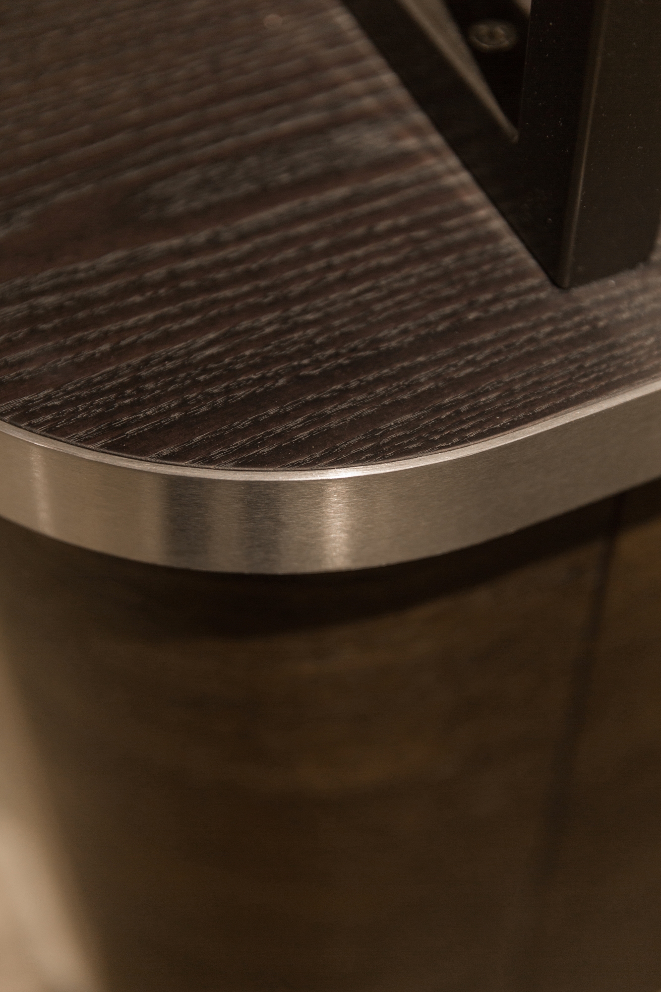 All the units and any new lighting had to be freestanding as the restrictions meant they could not be attached to the walls or ceiling. The bespoke new modular display units are made up of blackened steel structures, with oak units plus burnt larch tops and brushed brass detailing (shelf holders, handles and knobs). Rather than encasing the existing architecture as before, the units feature stainless steel mesh at the back, subtly referencing chain mail while helping to reveal and celebrate the original stone wall located behind. Backlit, the units create a glow around the products as well as highlighting the rough texture of the historic walls behind. They are also modular and can easily be adapted and adjusted.
